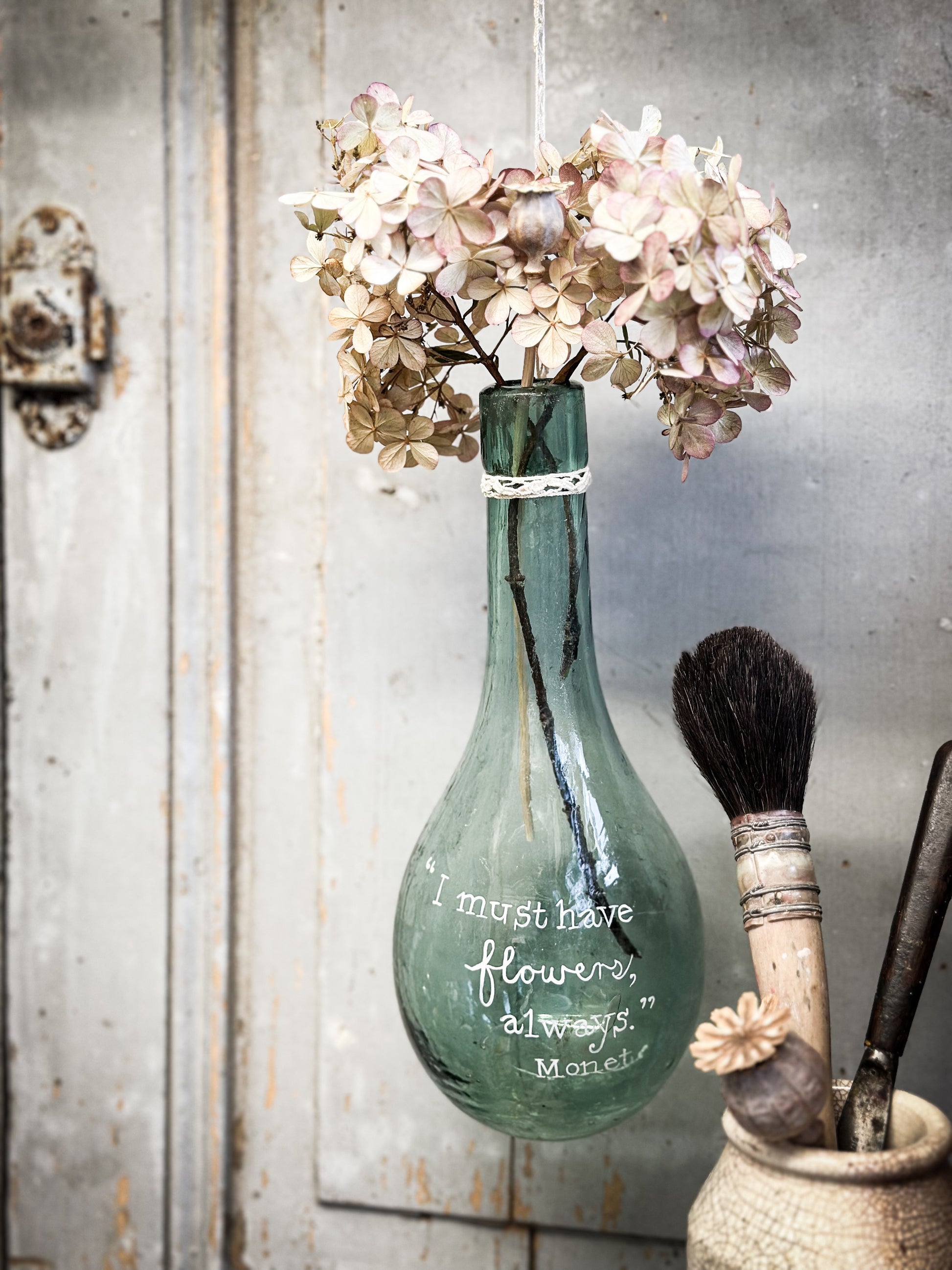 A beautiful antique hanging bulb bottle with a hand painted quote