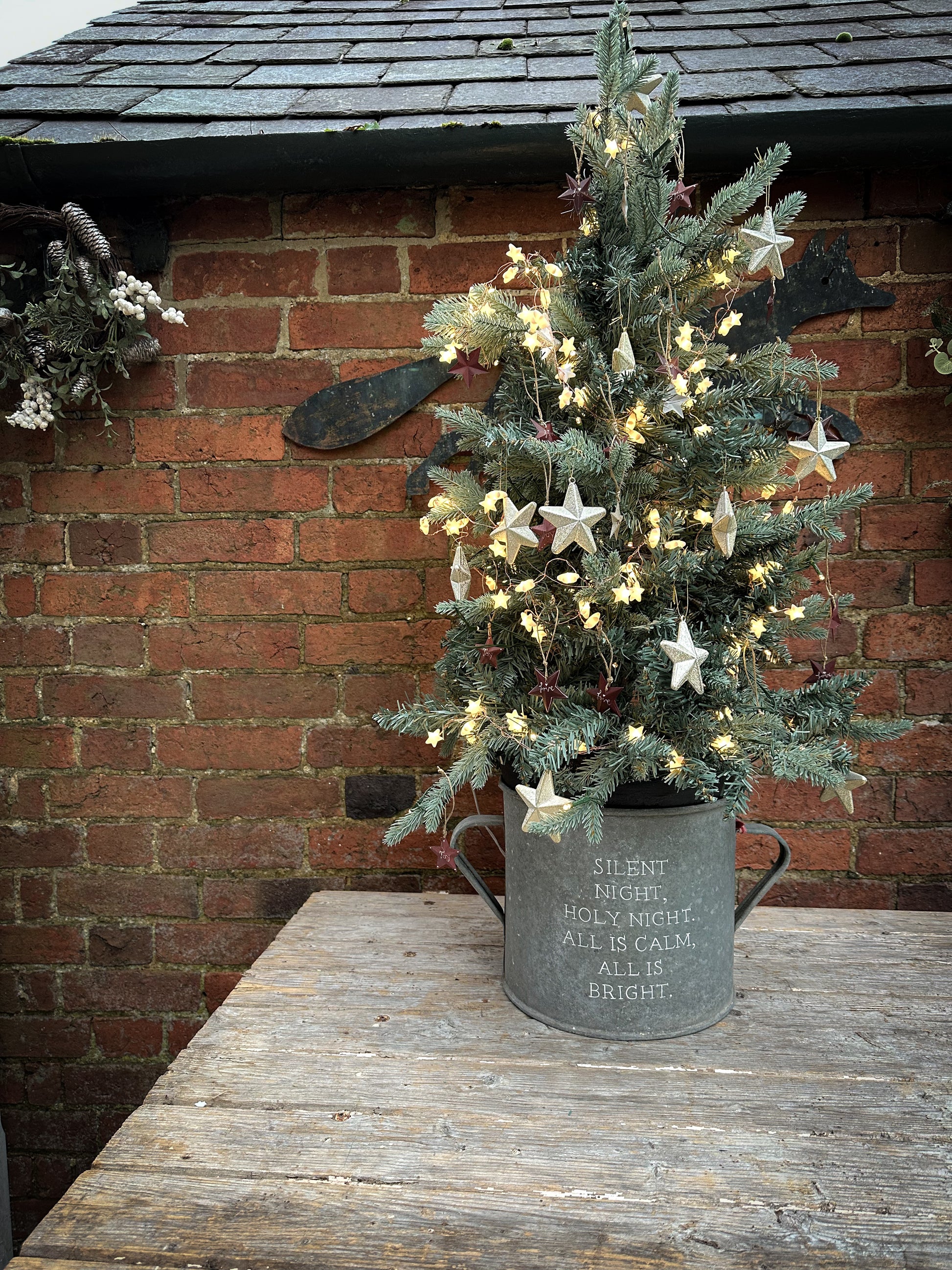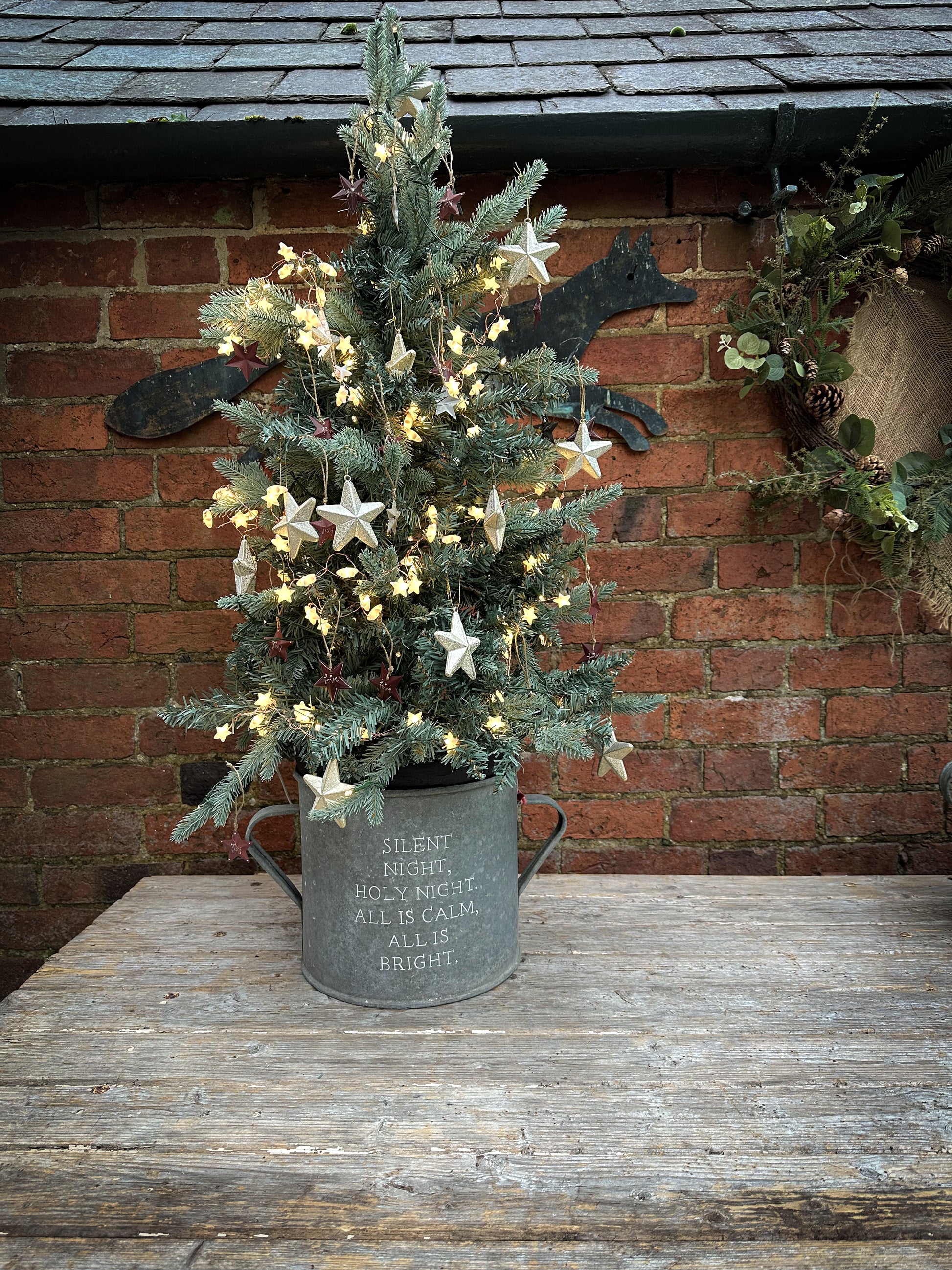 Use a potted tree or a cut tree wedged in with logs or bricks.