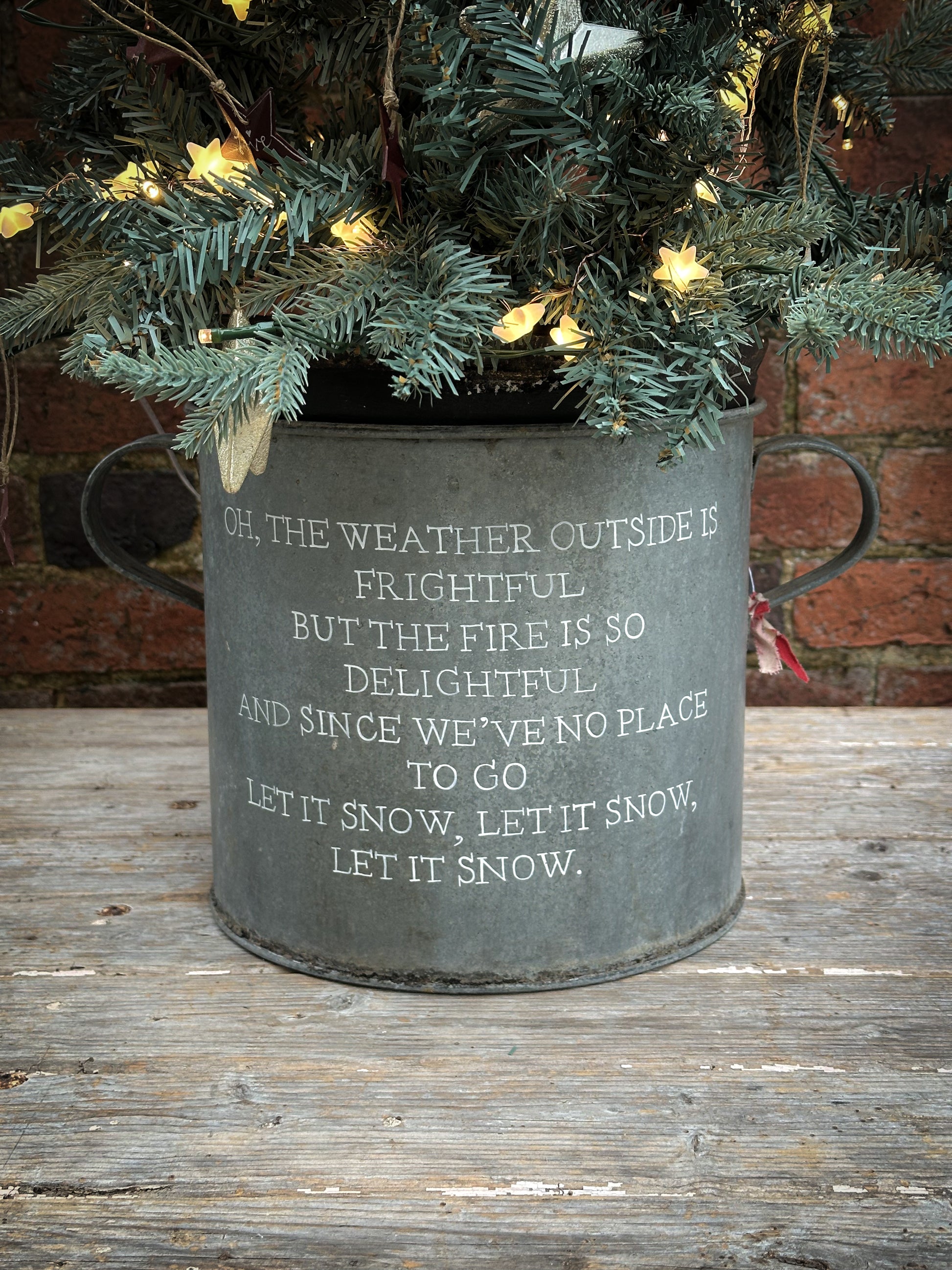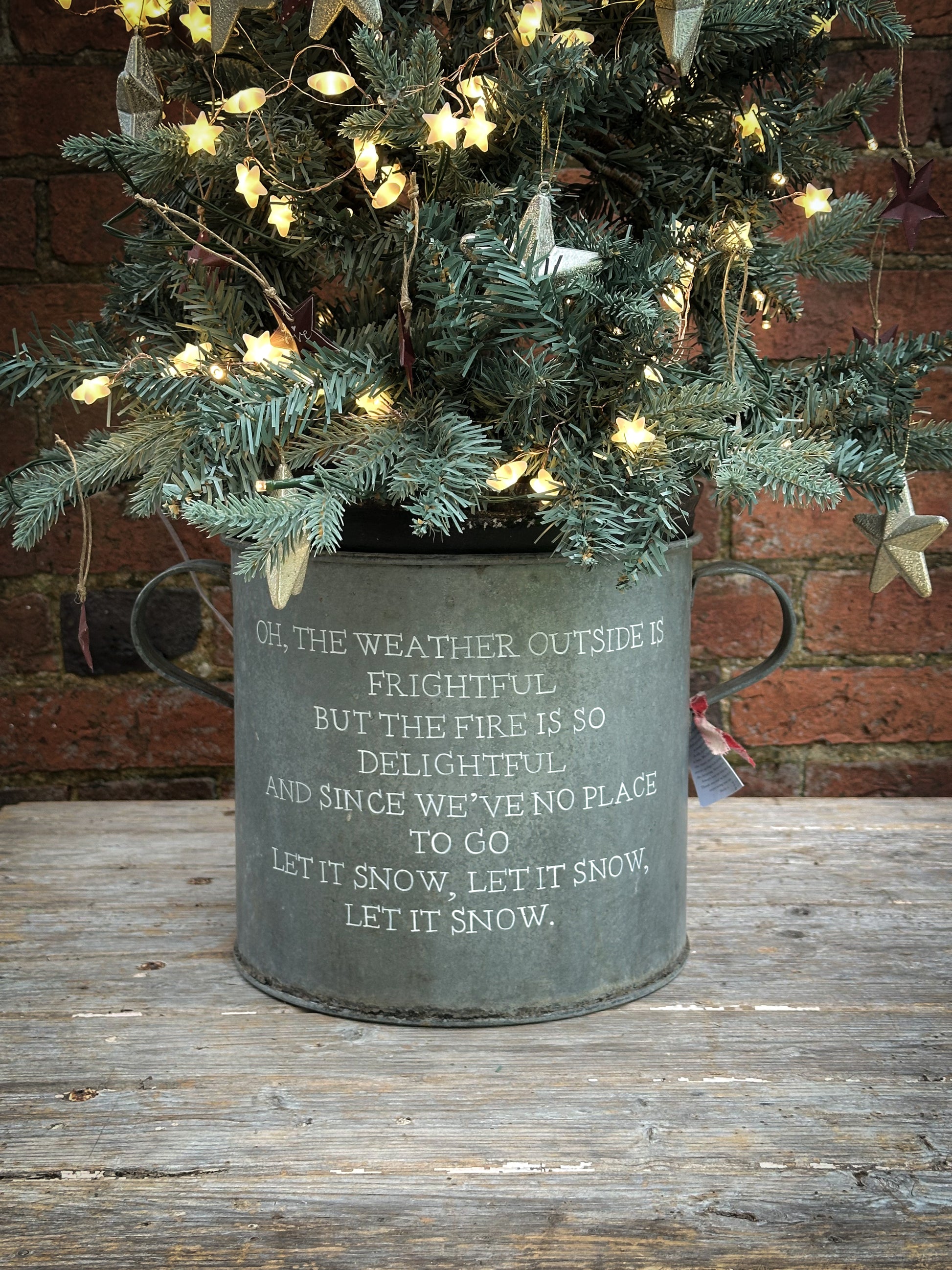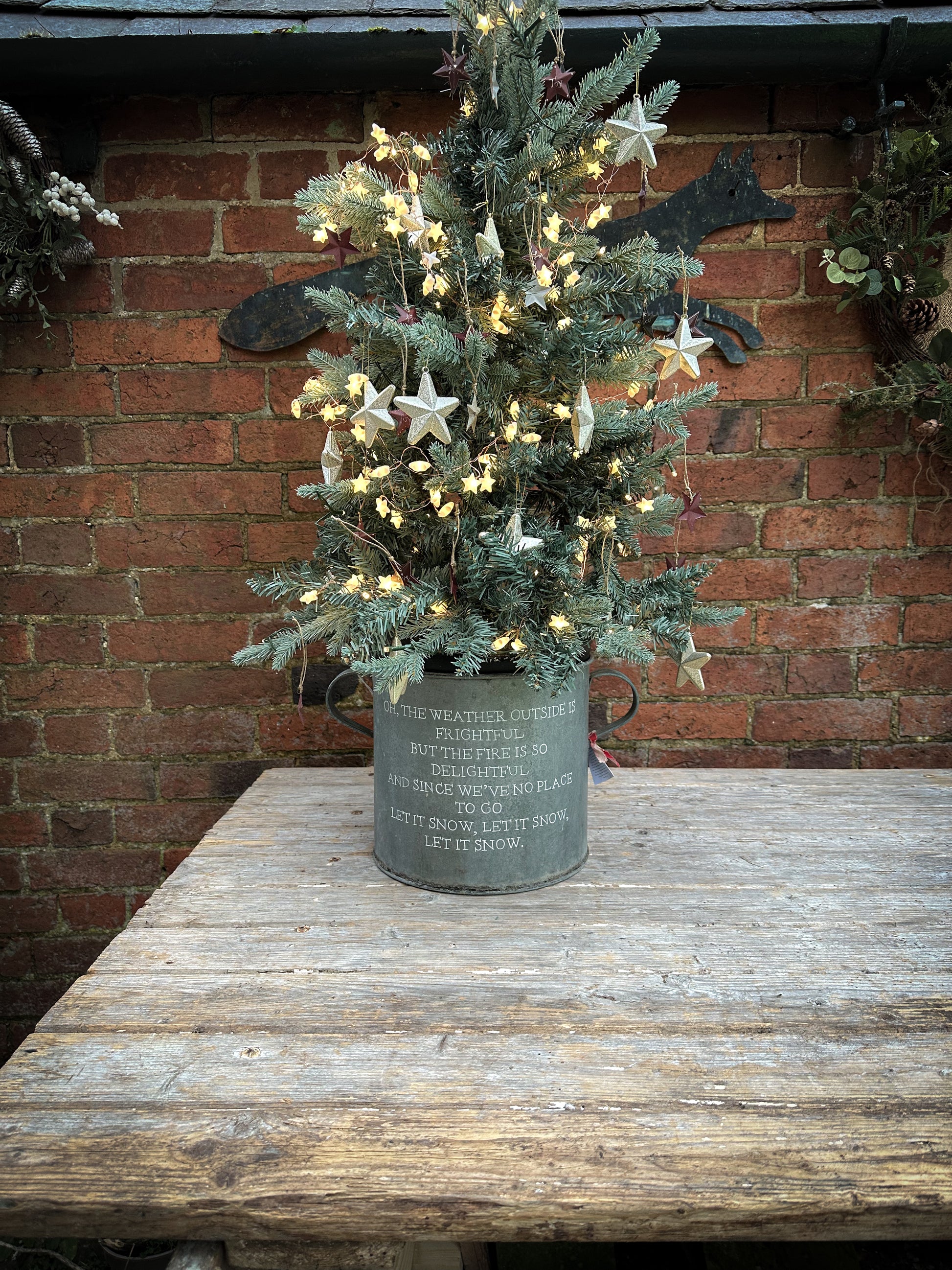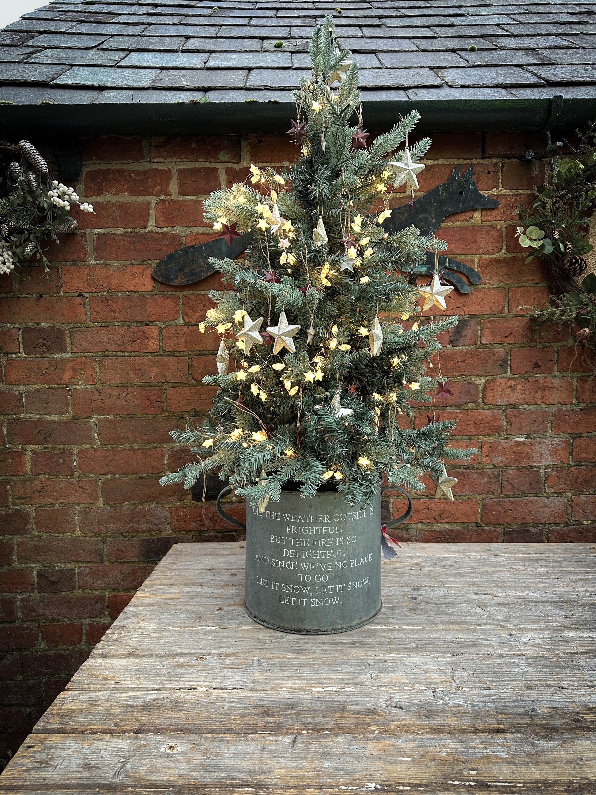 Use a potted tree or a cut tree wedged in with logs or bricks.