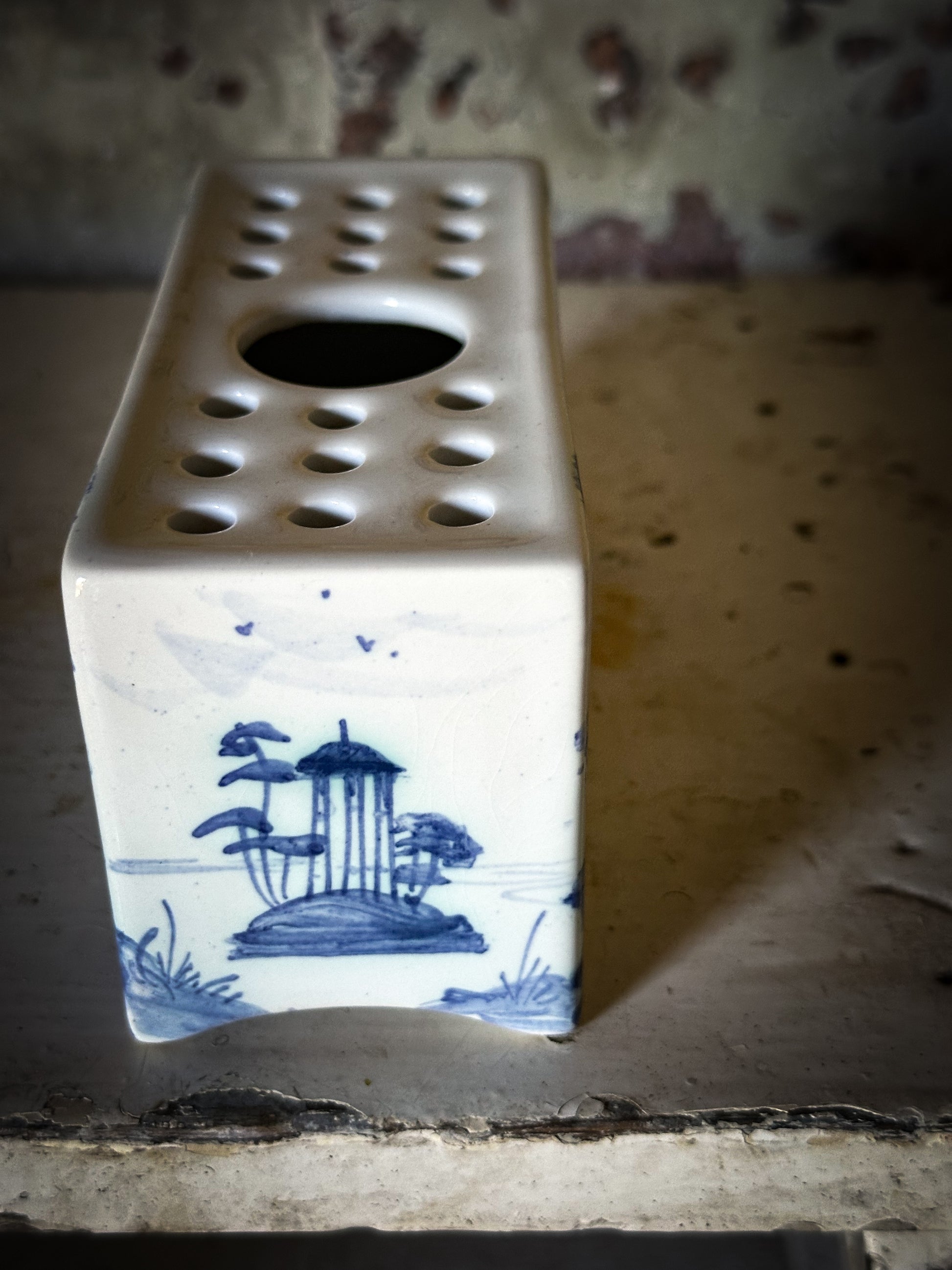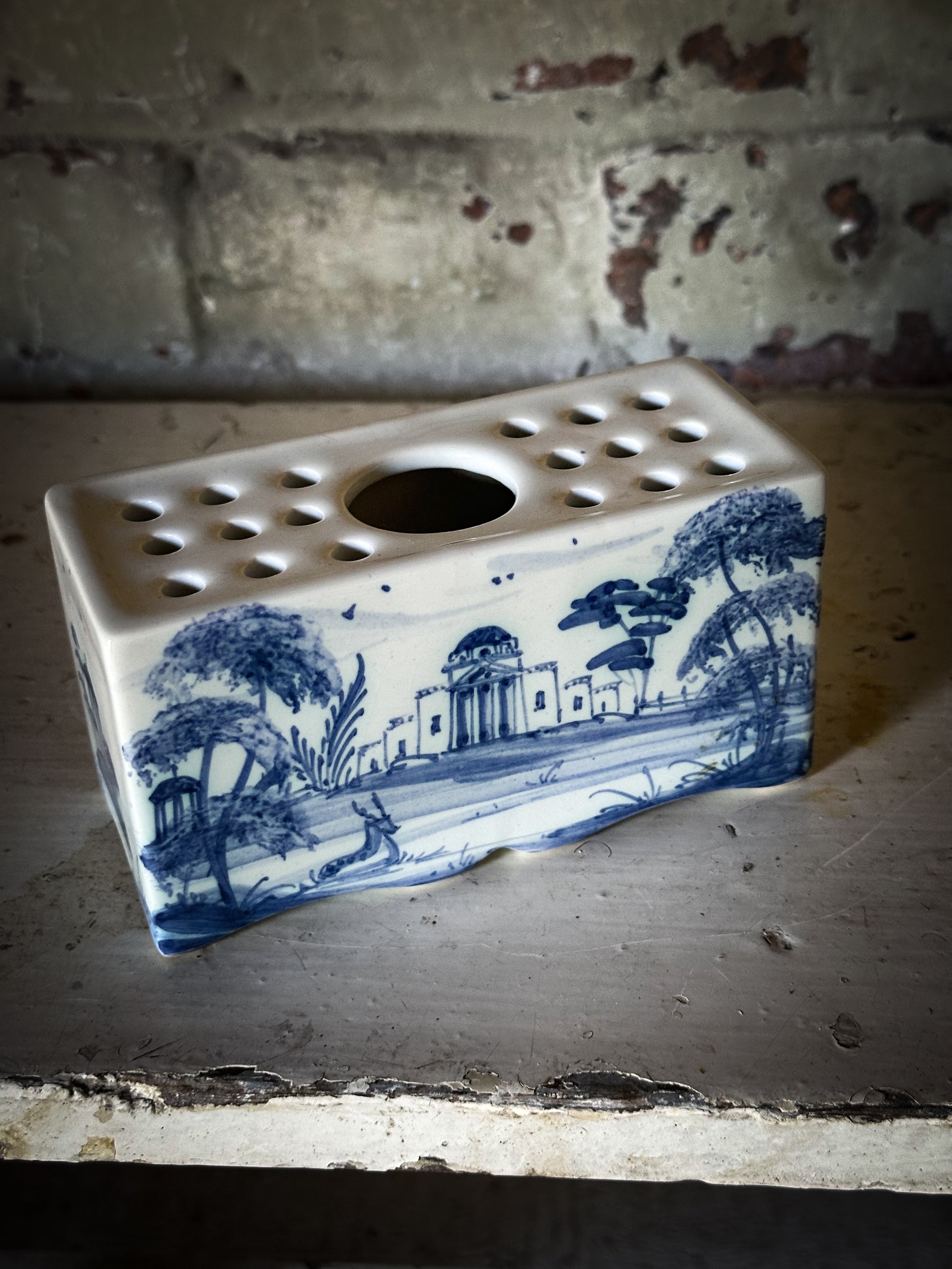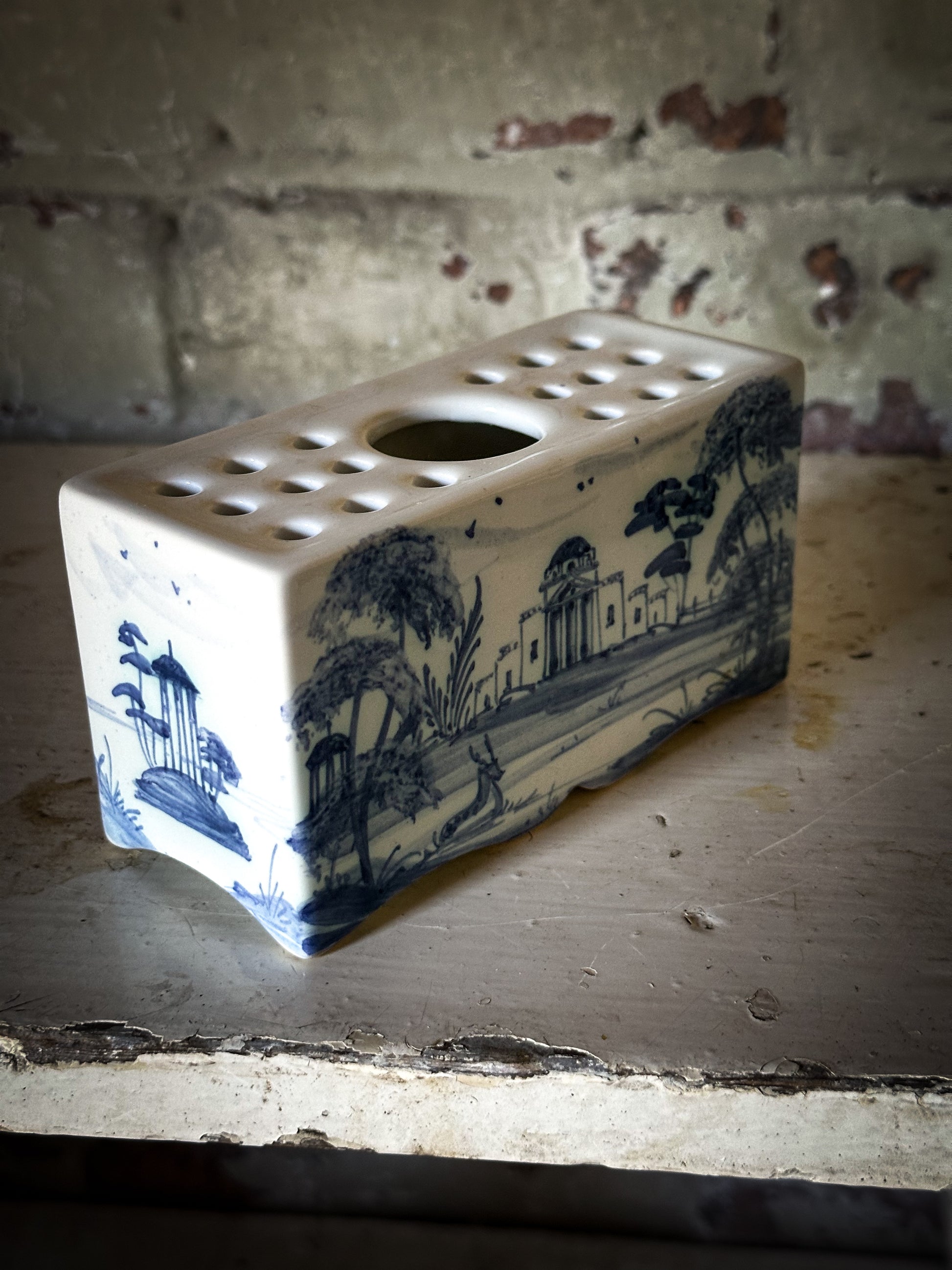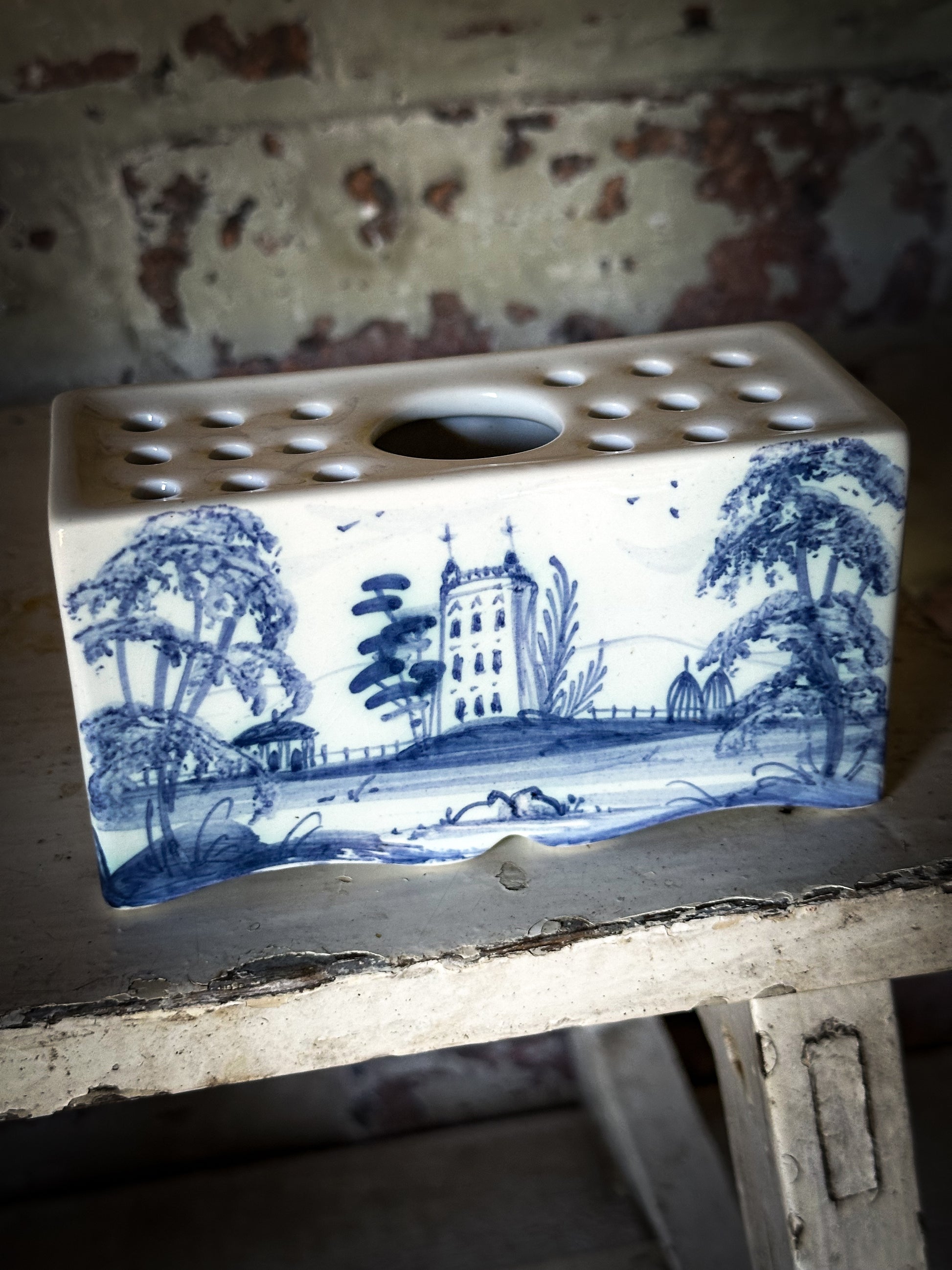 A beautiful Isis by Deborah seers Oxford, blue and white flower brick, tulipiere, flower frog, blue and white tin glaze vase