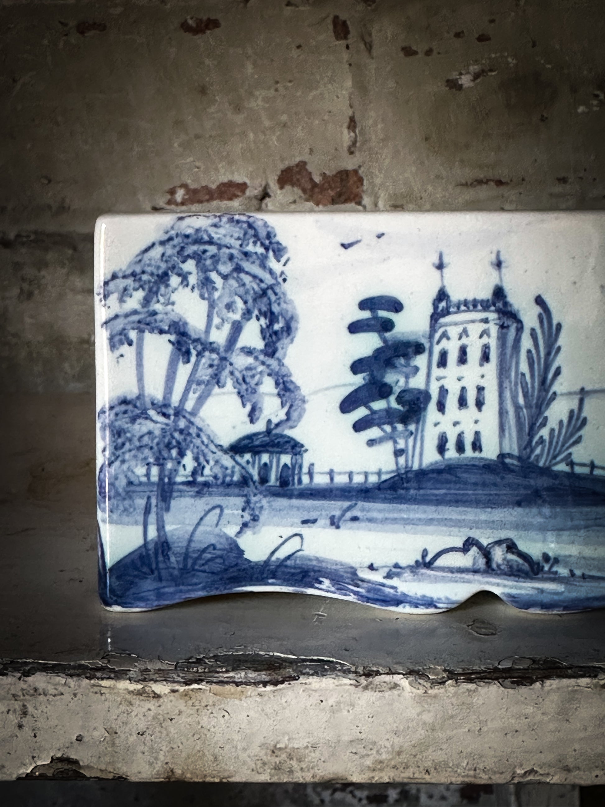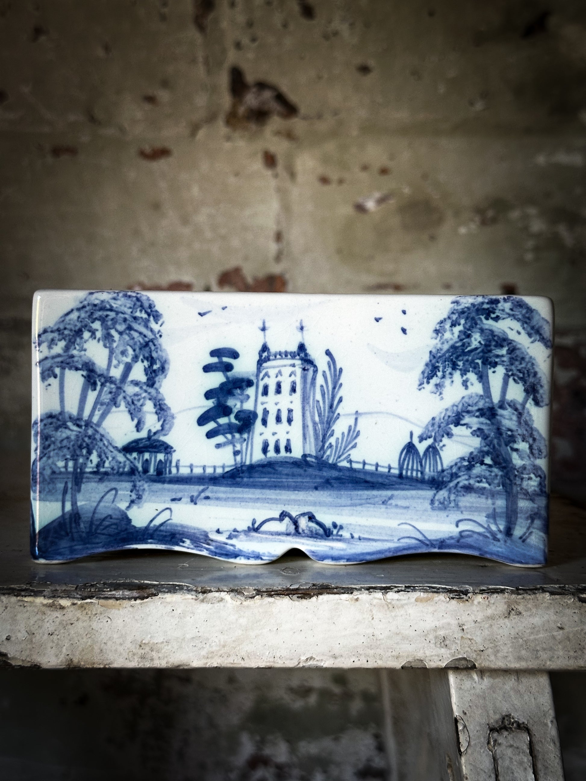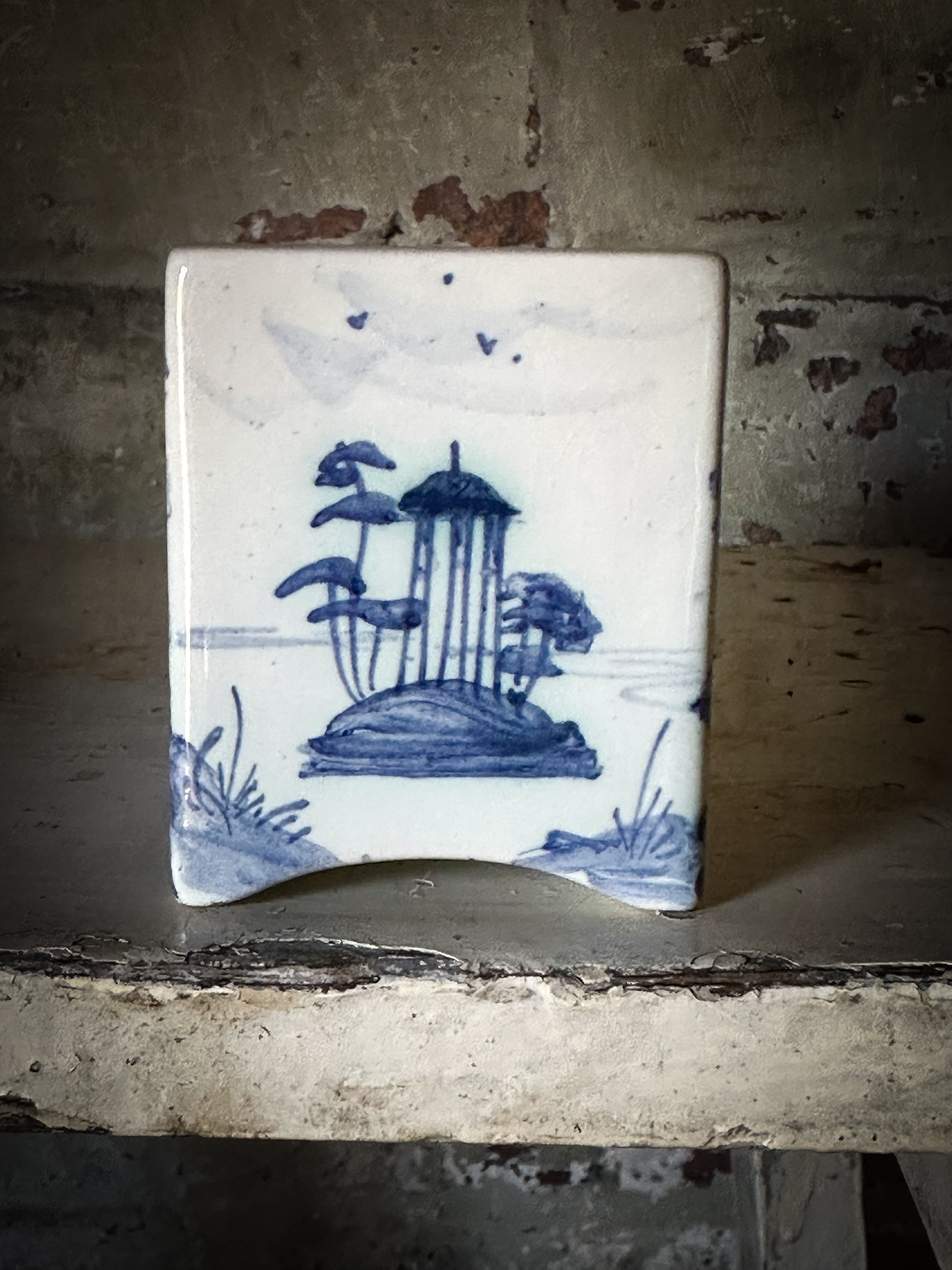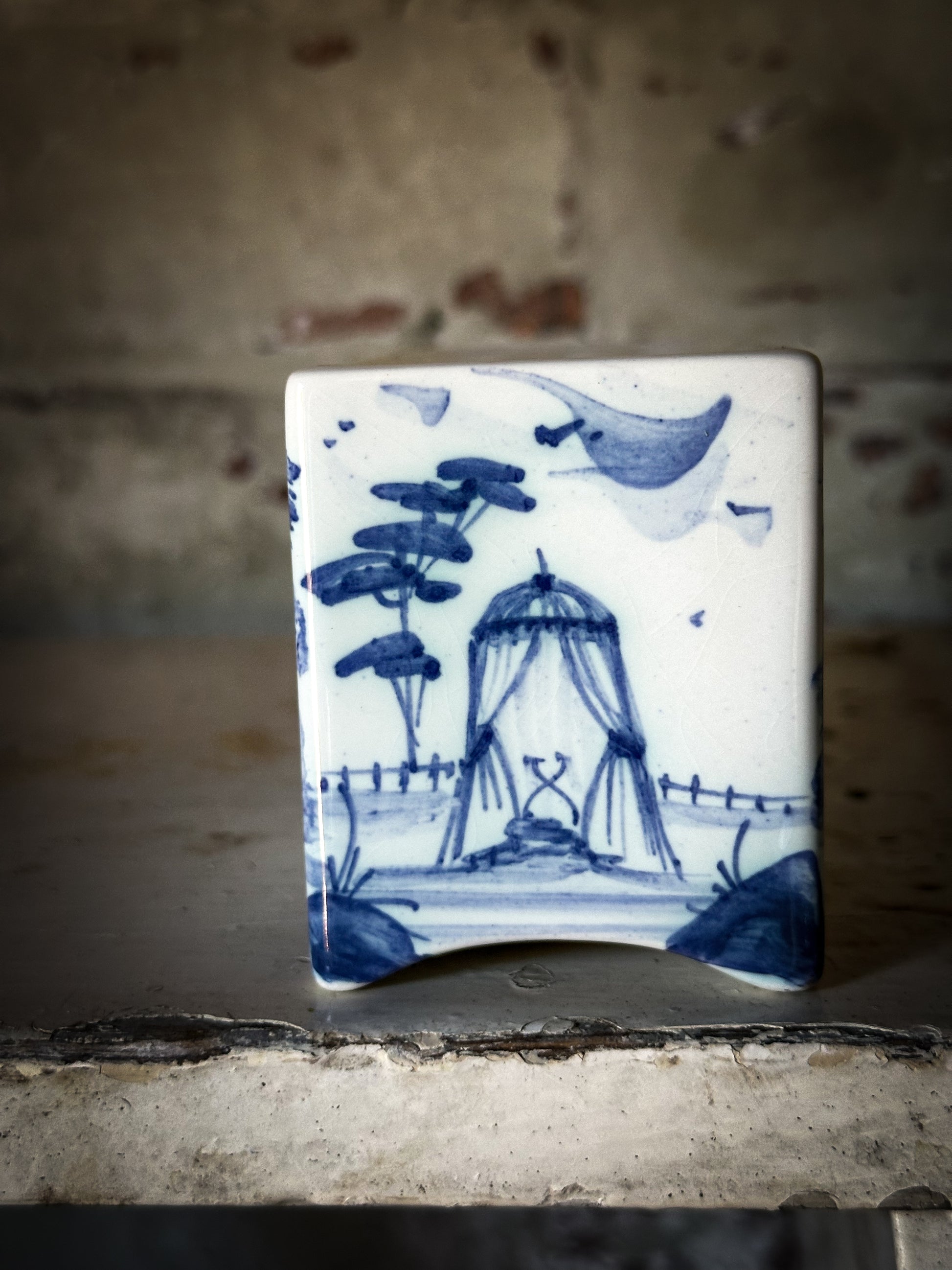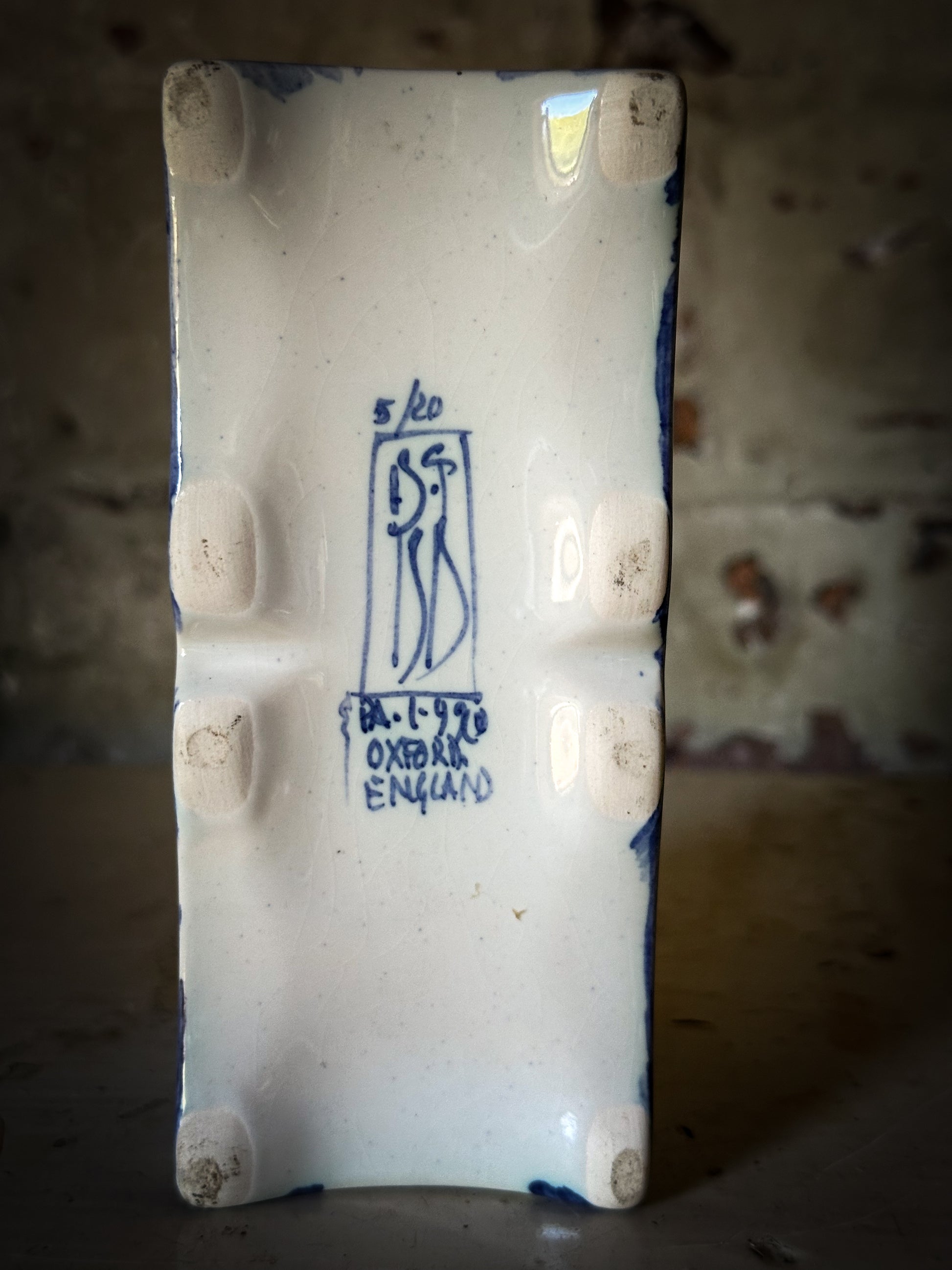 A beautiful Isis by Deborah Seers Oxford, blue and white flower brick, tulipiere, flower frog, blue and white tin glaze vase.