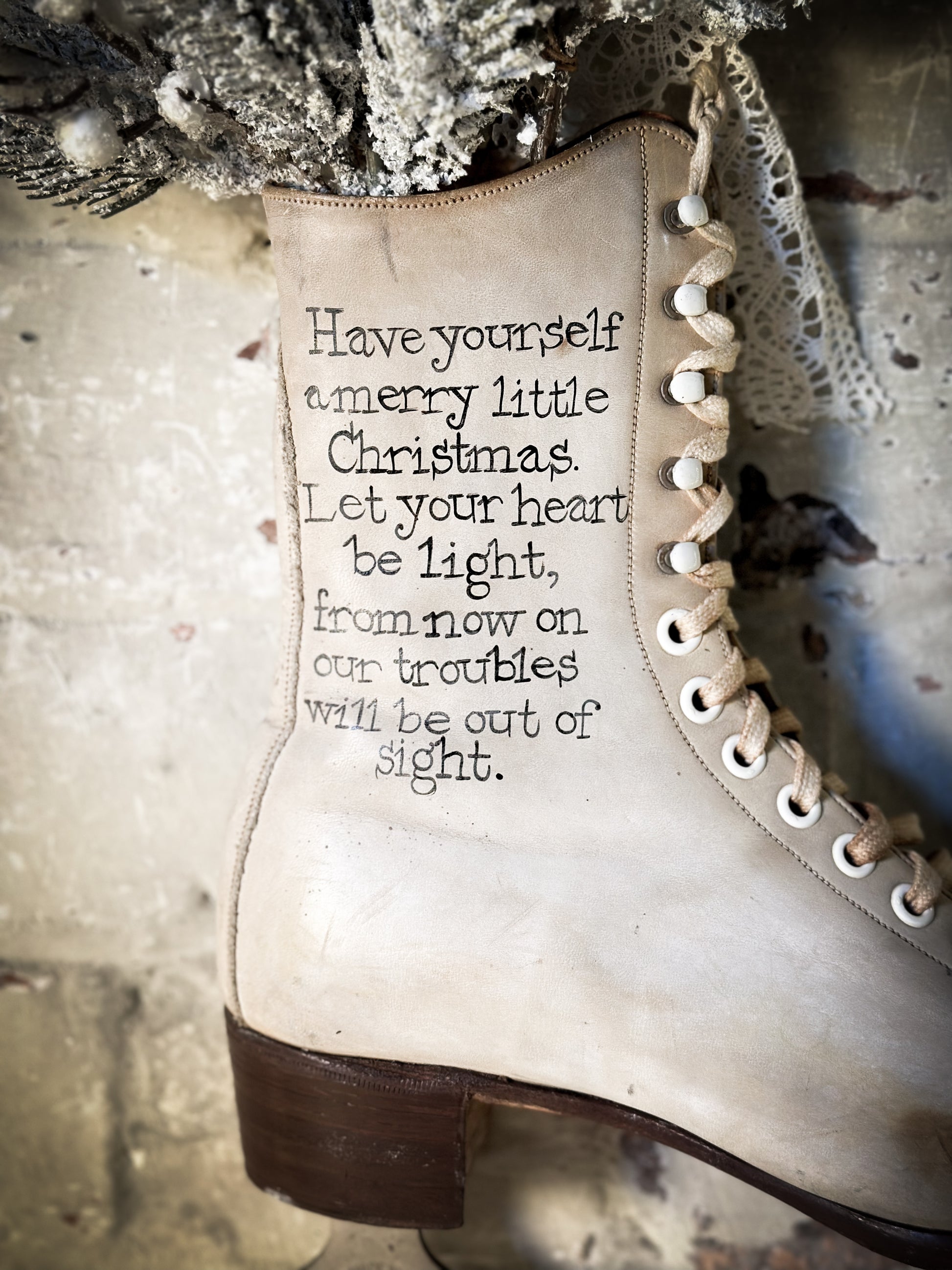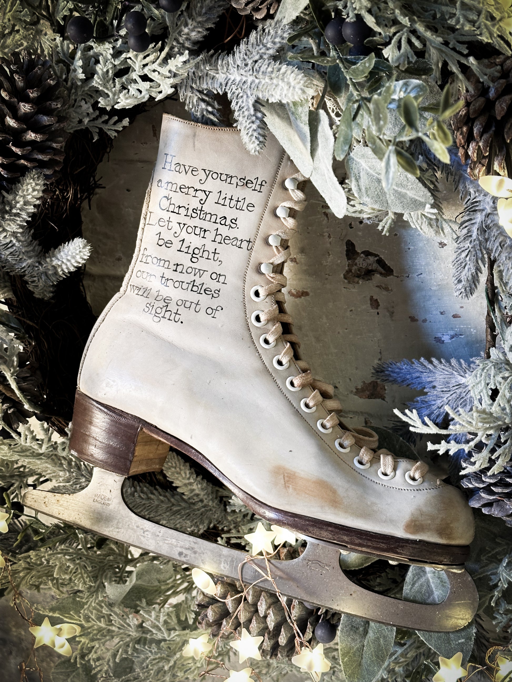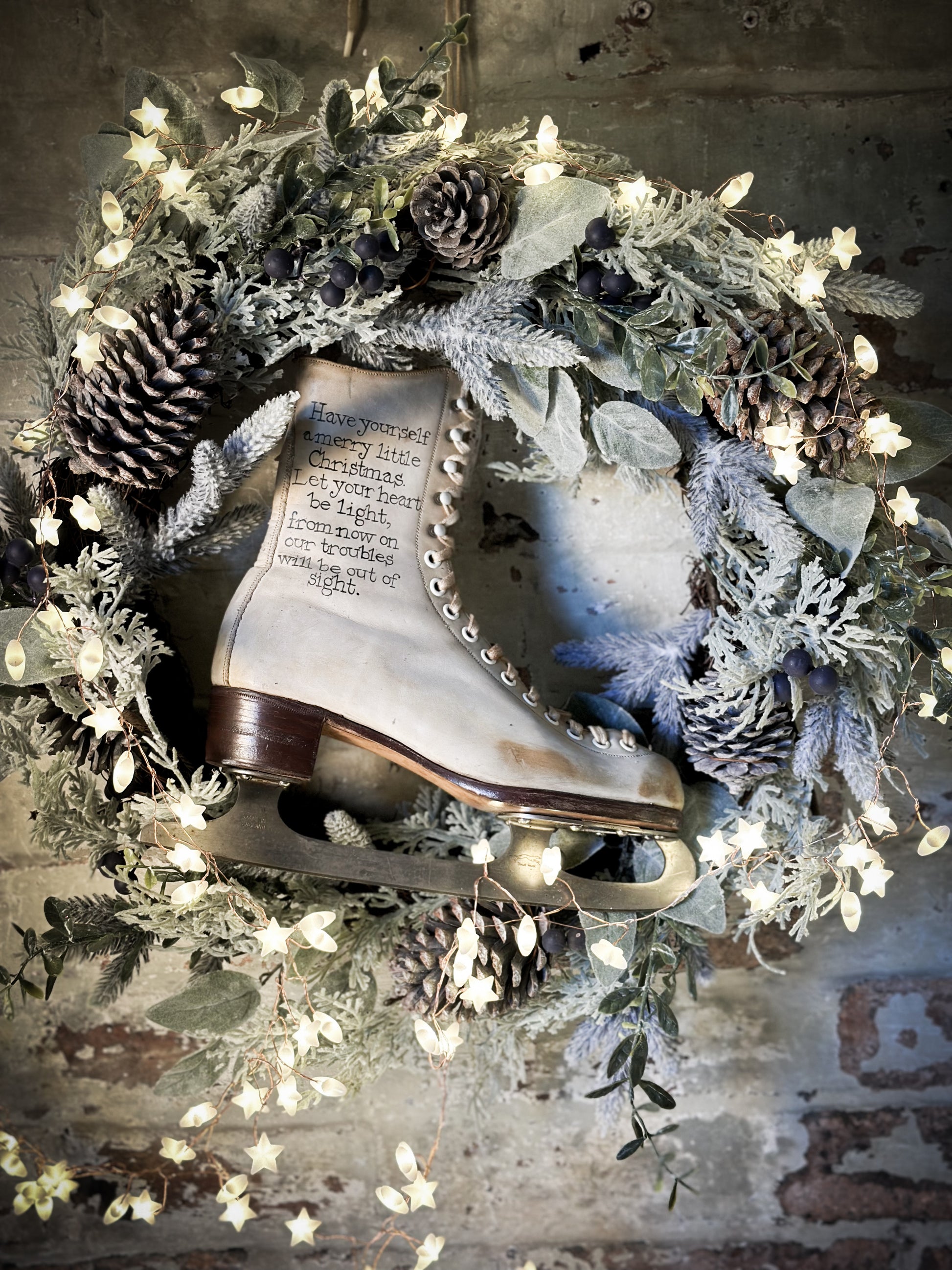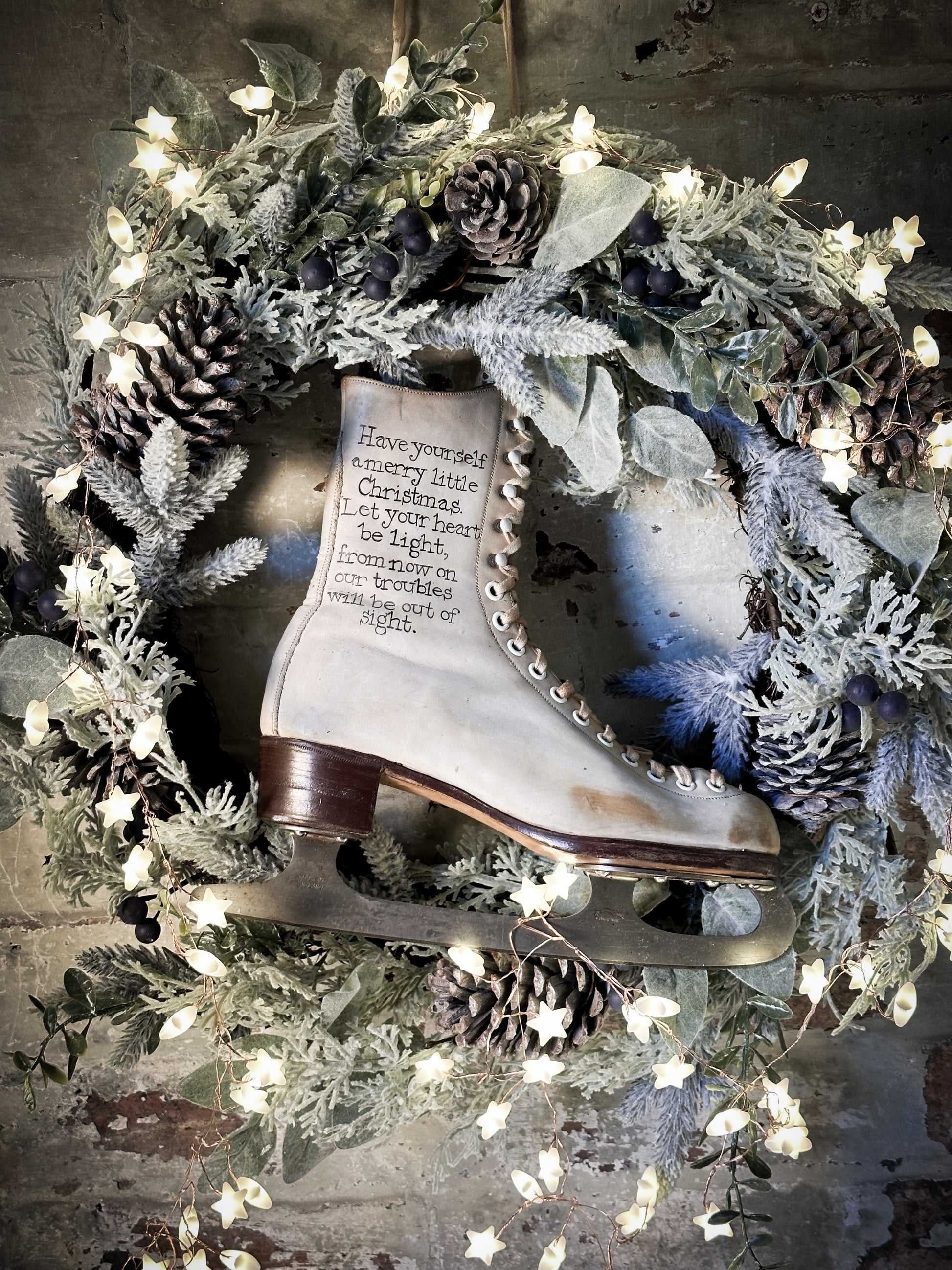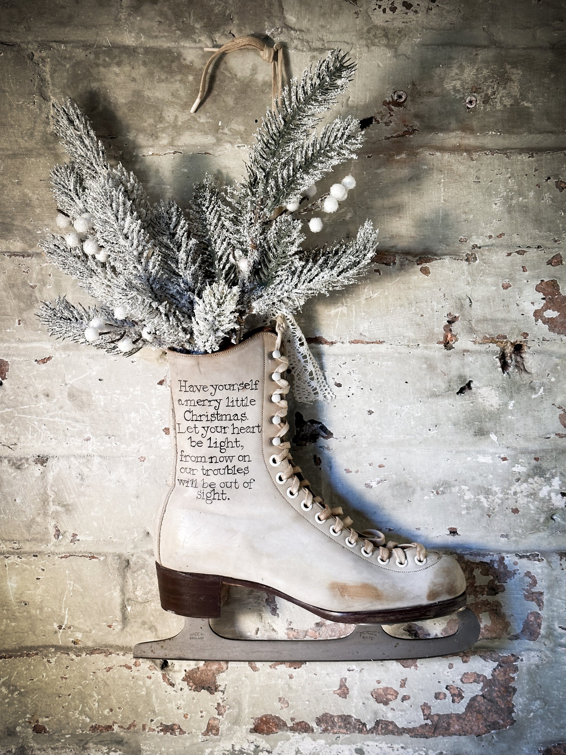 This beautiful old weathered and worn leather ice skate makes a wonderful holder for Christmas greenery. Just pop a jam jar inside to hold the water and foliage.