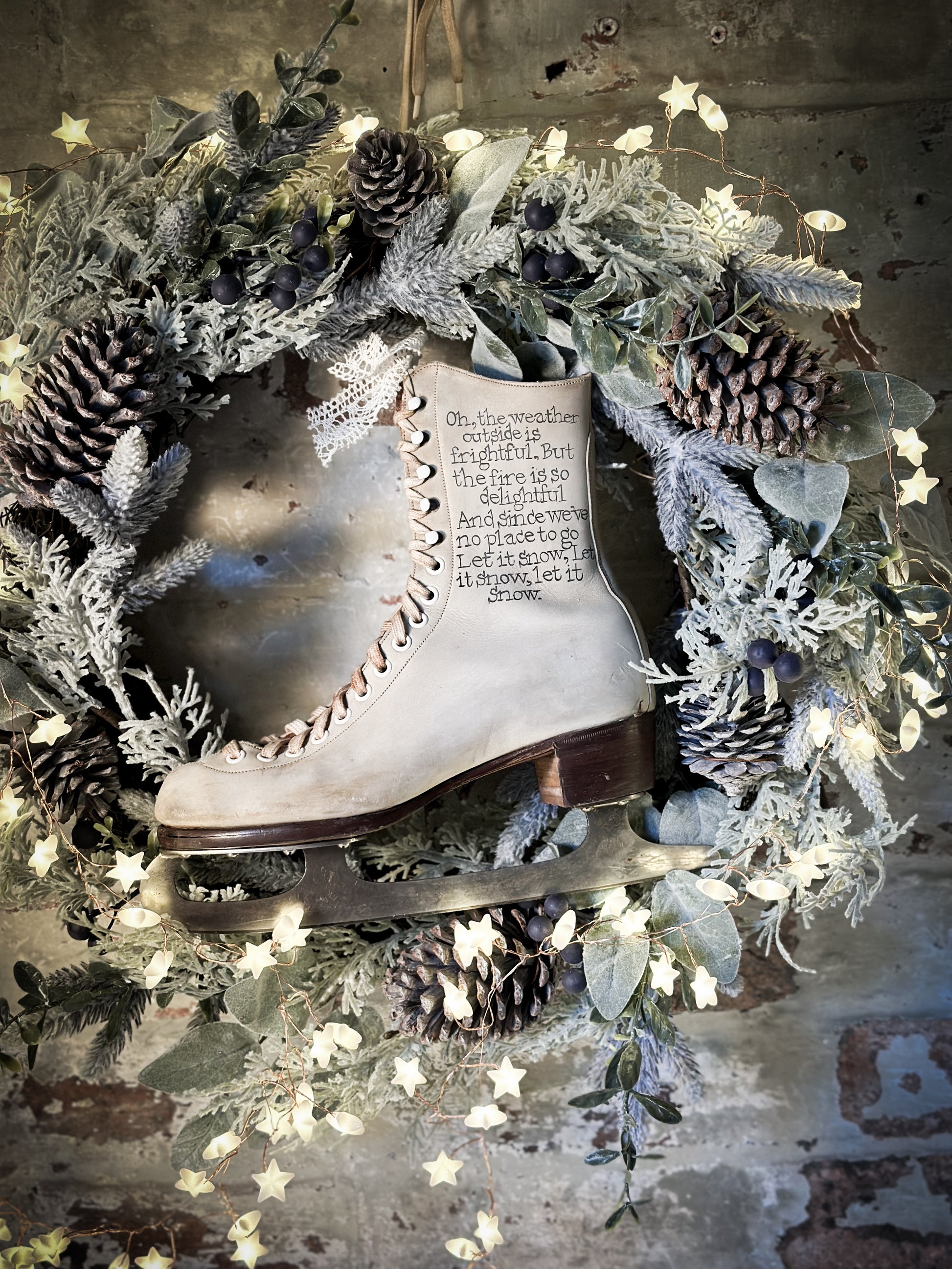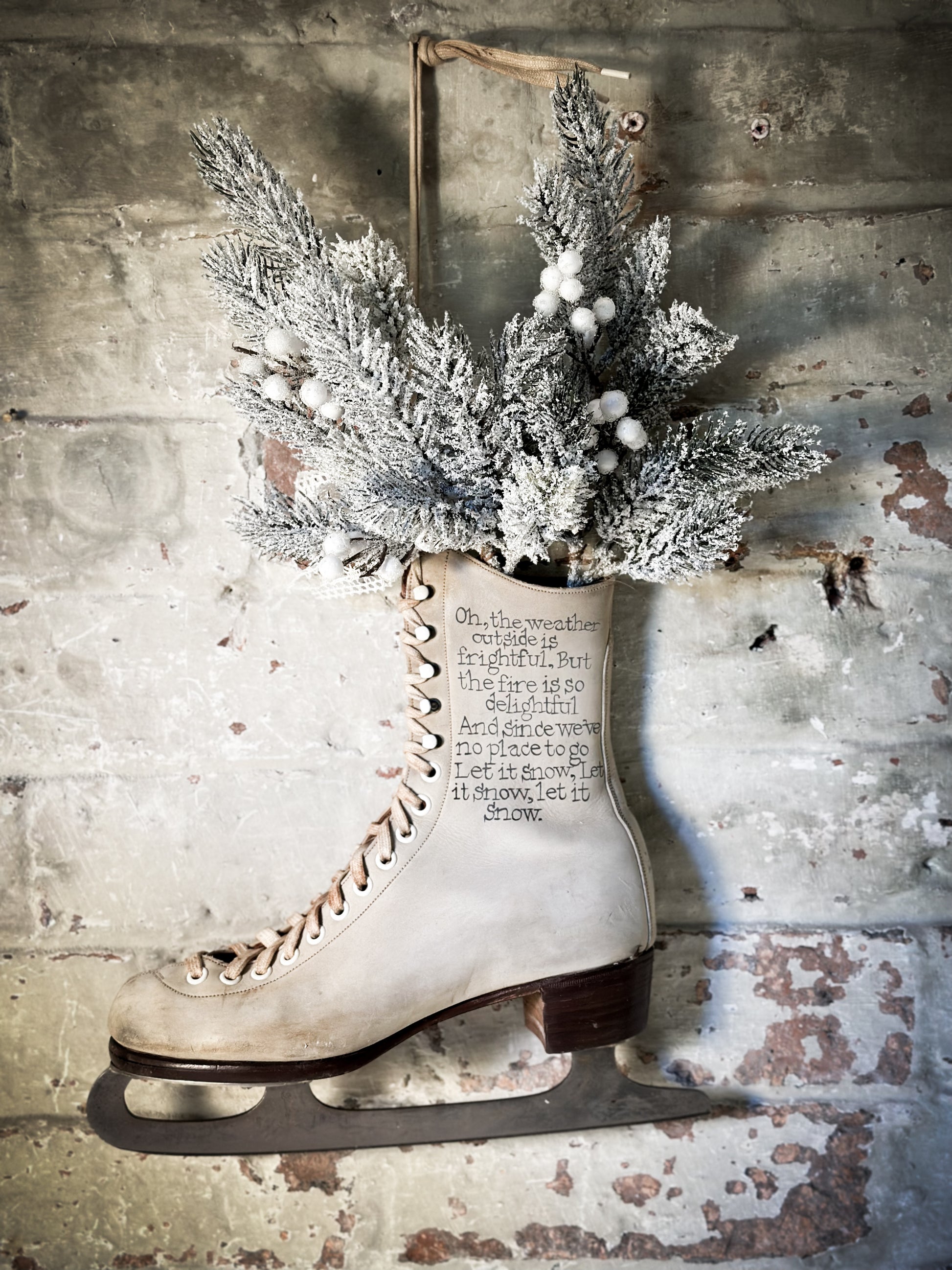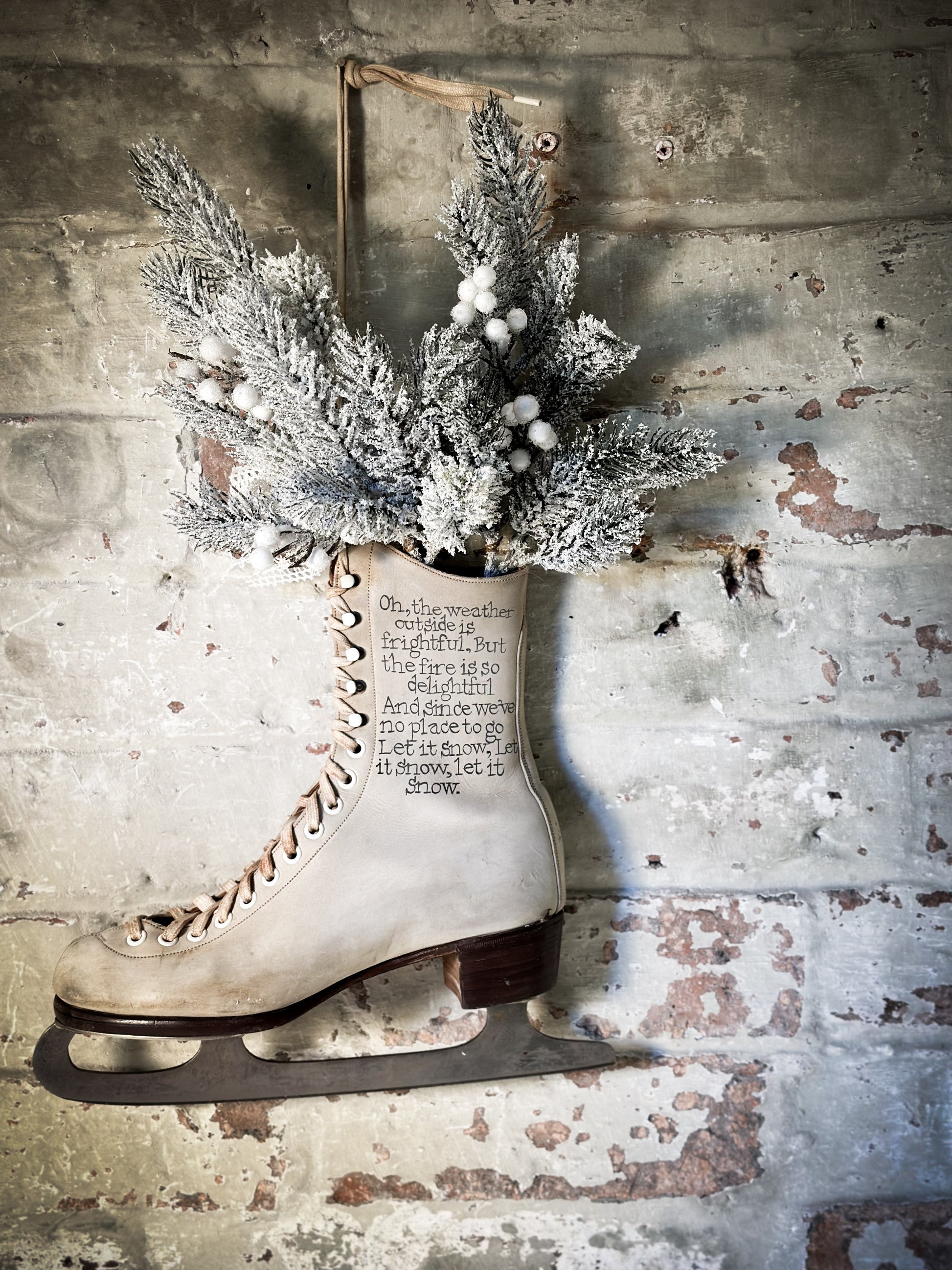This beautiful old weathered and worn leather ice skate makes a wonderful holder for Christmas greenery. Just pop a jam jar inside to hold the water and foliage.