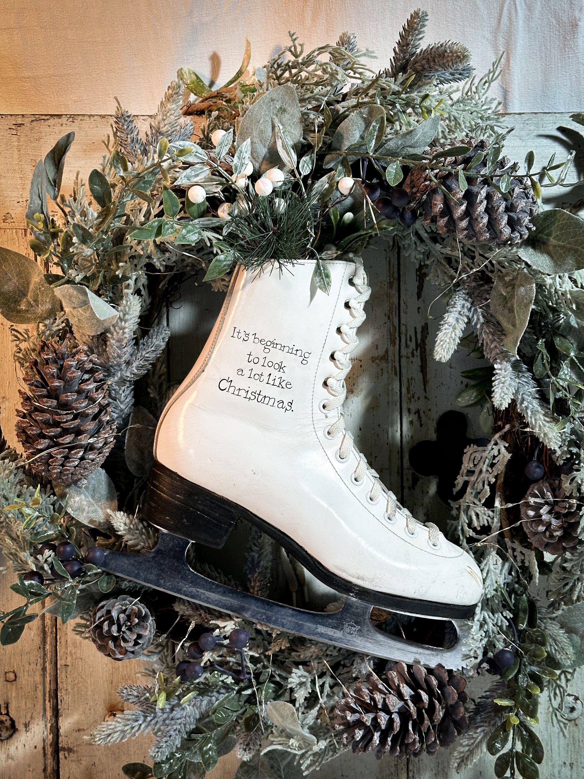 This beautiful old weathered and worn leather ice skate makes a wonderful holder for Christmas greenery. Just pop a jam jar inside to hold the water and foliage.