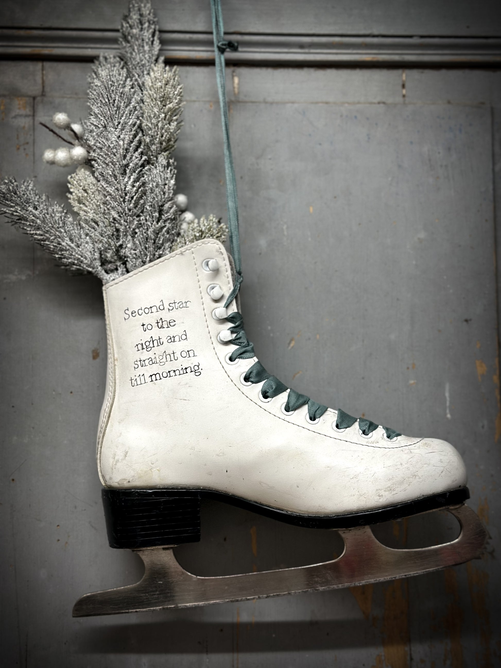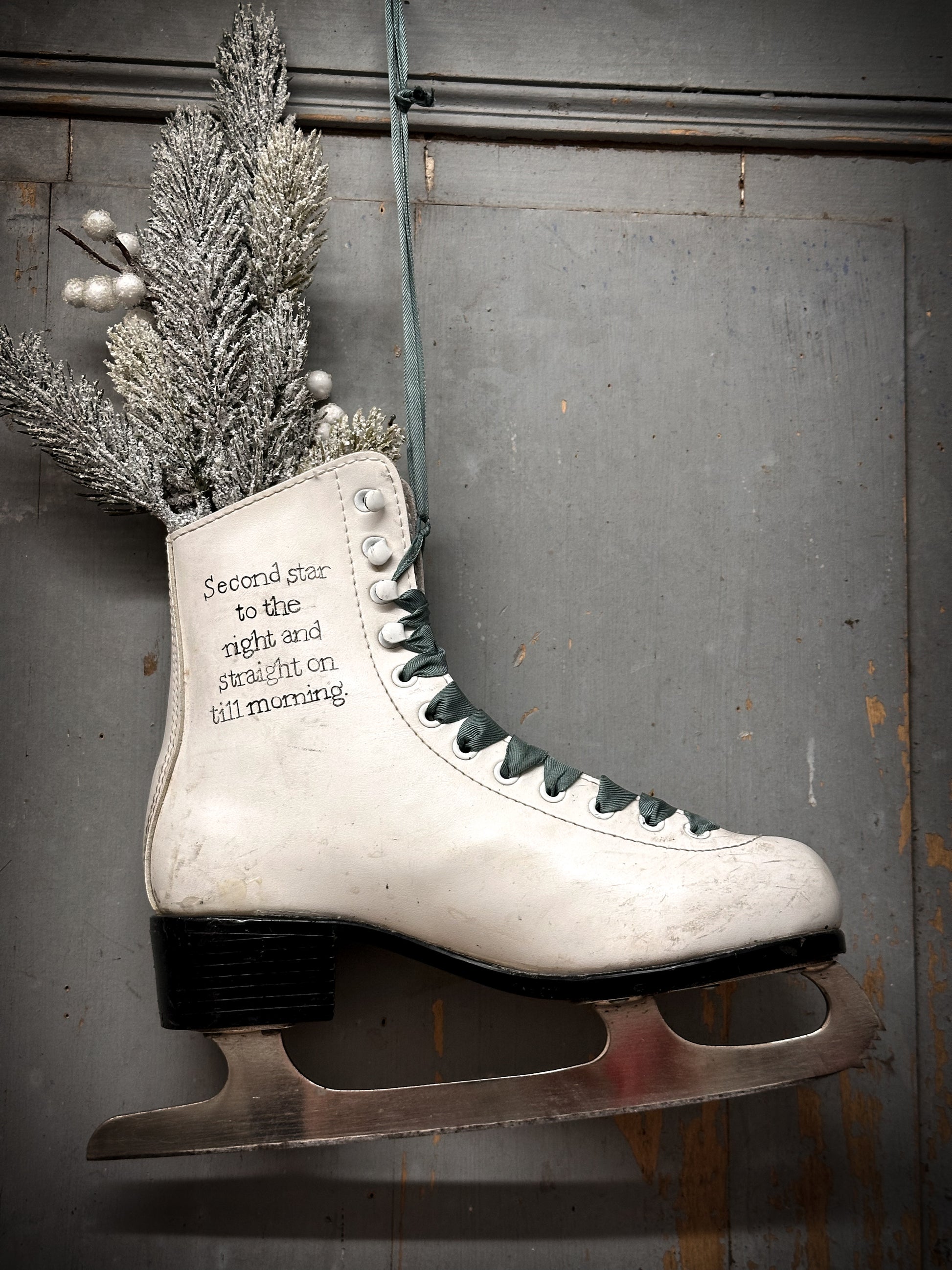This beautiful old weathered and worn leather ice skate makes a wonderful holder for Christmas greenery. Just pop a jam jar inside to hold the water and foliage.