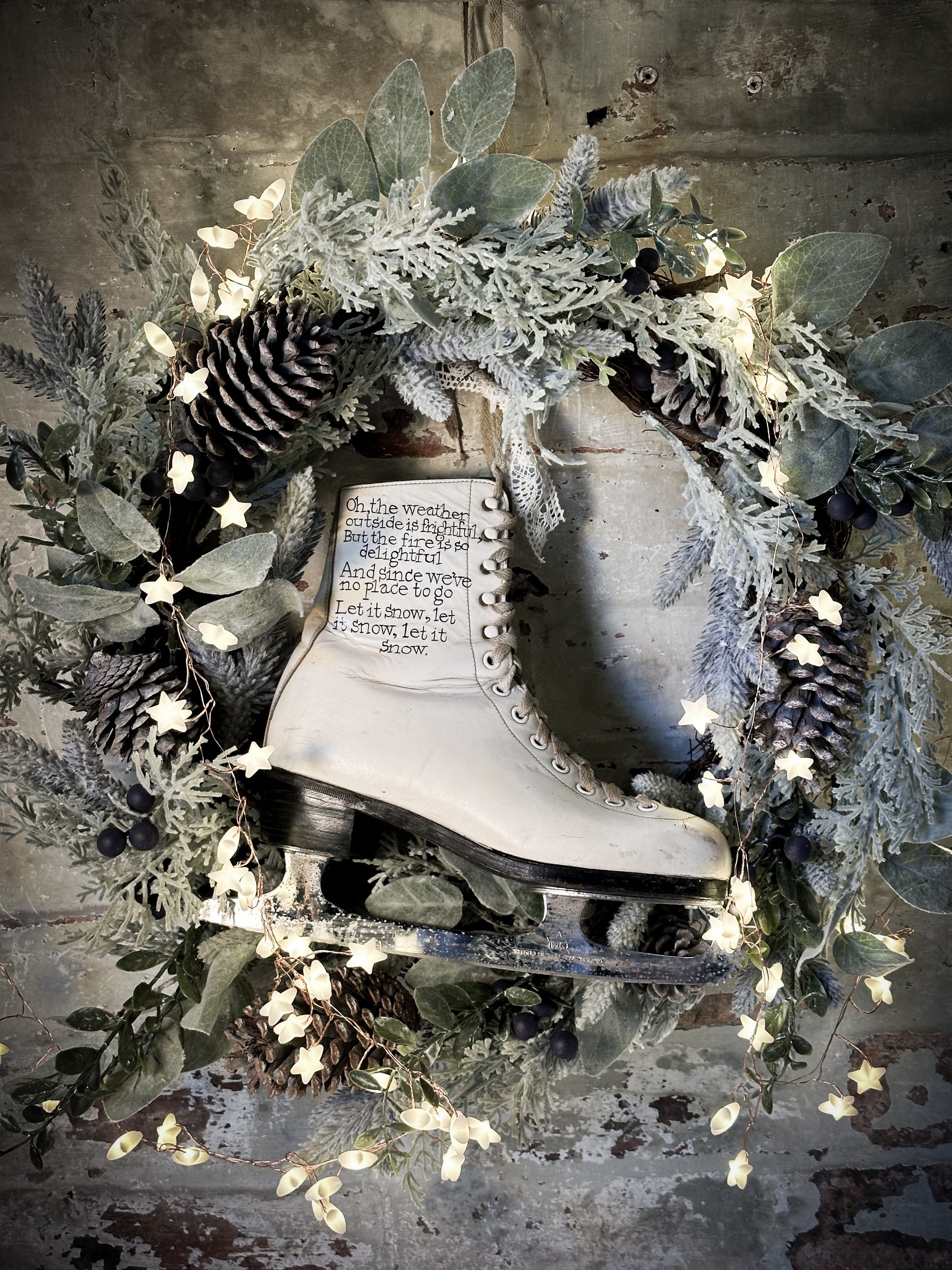 This beautiful old weathered and worn leather ice skate makes a wonderful holder for Christmas greenery. Just pop a jam jar inside to hold the water and foliage.