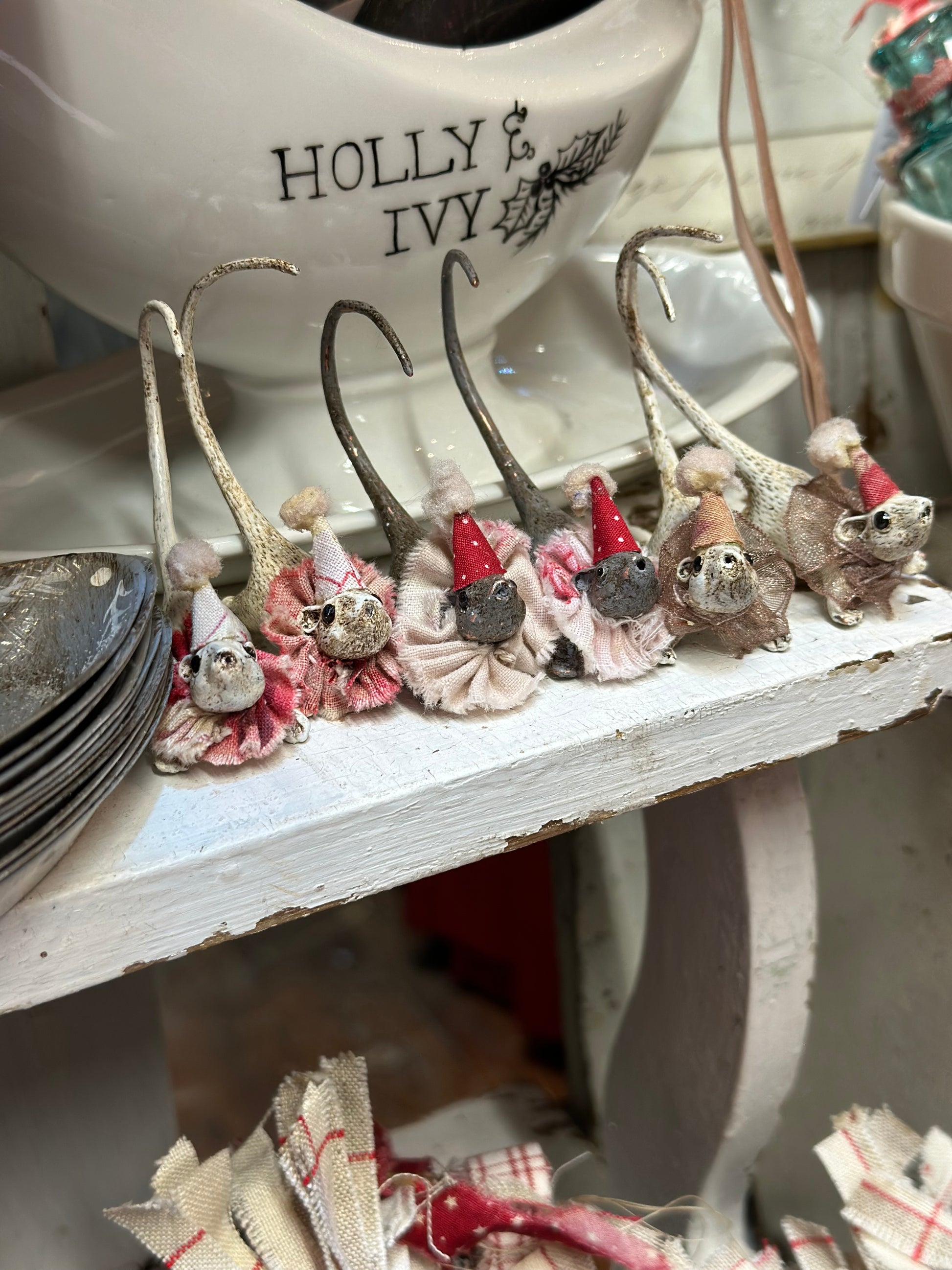 A cold painted brass “night before Christmas mouse” with a fabric ruffle and Christmas hat