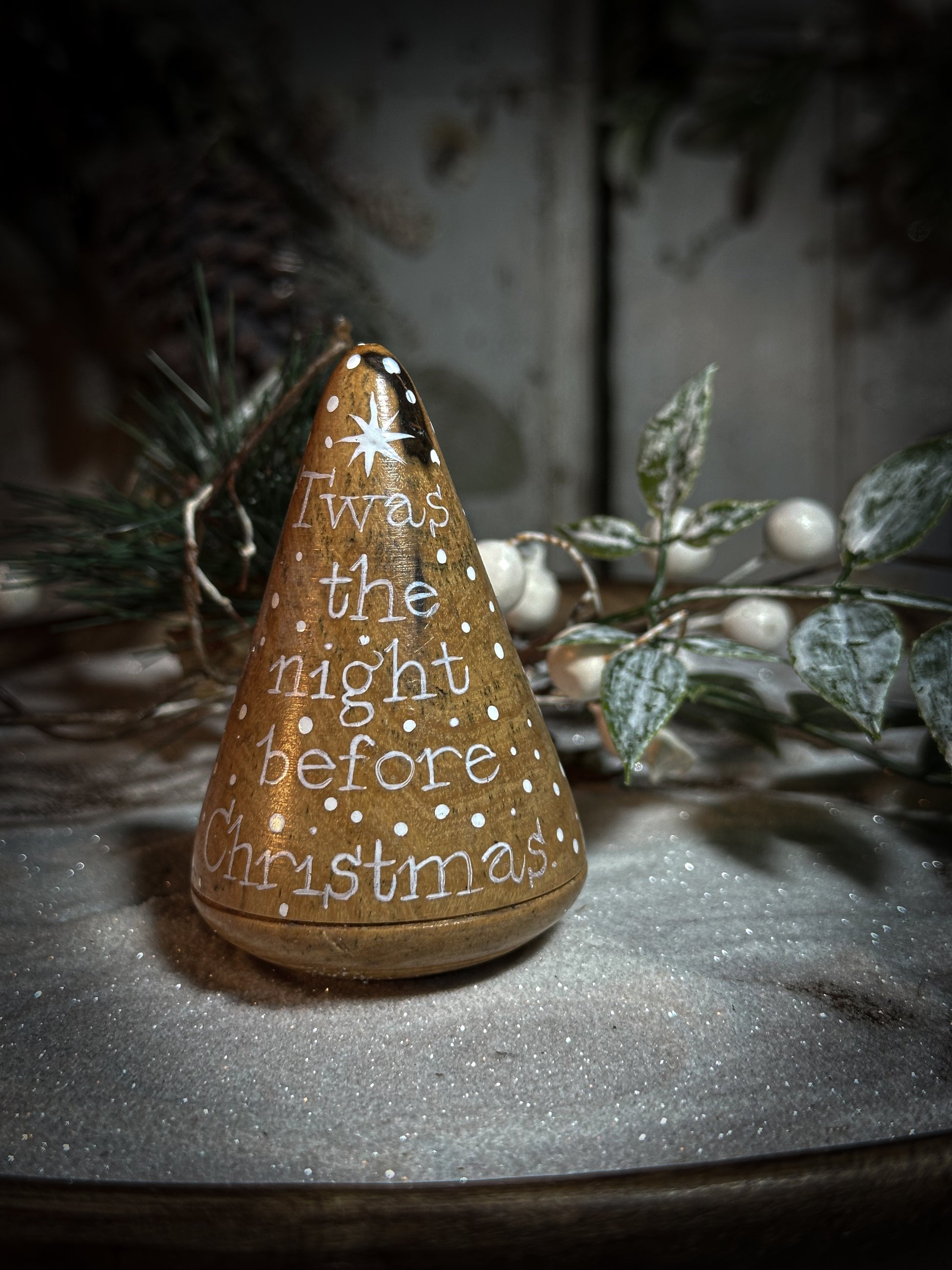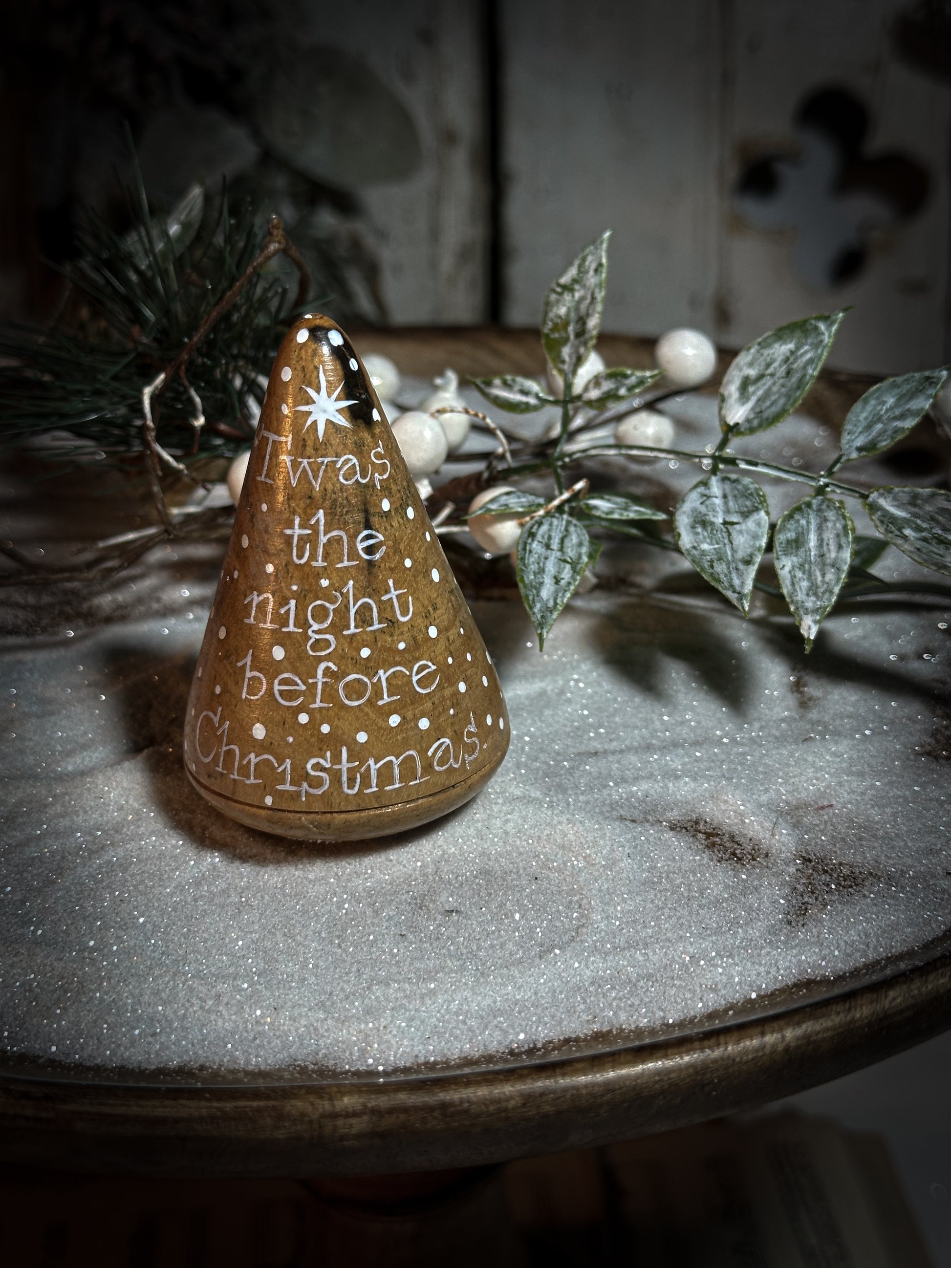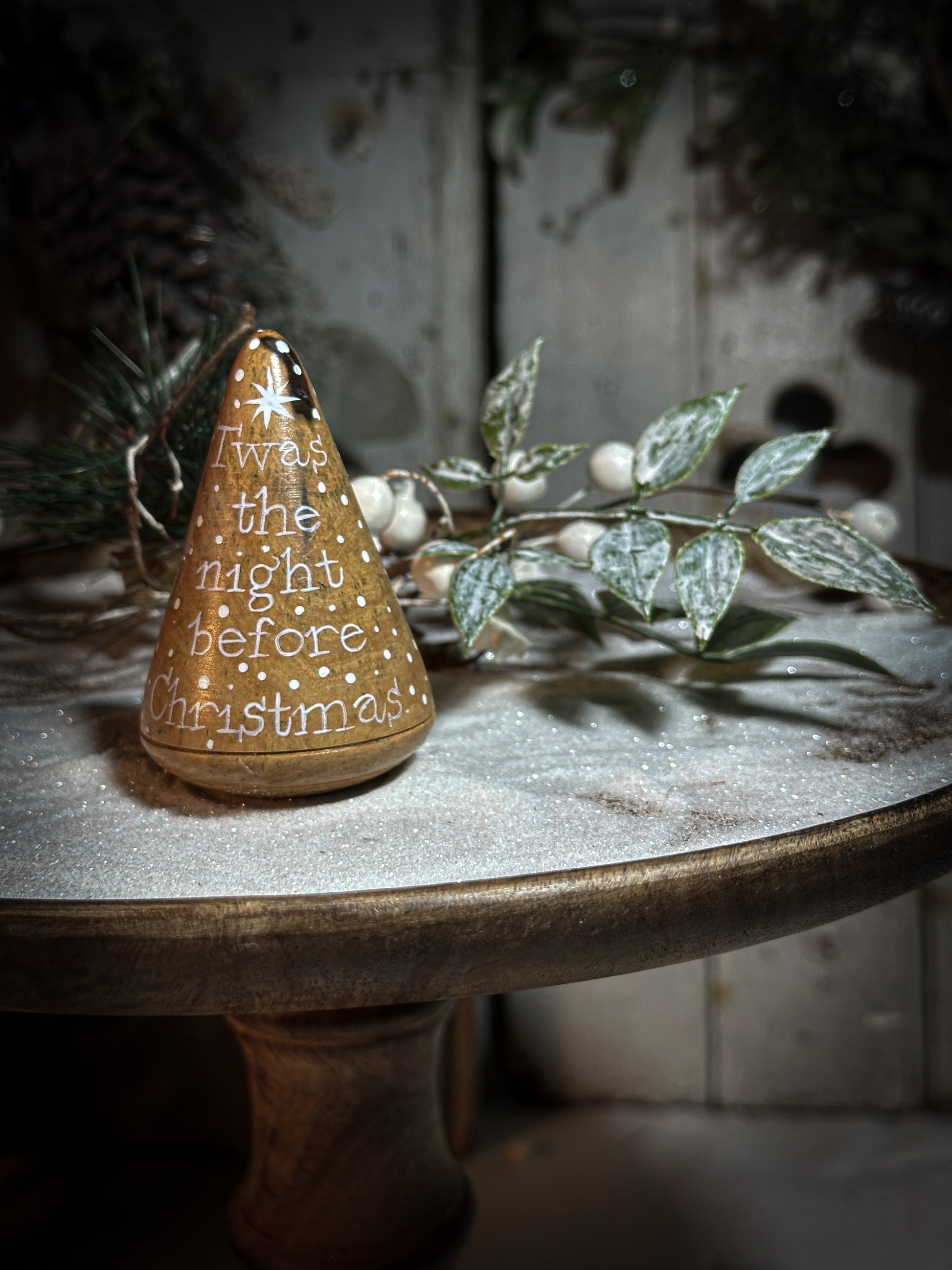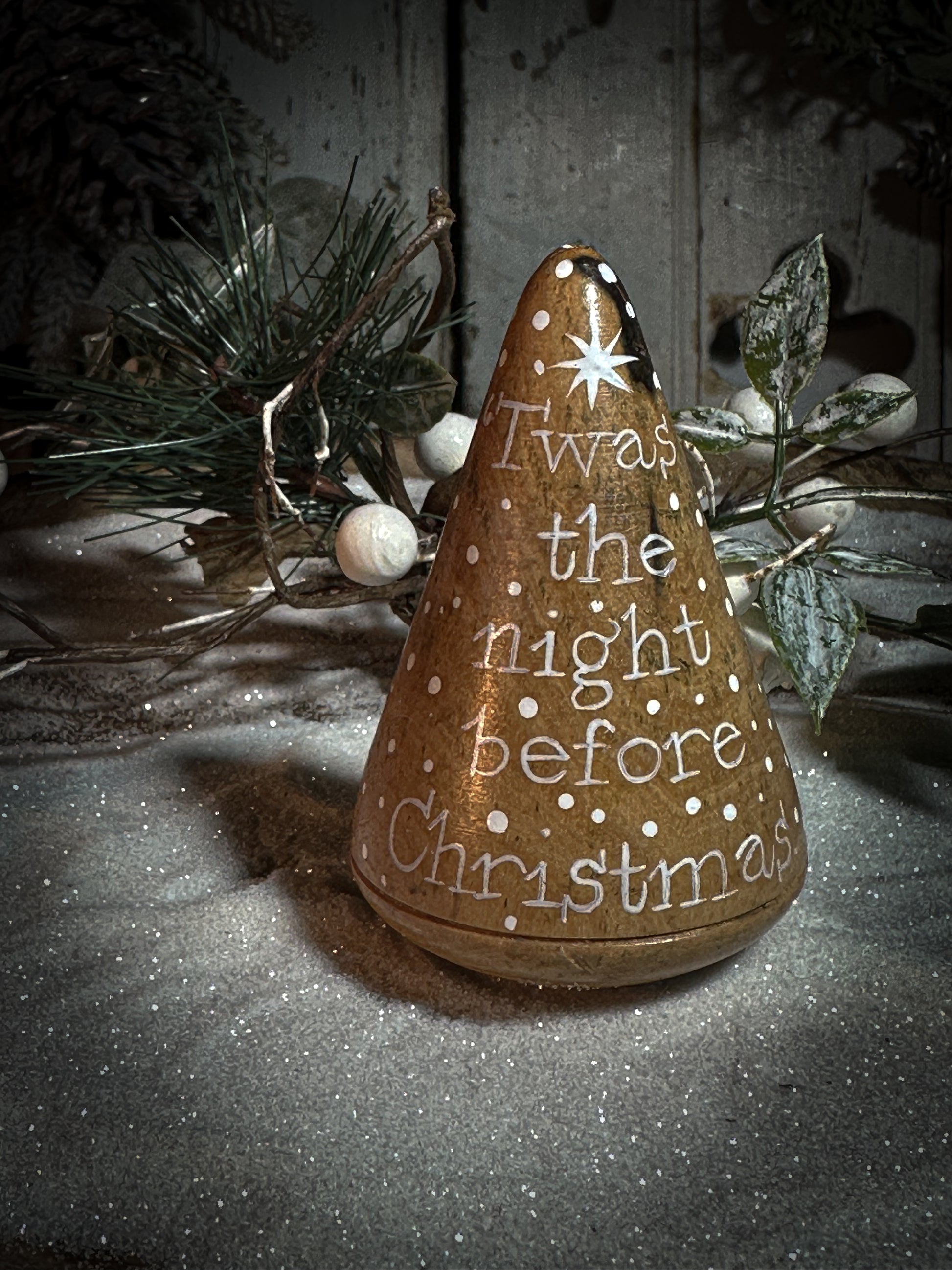 A hand painted quote on a lignum vitae wood plumber’s turnpin with a Christmas quote