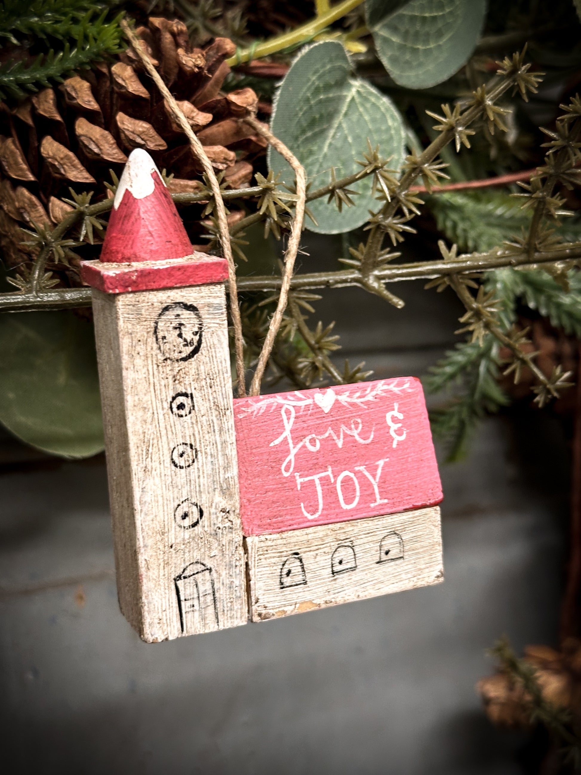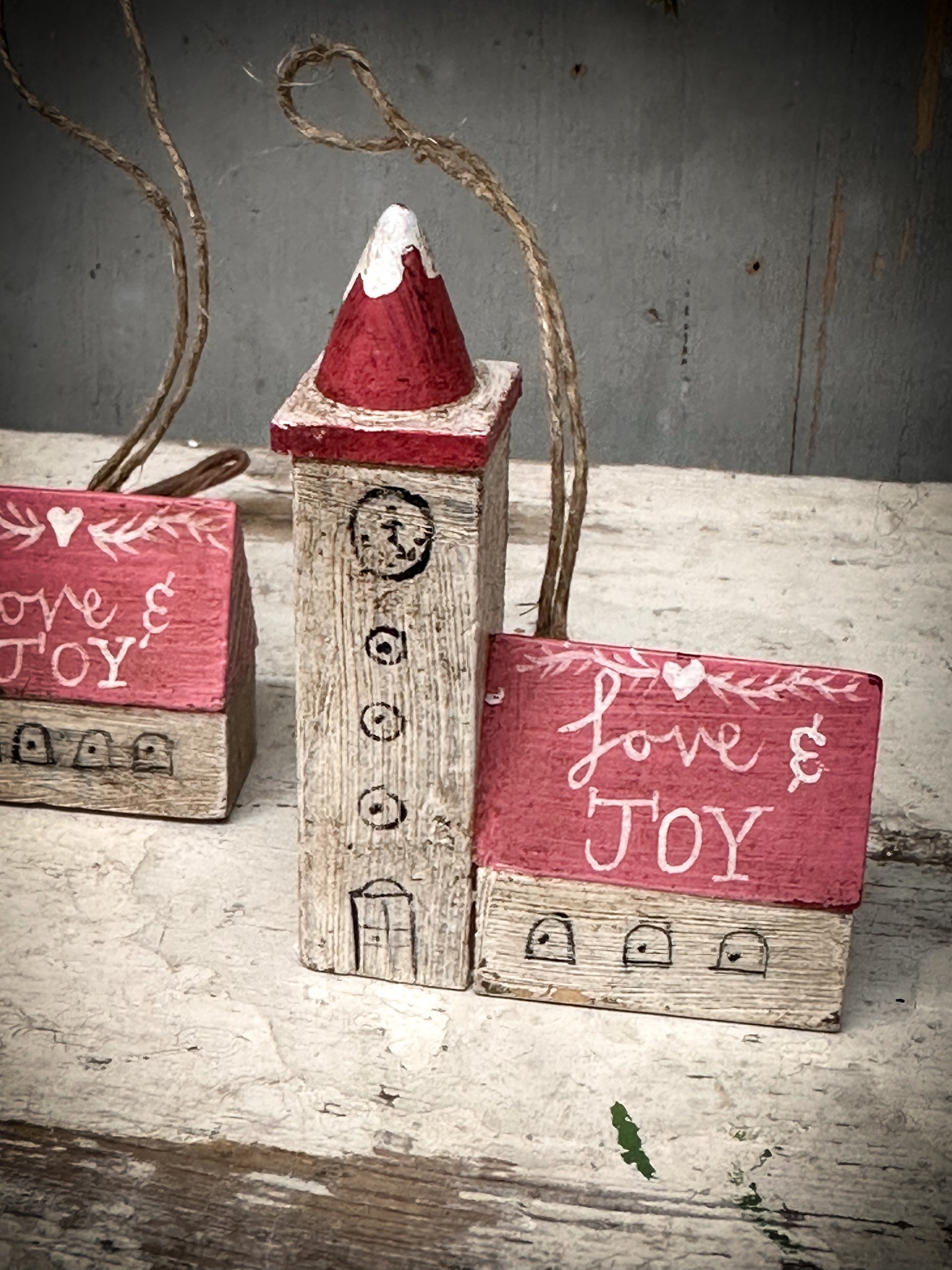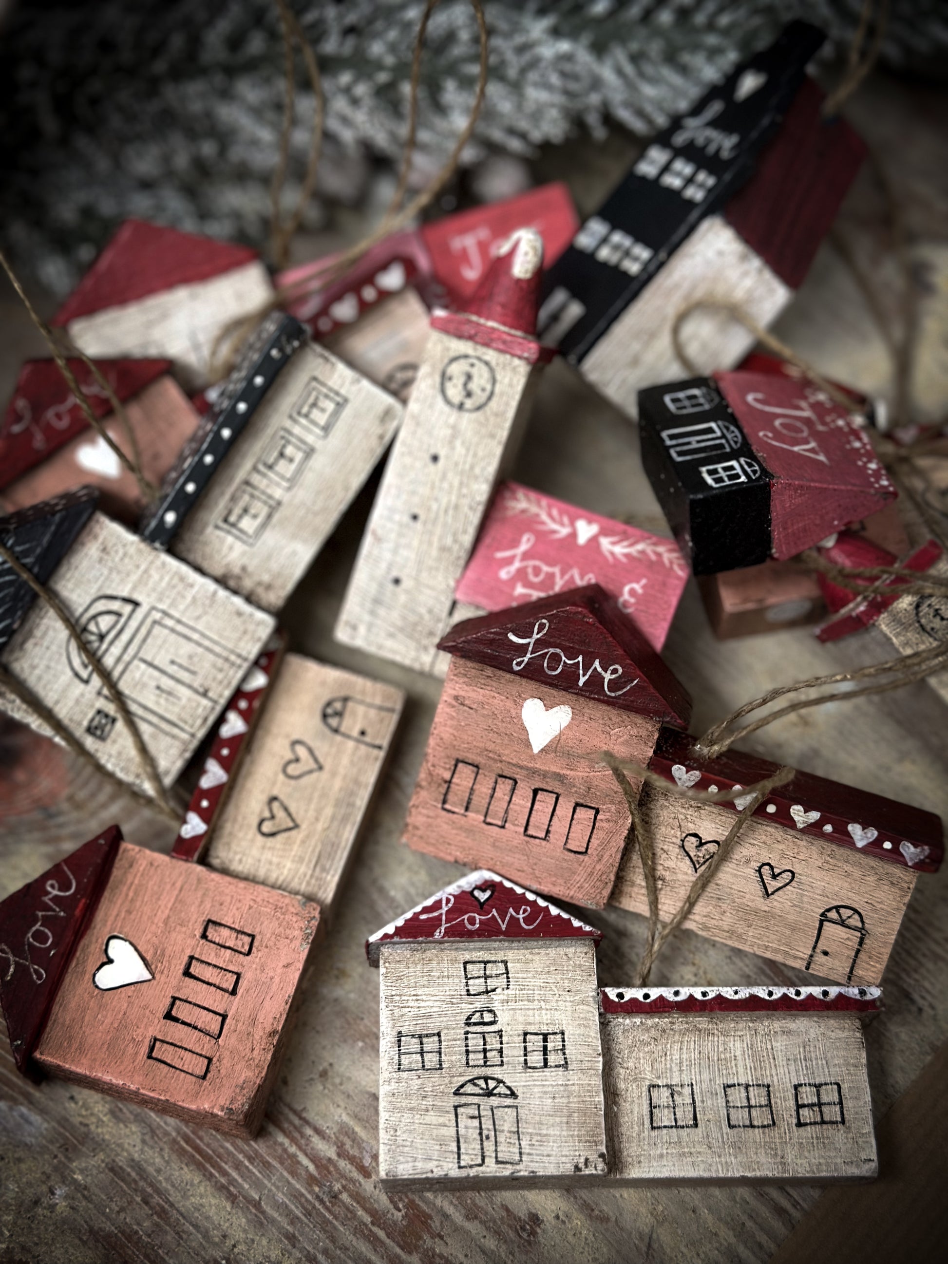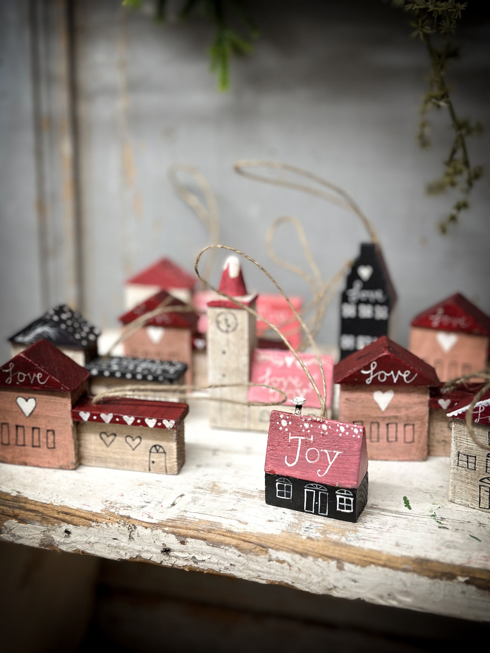A pretty vintage German Erzgebirge Putz wooden village house reworked with decorations and words and hung with a vintage twine hanger.