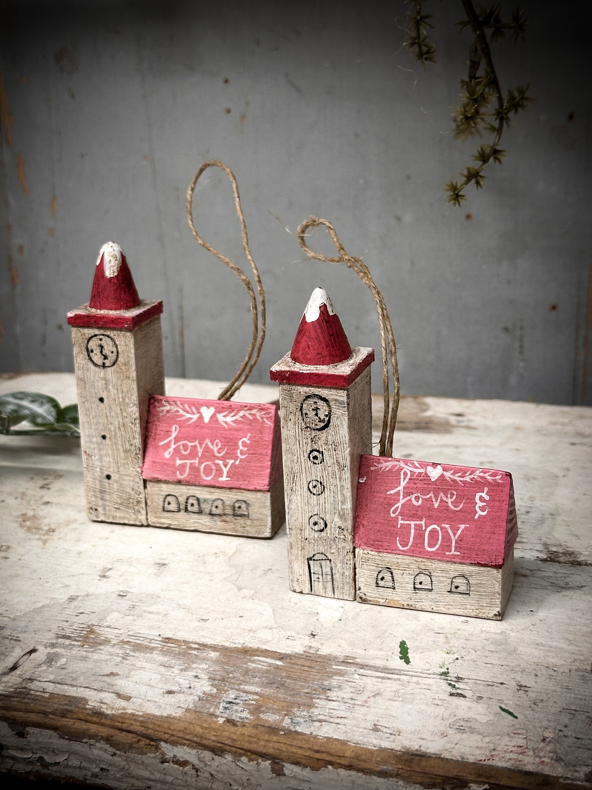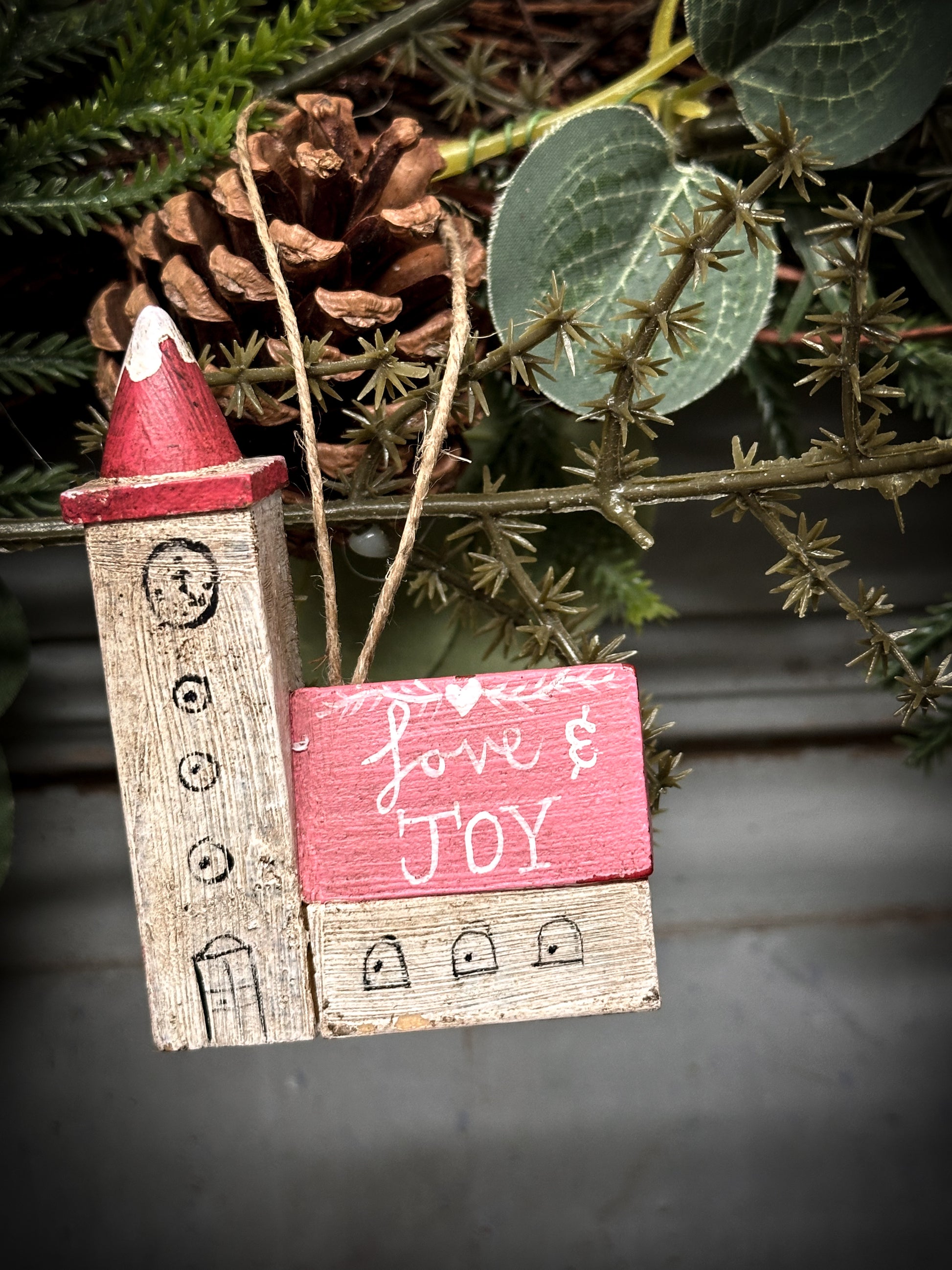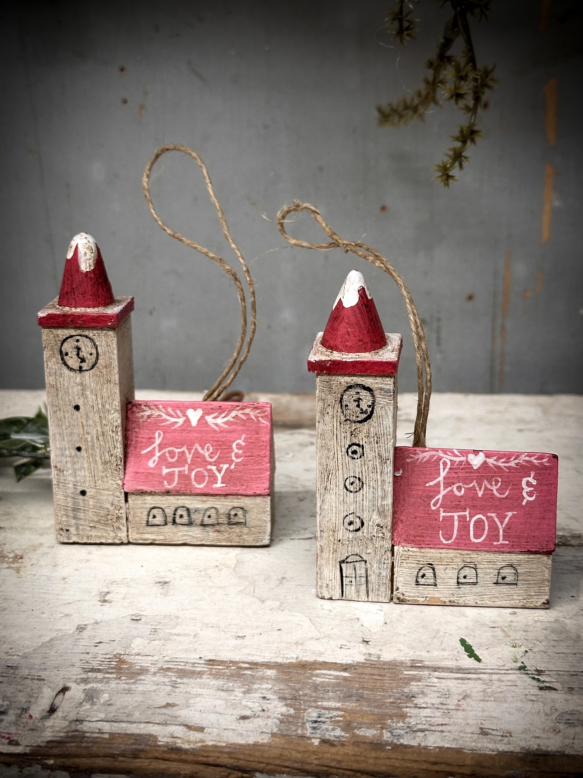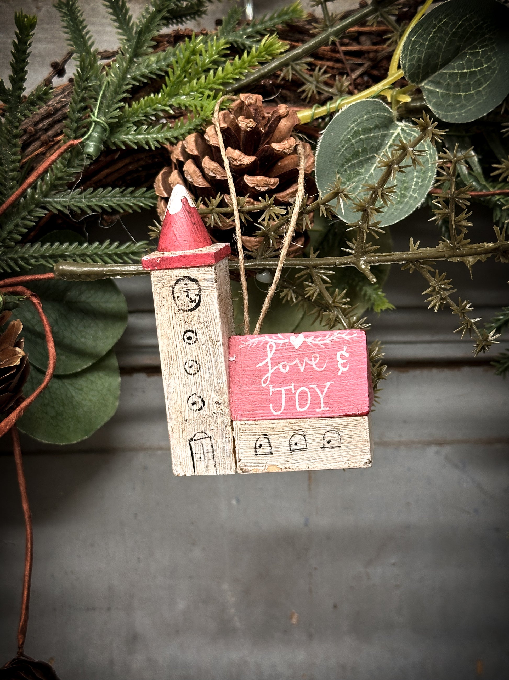 A pretty vintage German Erzgebirge Putz wooden village house reworked with decorations and words and hung with a vintage twine hanger.