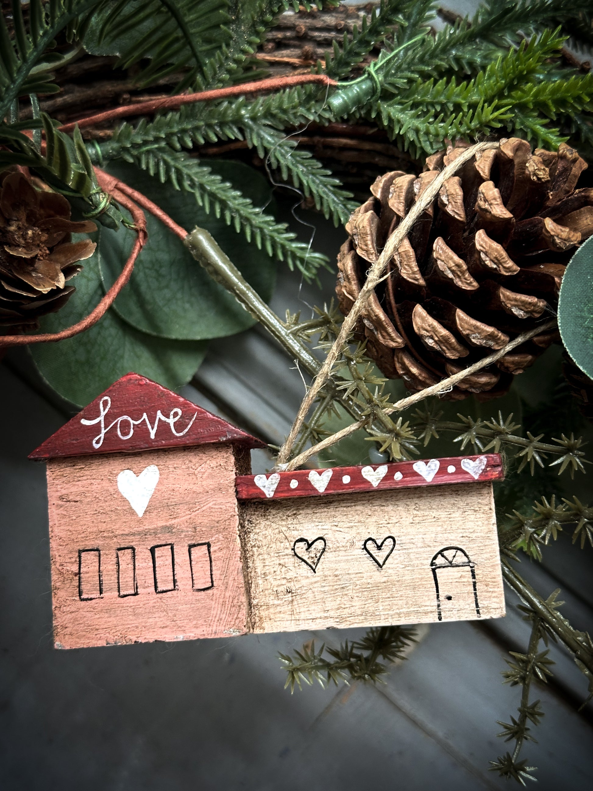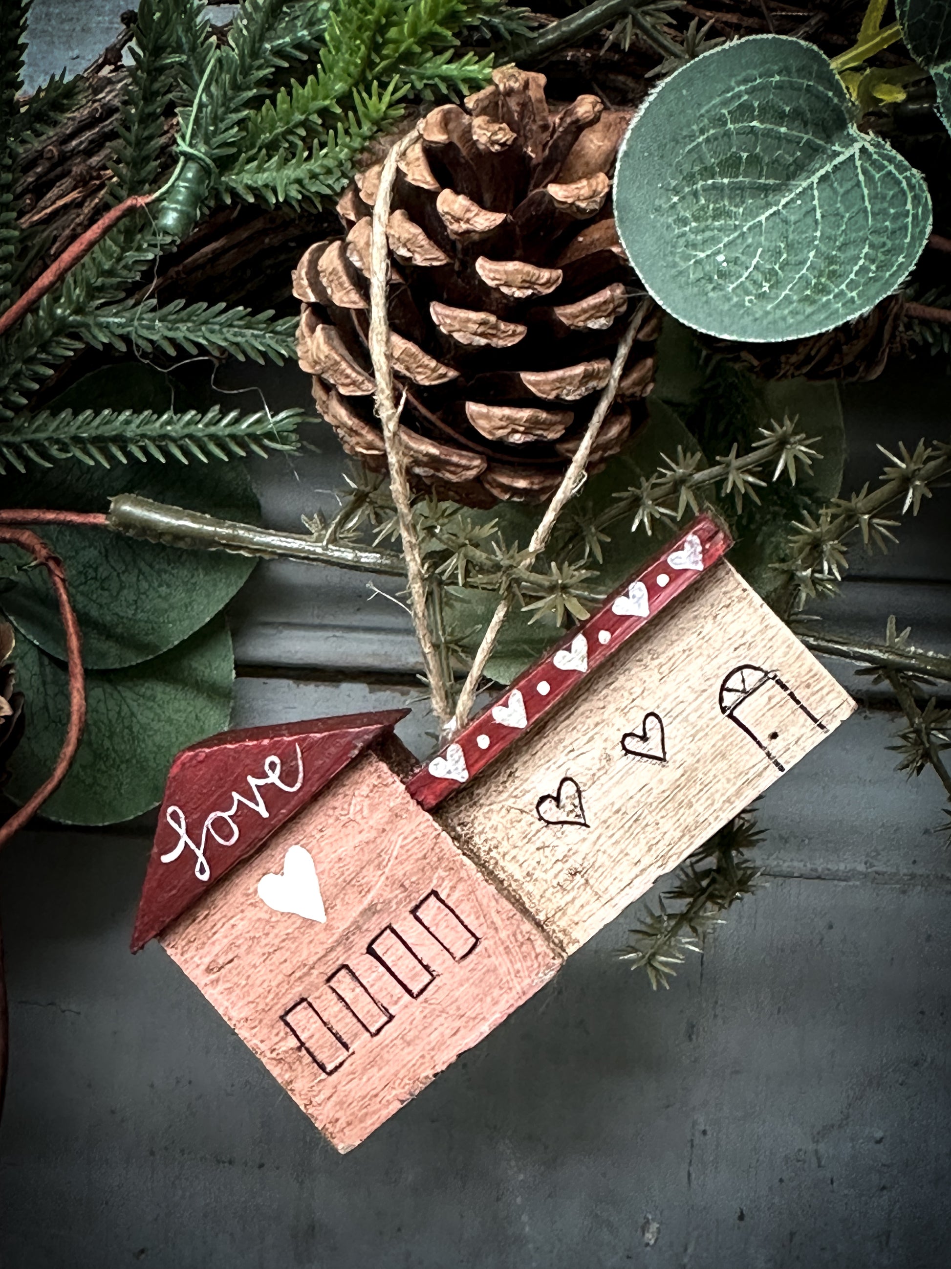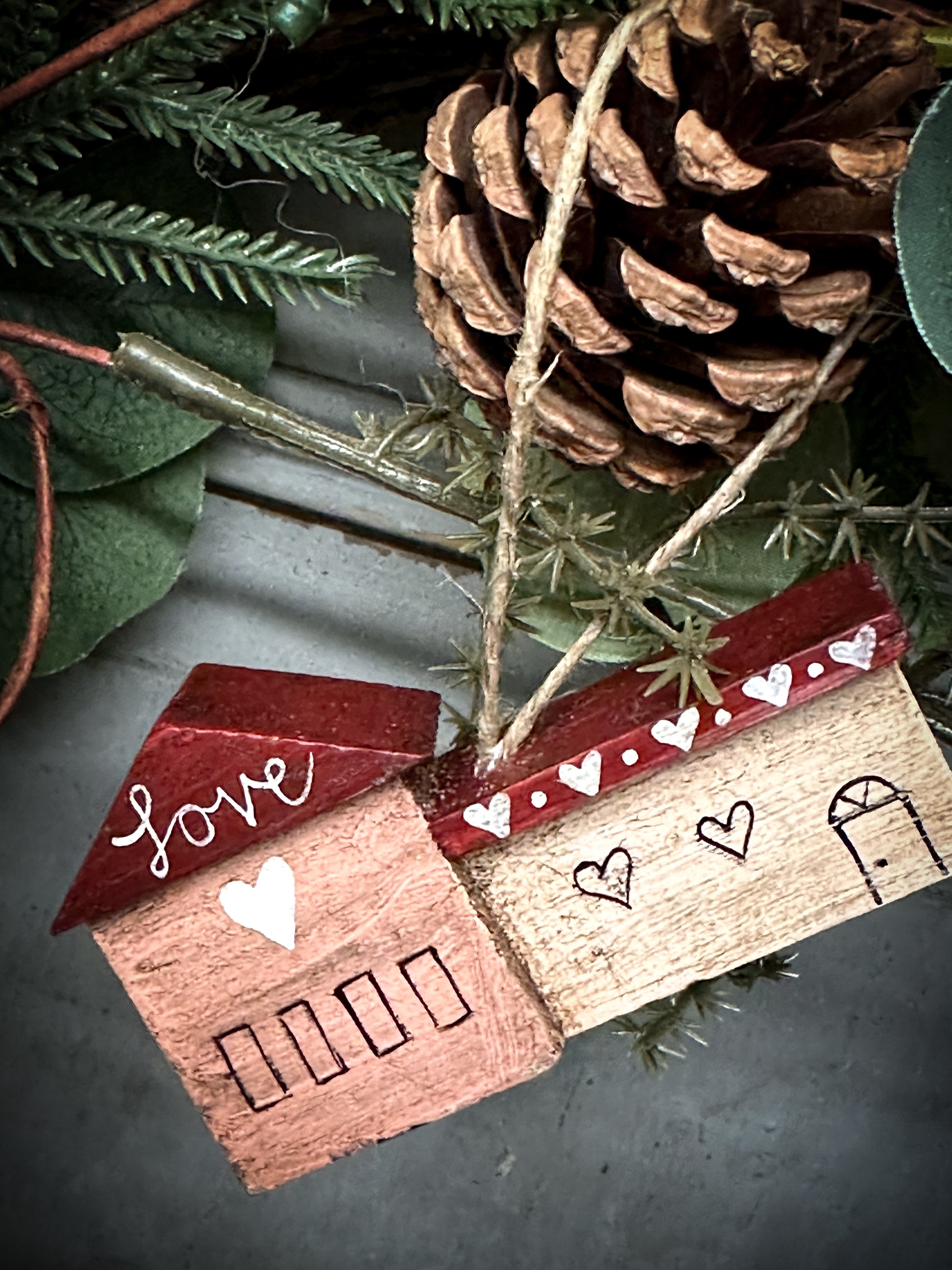 A pretty vintage German Erzgebirge Putz wooden village house reworked with decorations and words and hung with a vintage twine hanger.