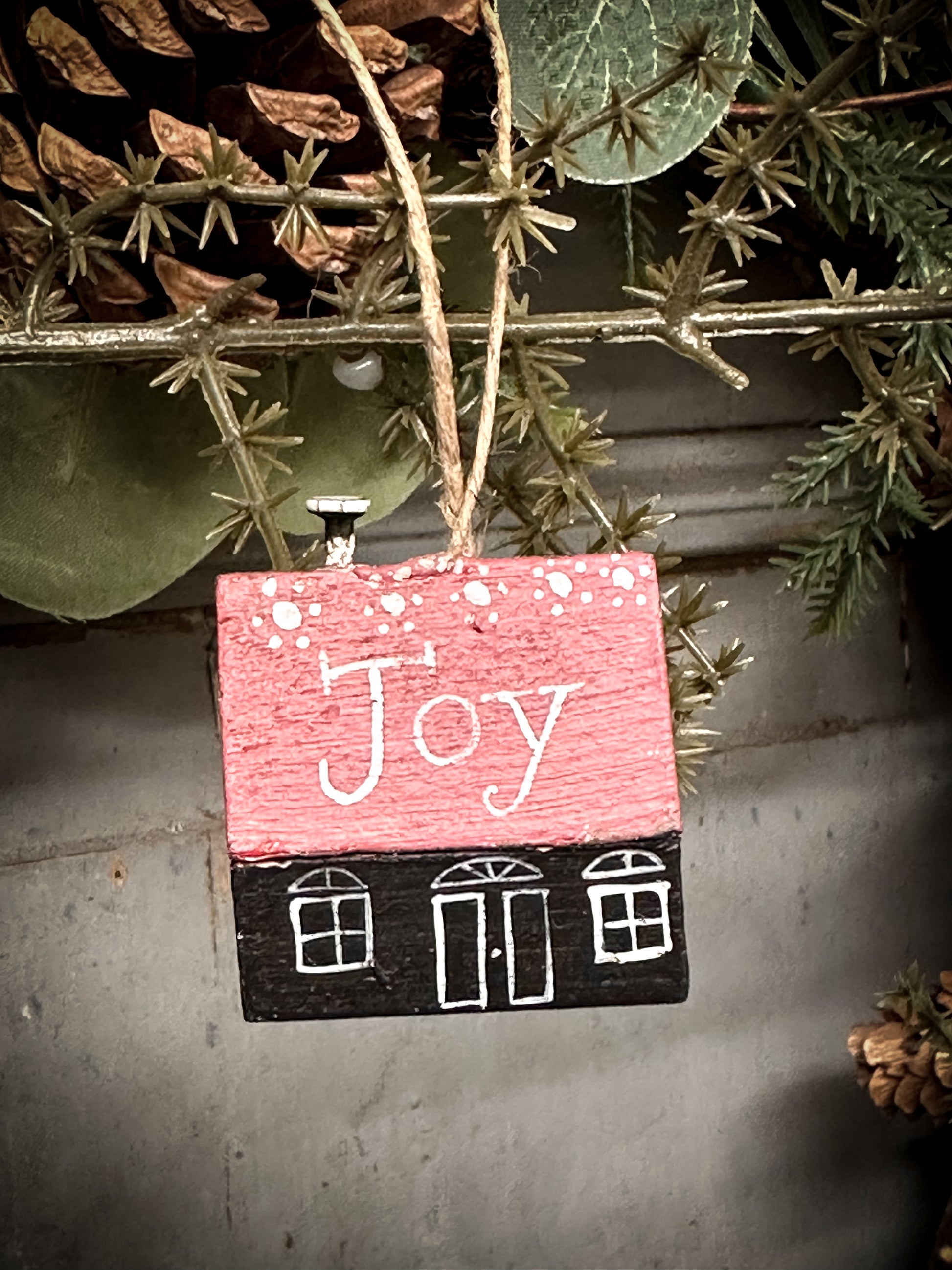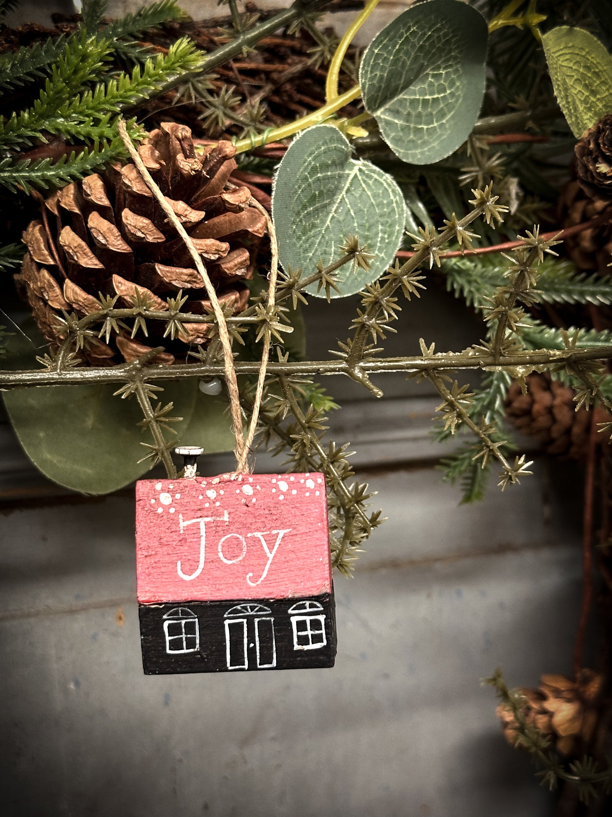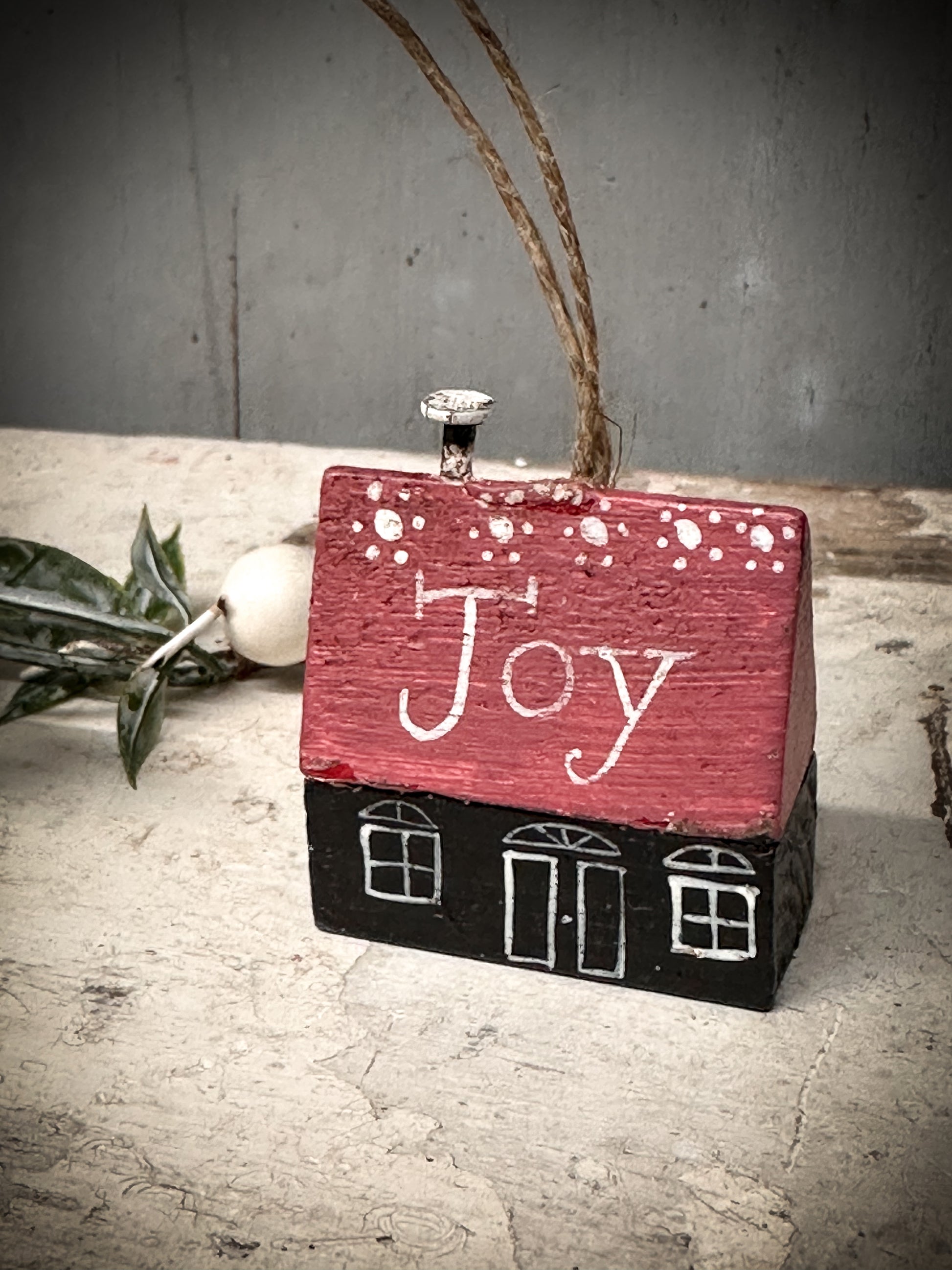 A pretty vintage German Erzgebirge Putz wooden village house reworked with decorations and words and hung with a vintage twine hanger.