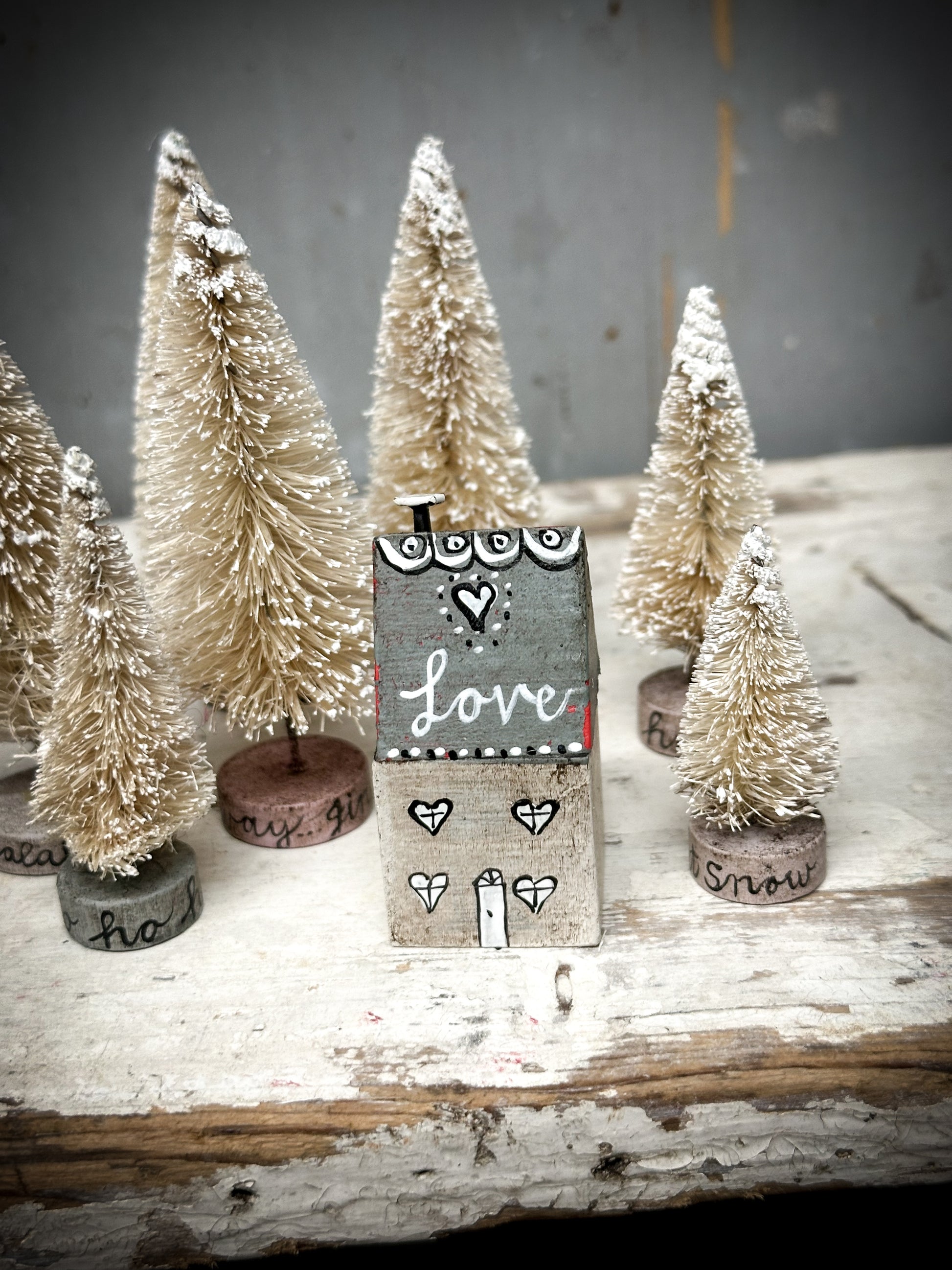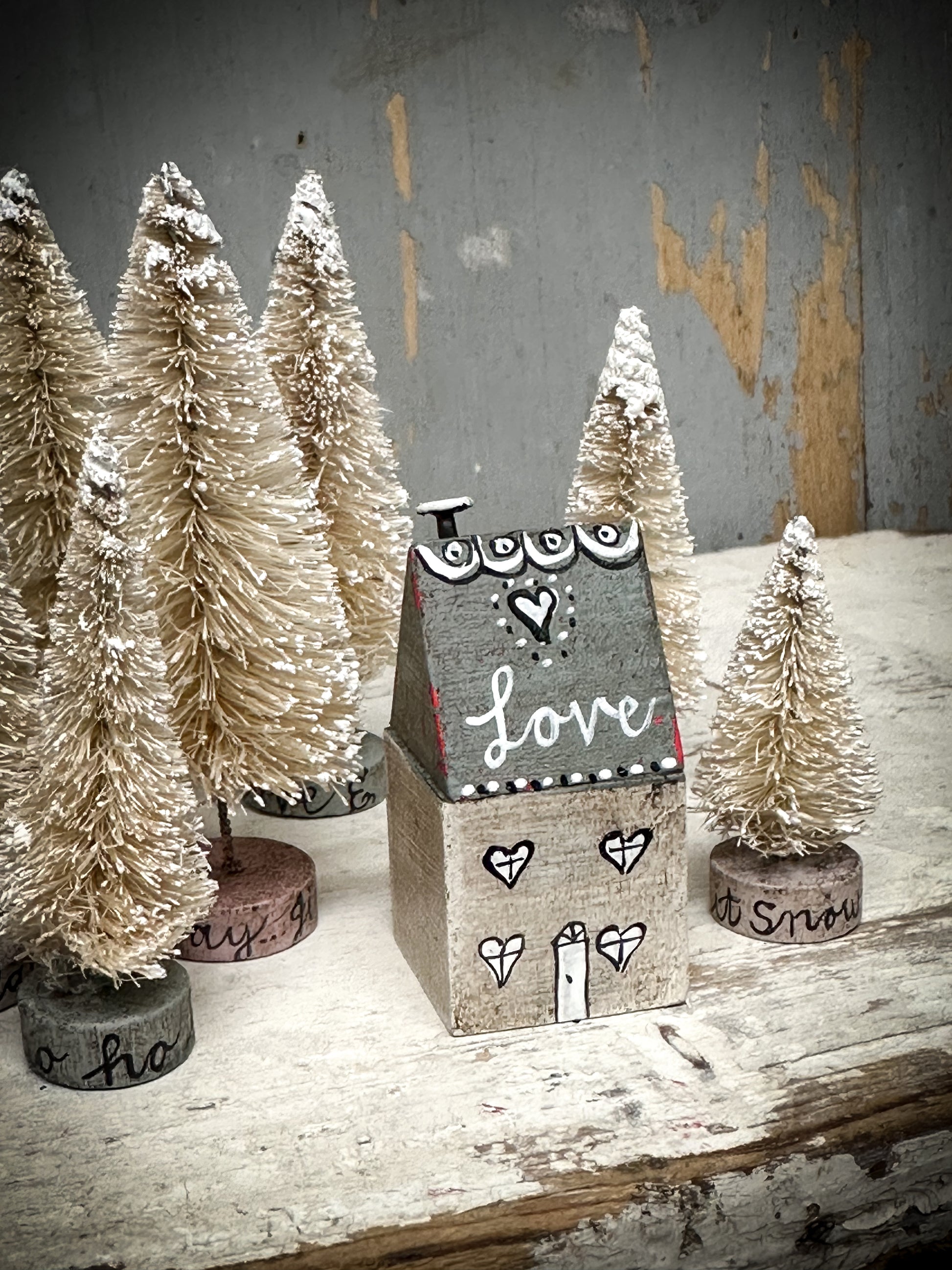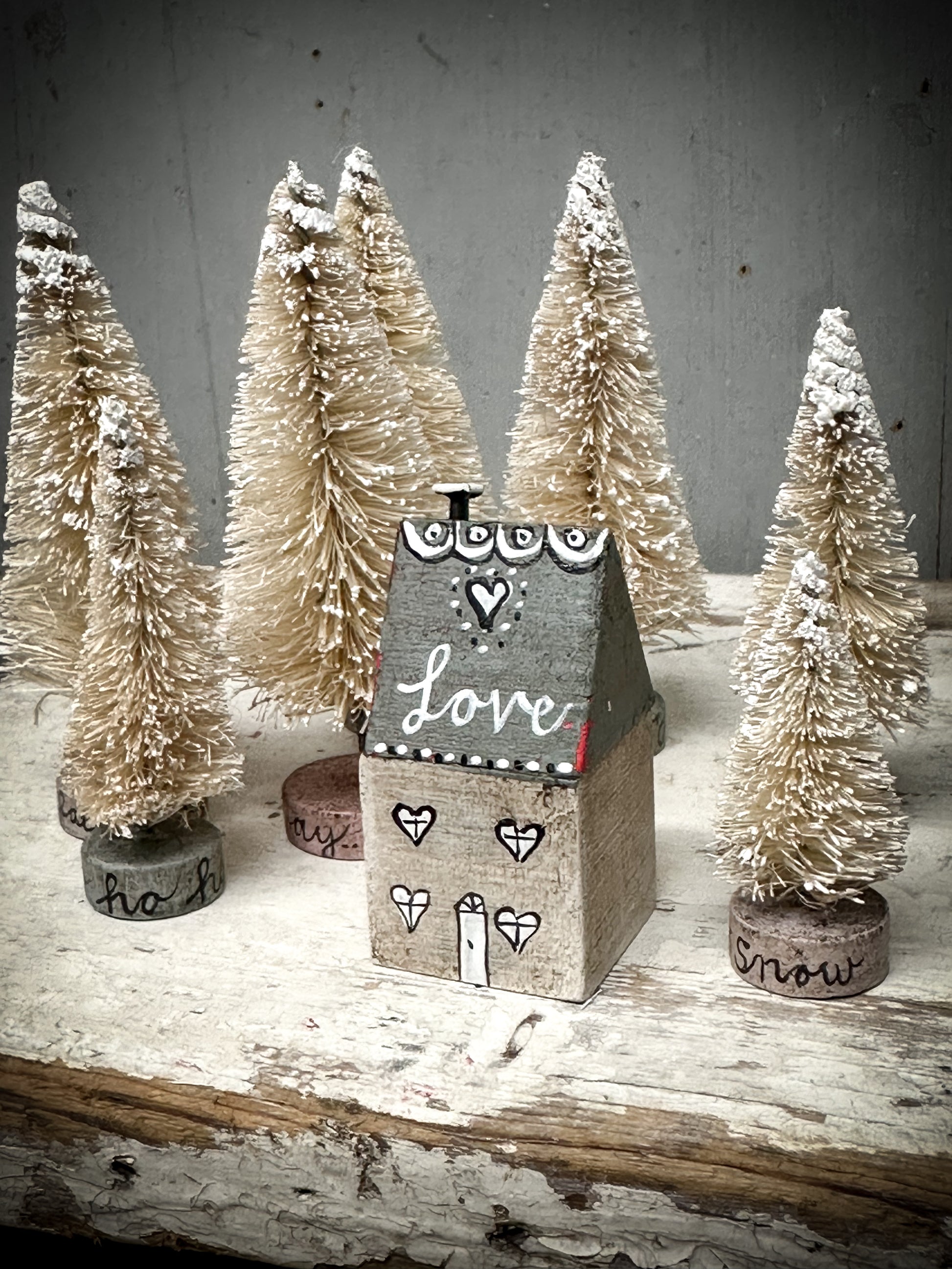 A pretty vintage German Erzgebirge Putz wooden village house reworked with decorations and words.