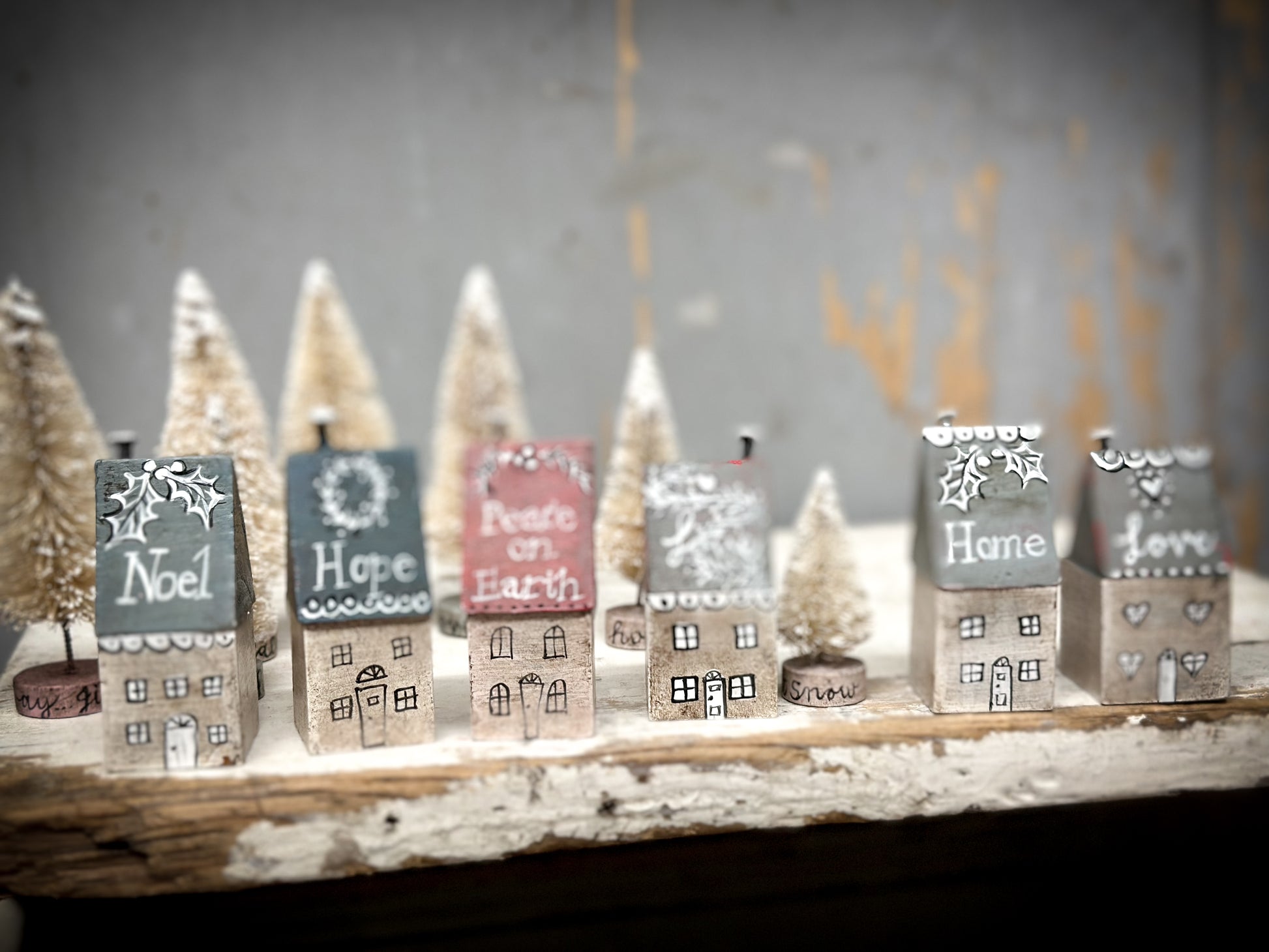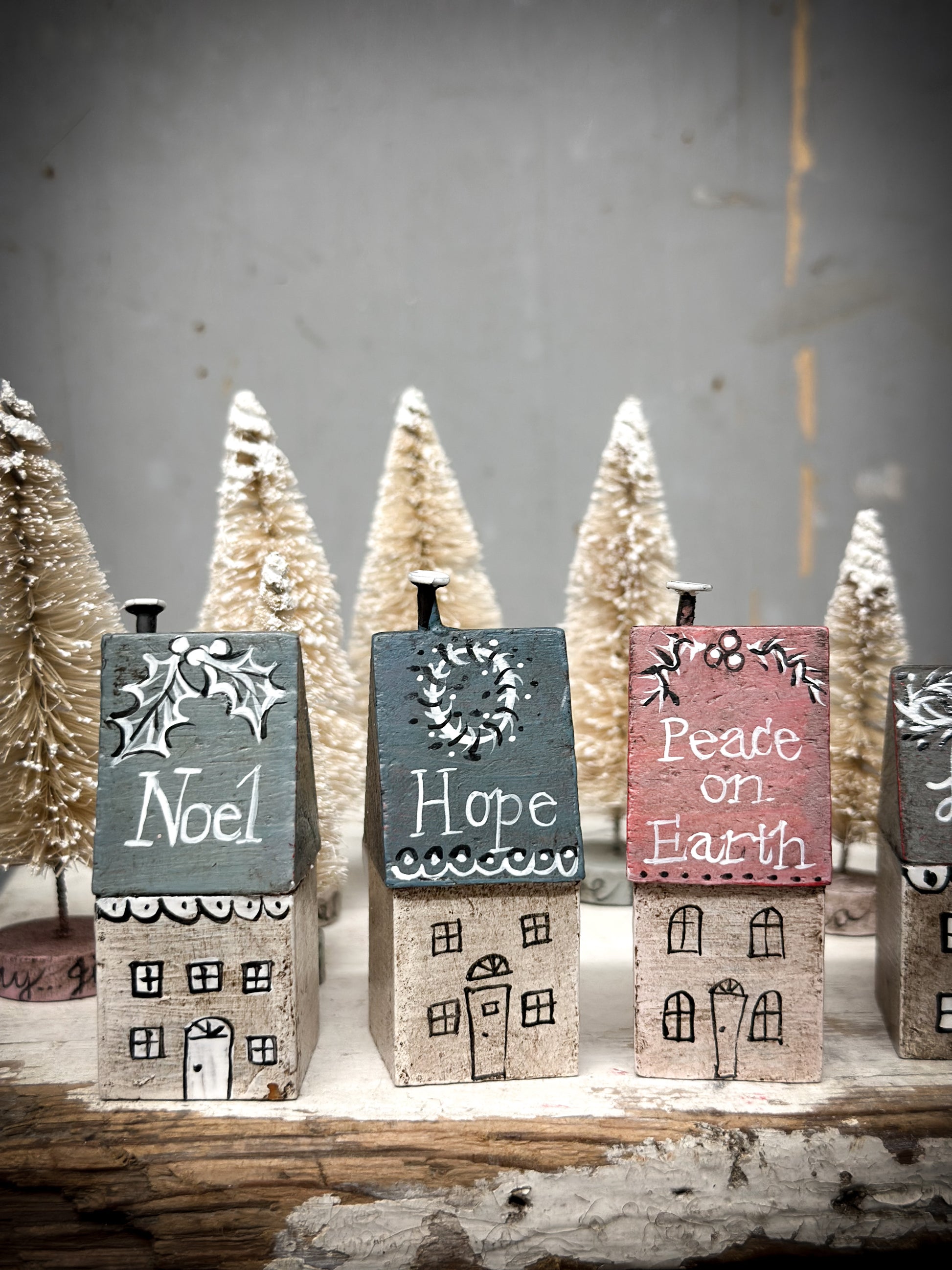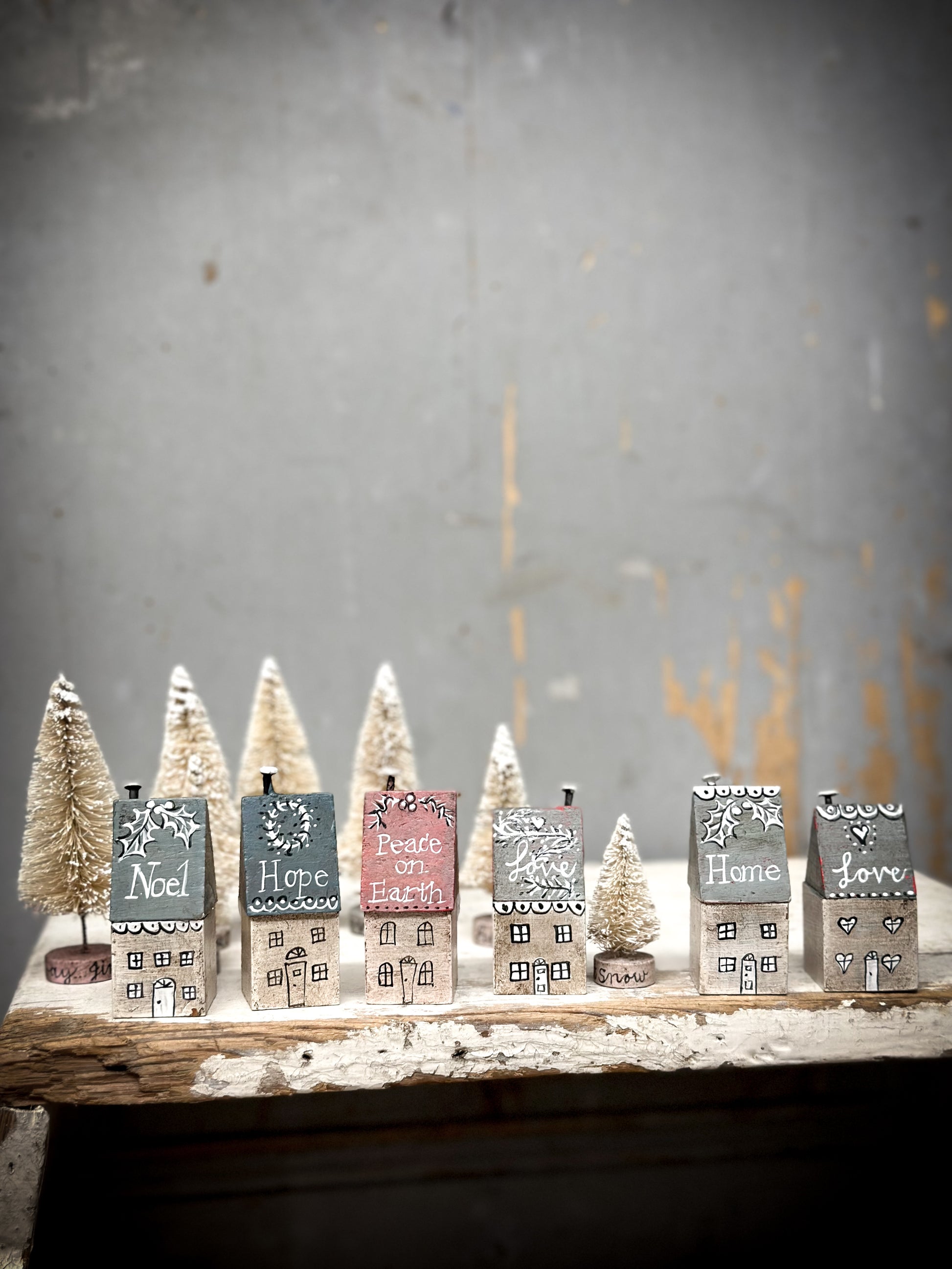 A pretty vintage German Erzgebirge Putz wooden village house reworked with decorations and words.