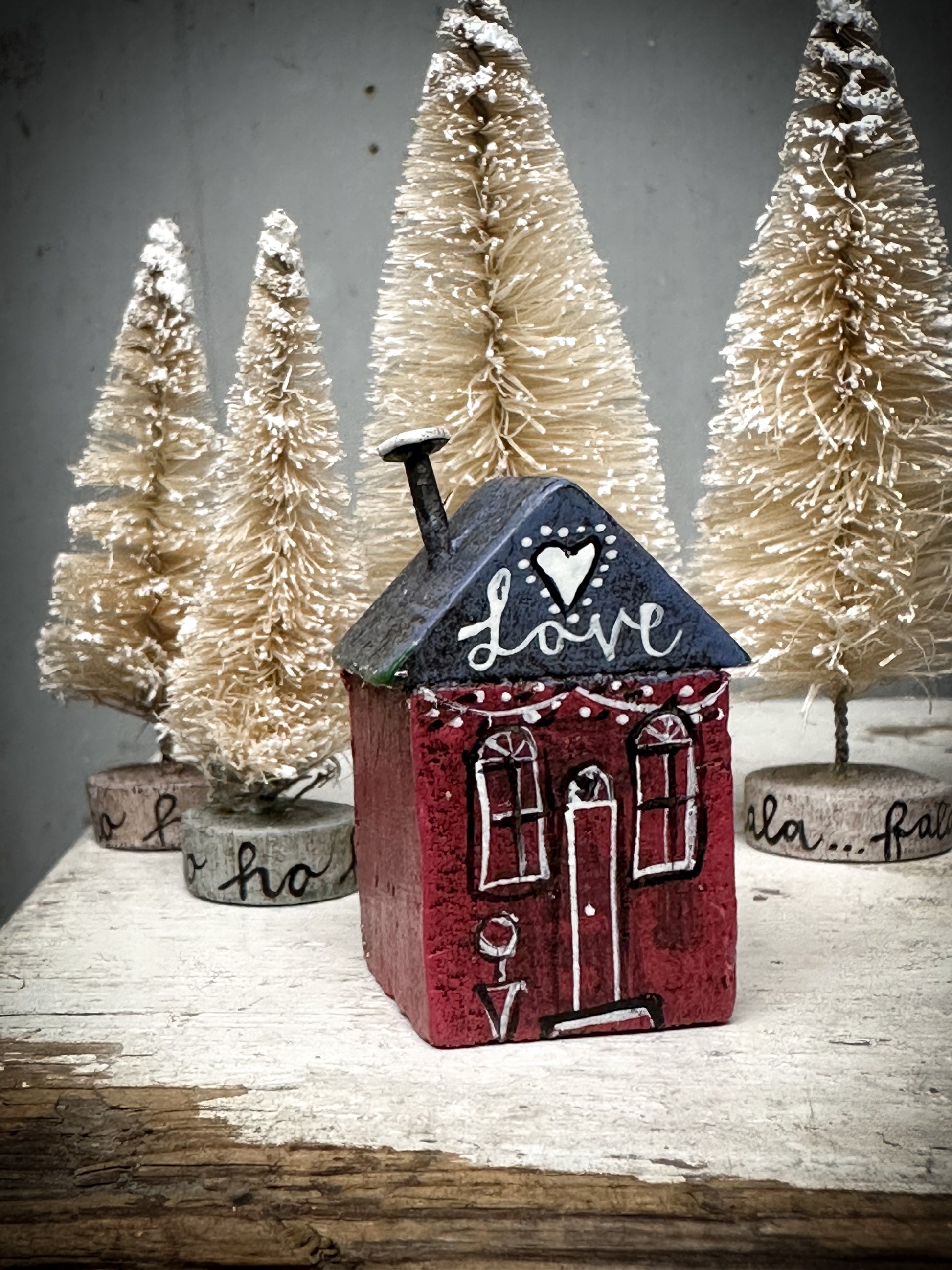 A pretty vintage German Erzgebirge Putz wooden village house reworked with decorations and words.