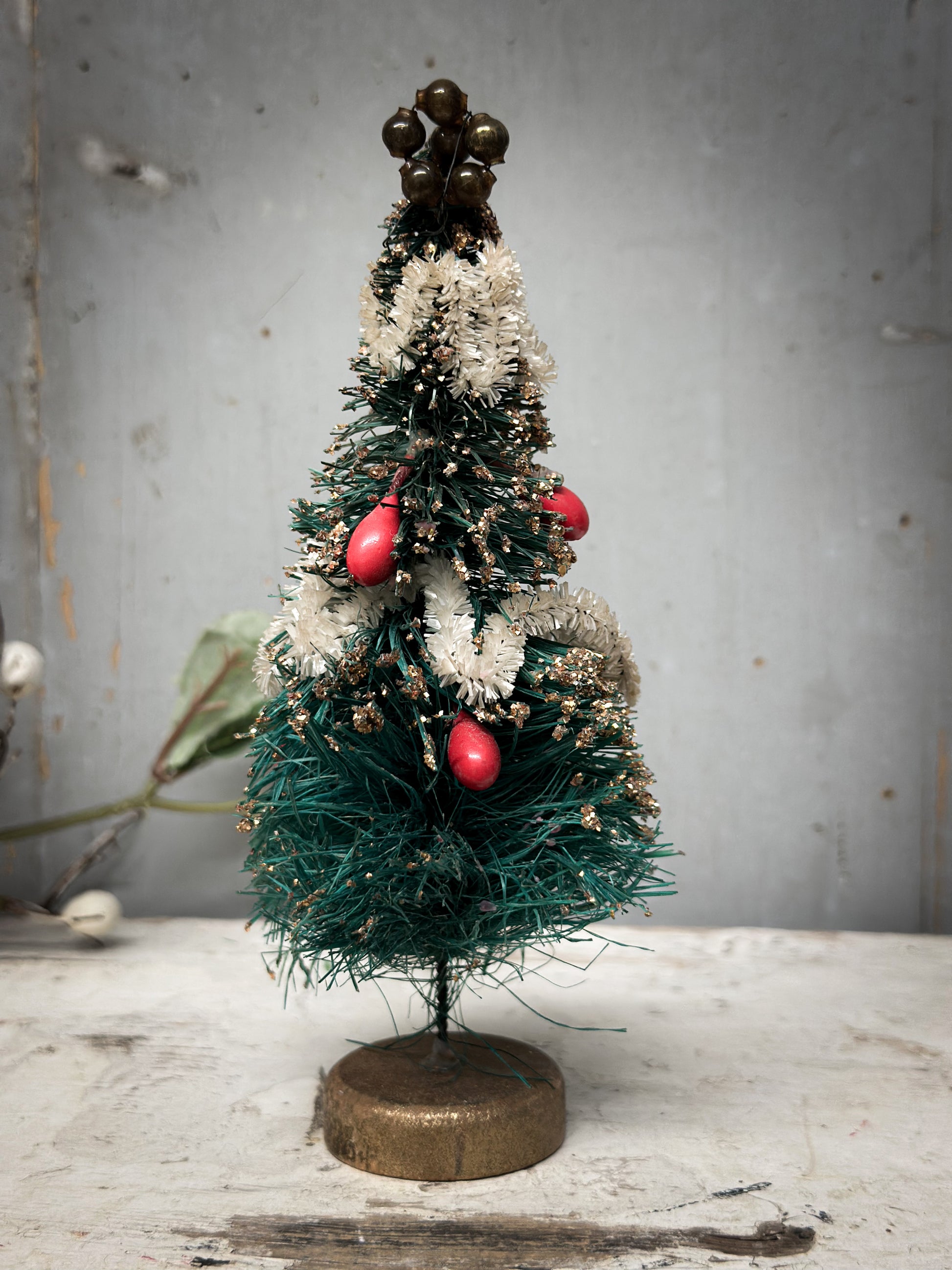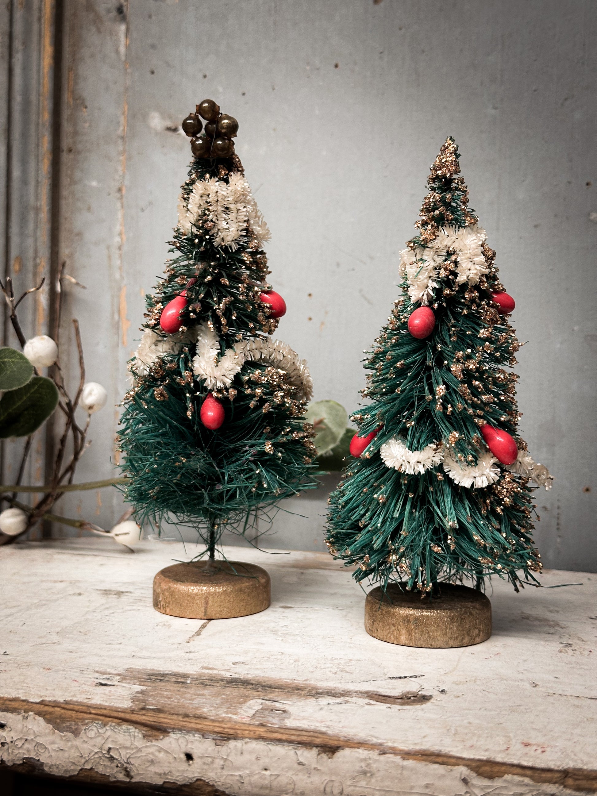 A refined and characterful pair of mid-century Japanese bottle-brush Christmas trees, dating to the 1950s–60s and retaining their original festive adornments. Each tree is composed of dense green bristles, finished with white garlands, hand-applied glitter and bright red baubles — a classic example of Japan’s celebrated post-war Christmas export craft.