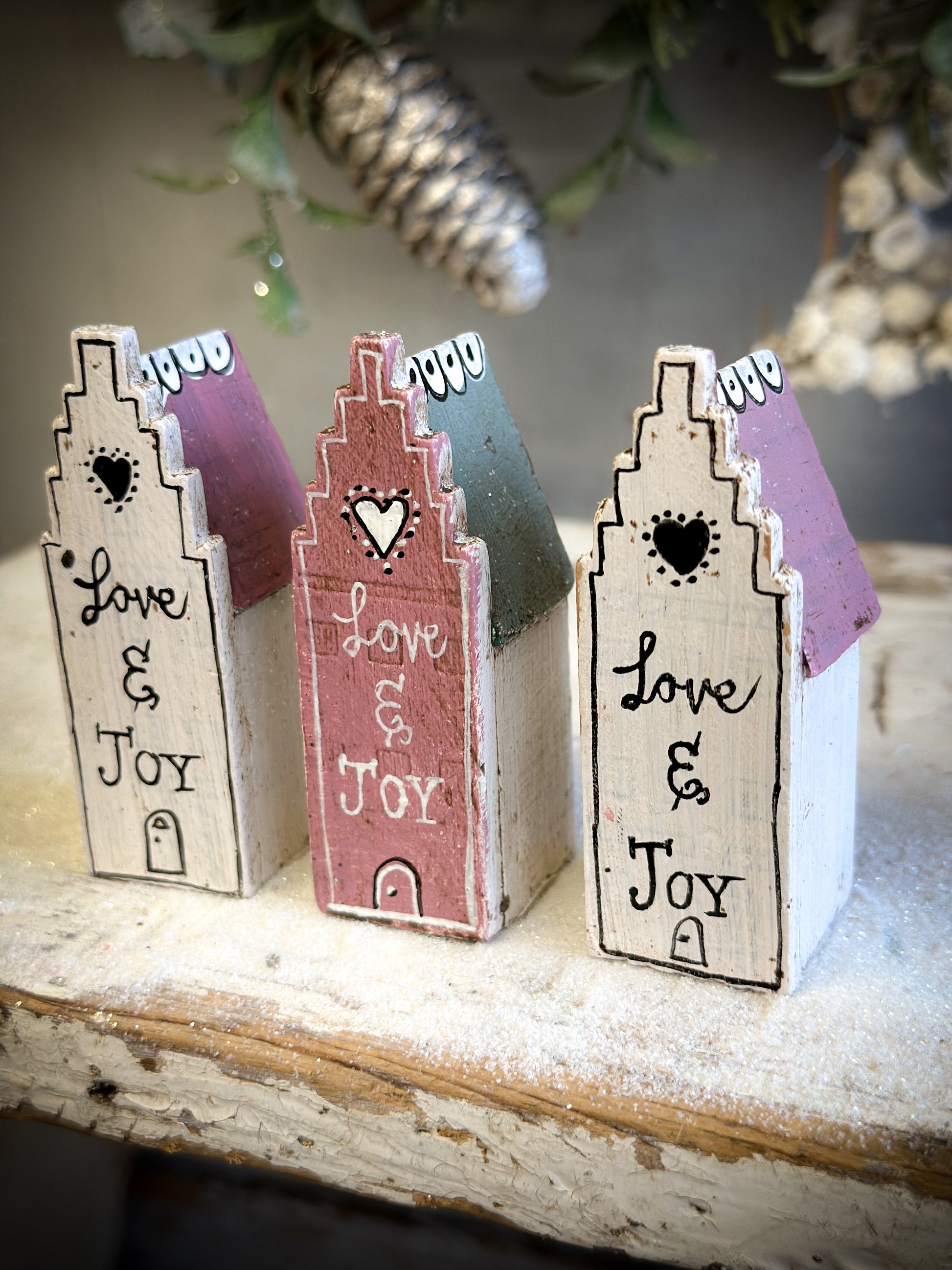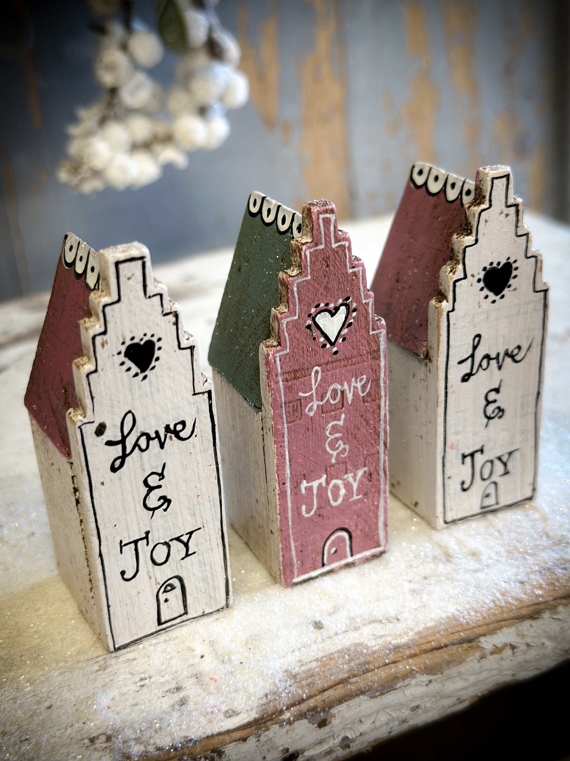 A pretty vintage German Erzgebirge Putz wooden village house reworked with decorations and words.