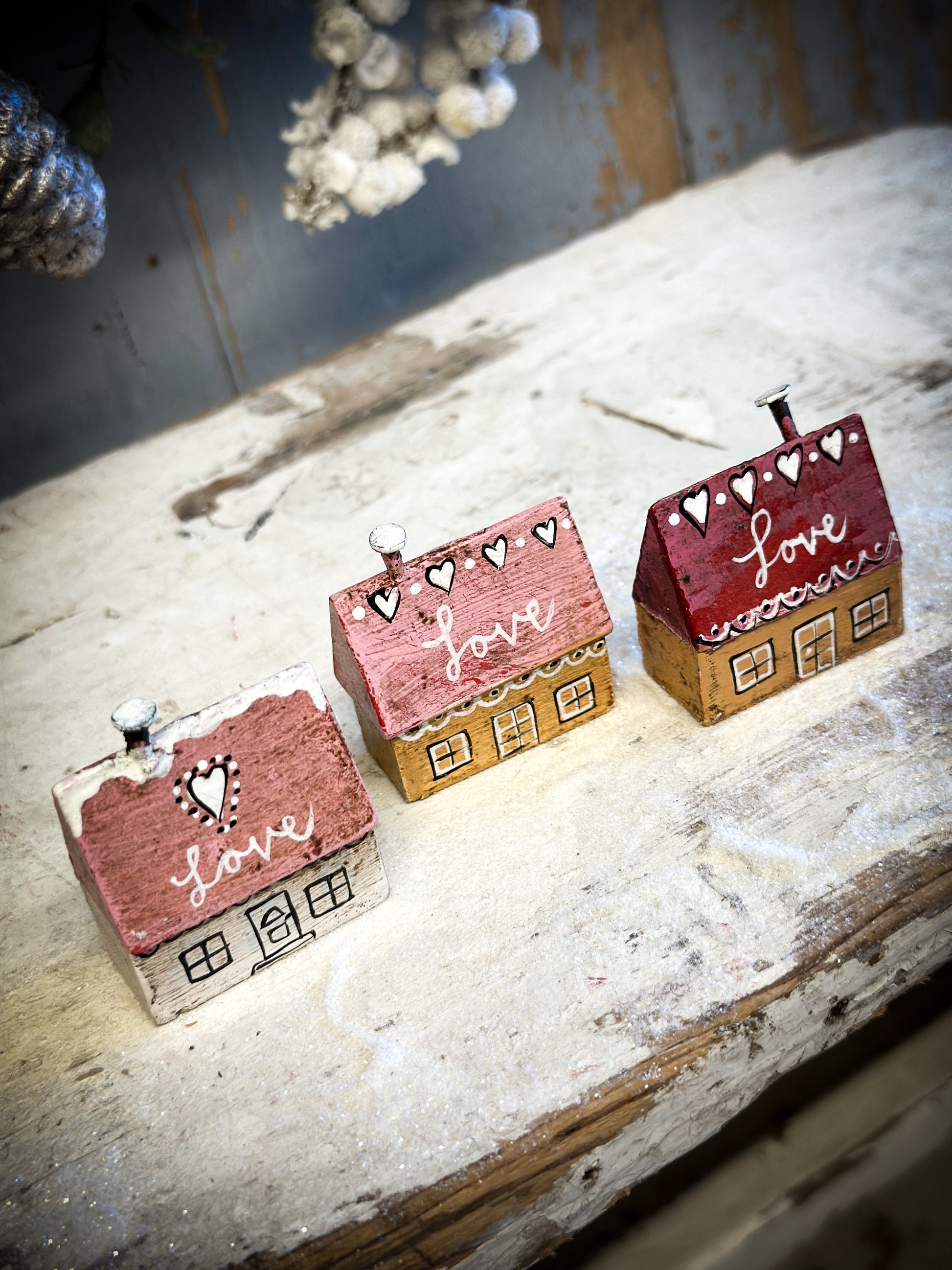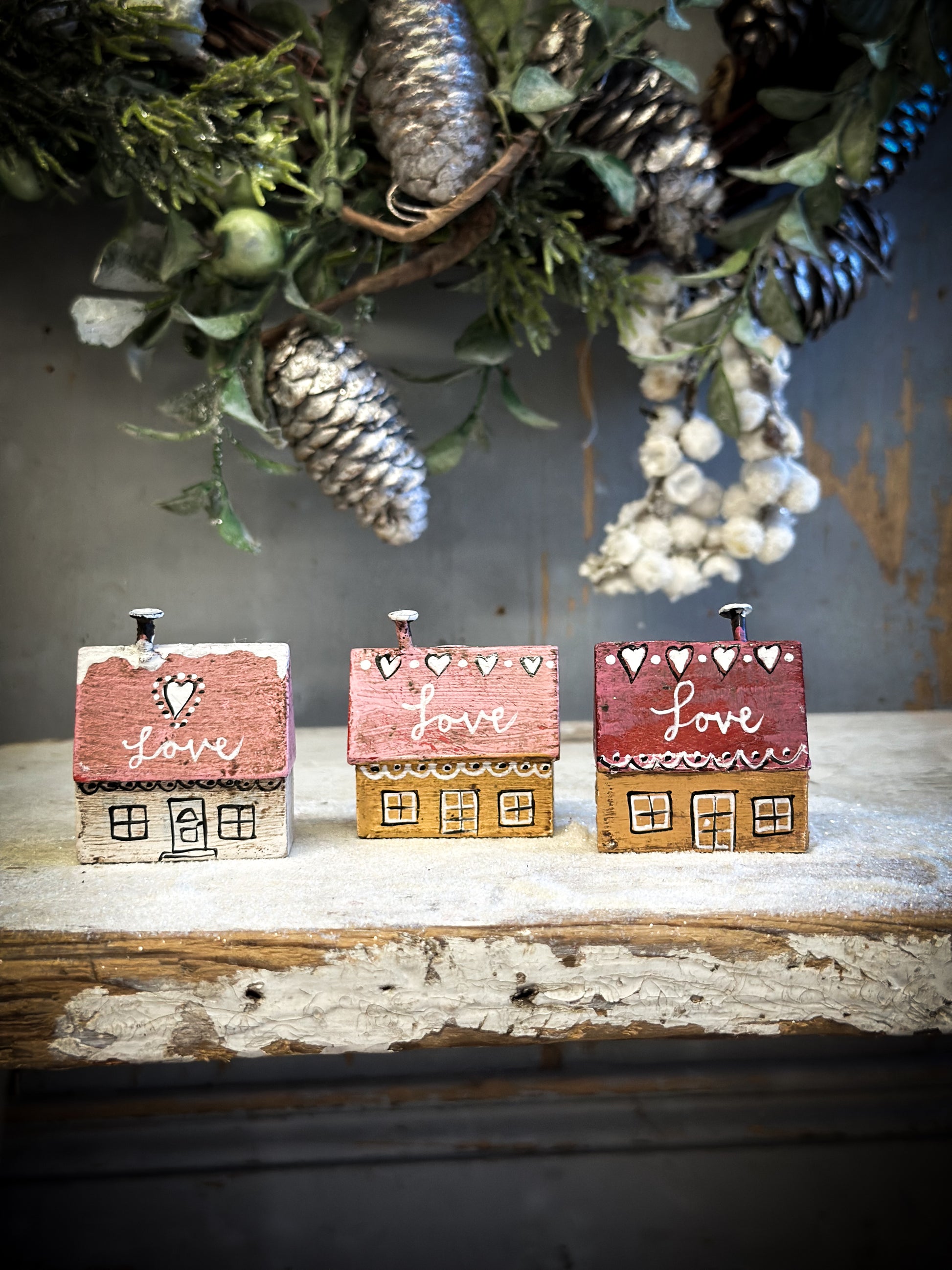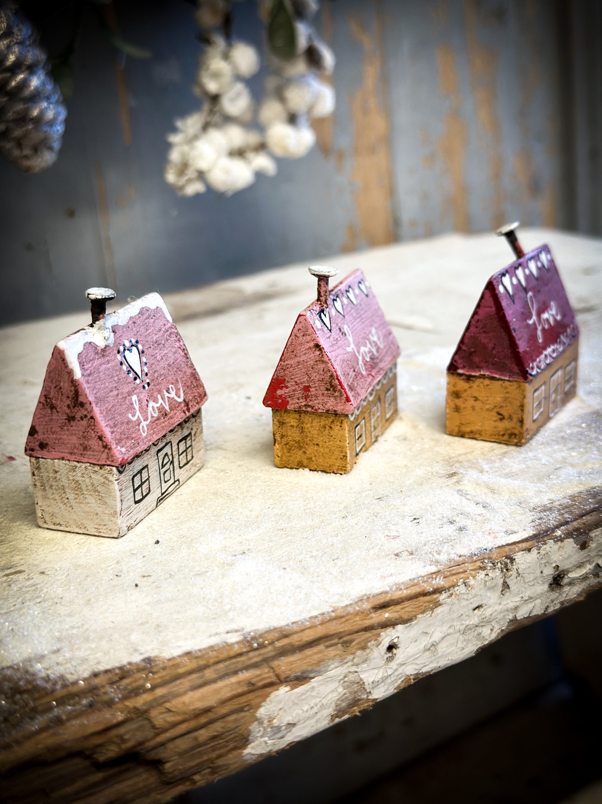 A pretty vintage German Erzgebirge Putz wooden village house reworked with decorations and words.