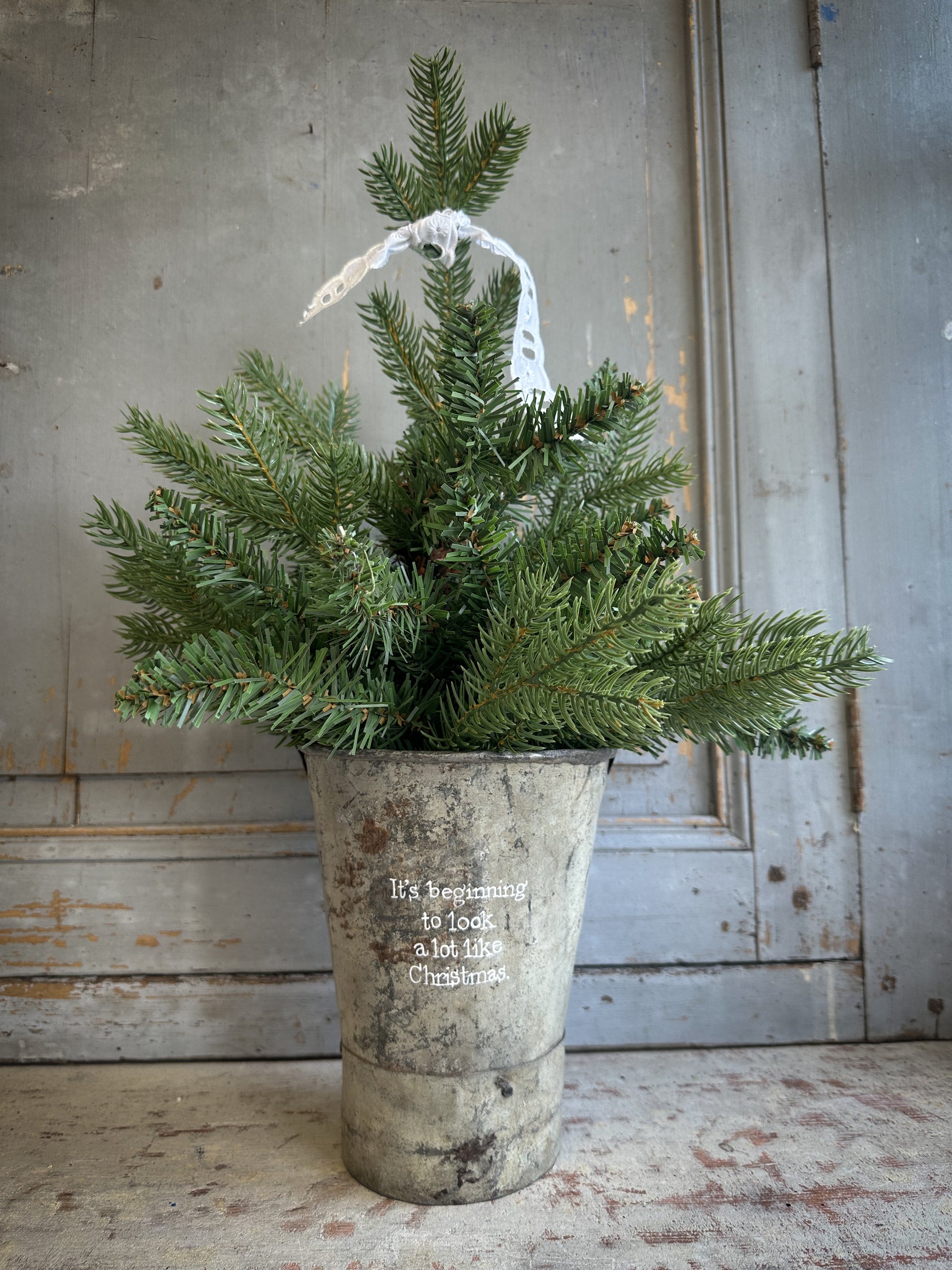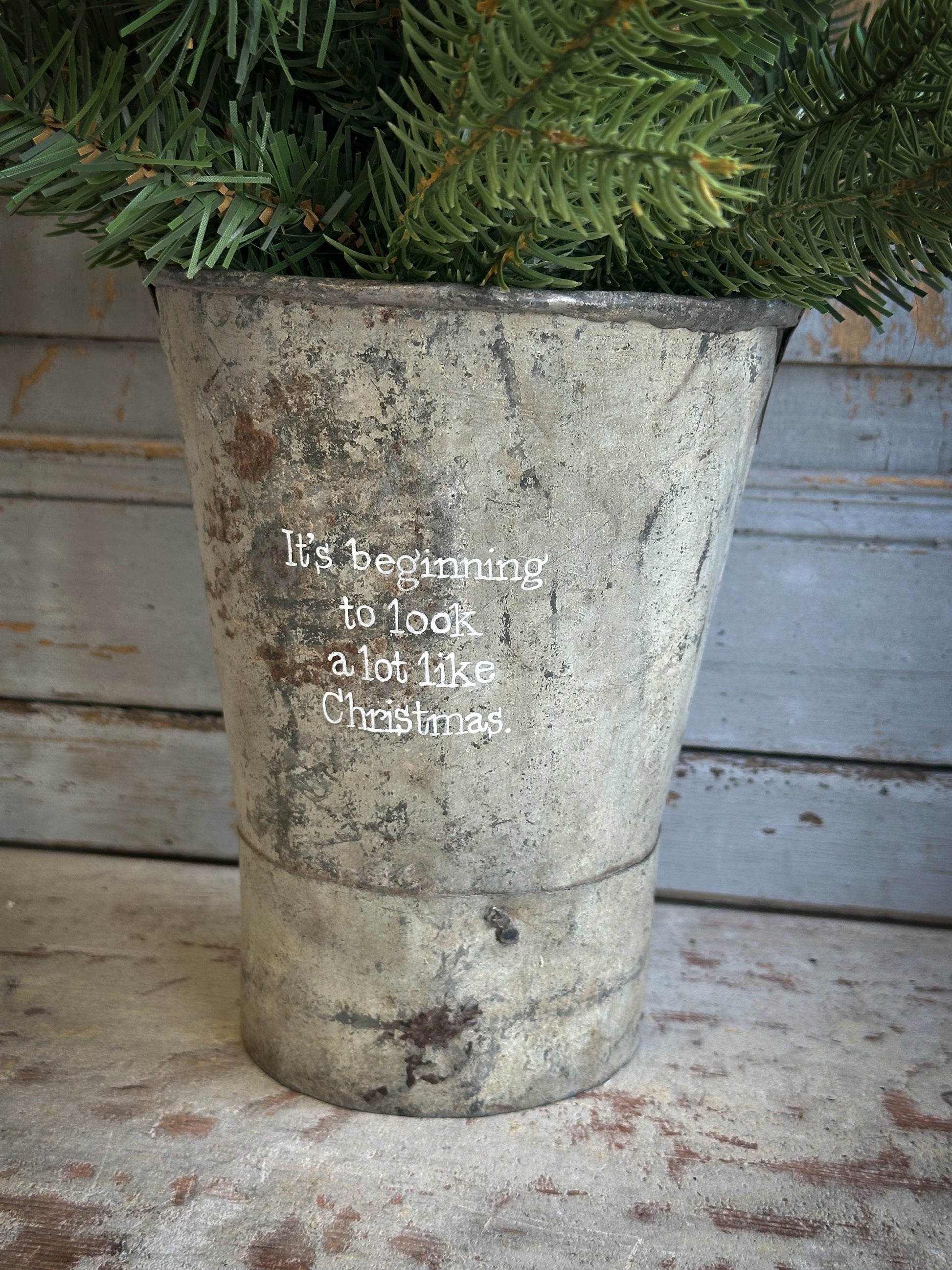 A Recycled Metal Mini Christmas Tree Bucket With A Hand Painted Quote