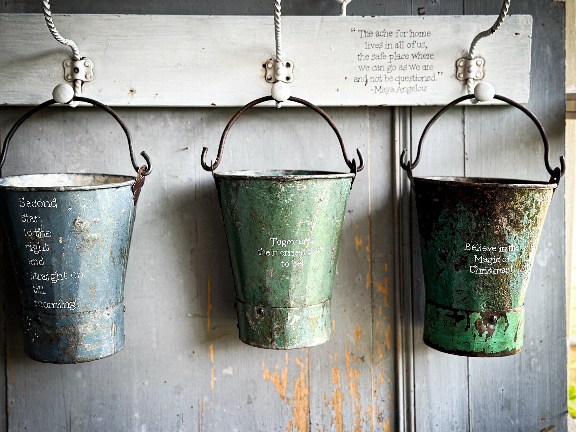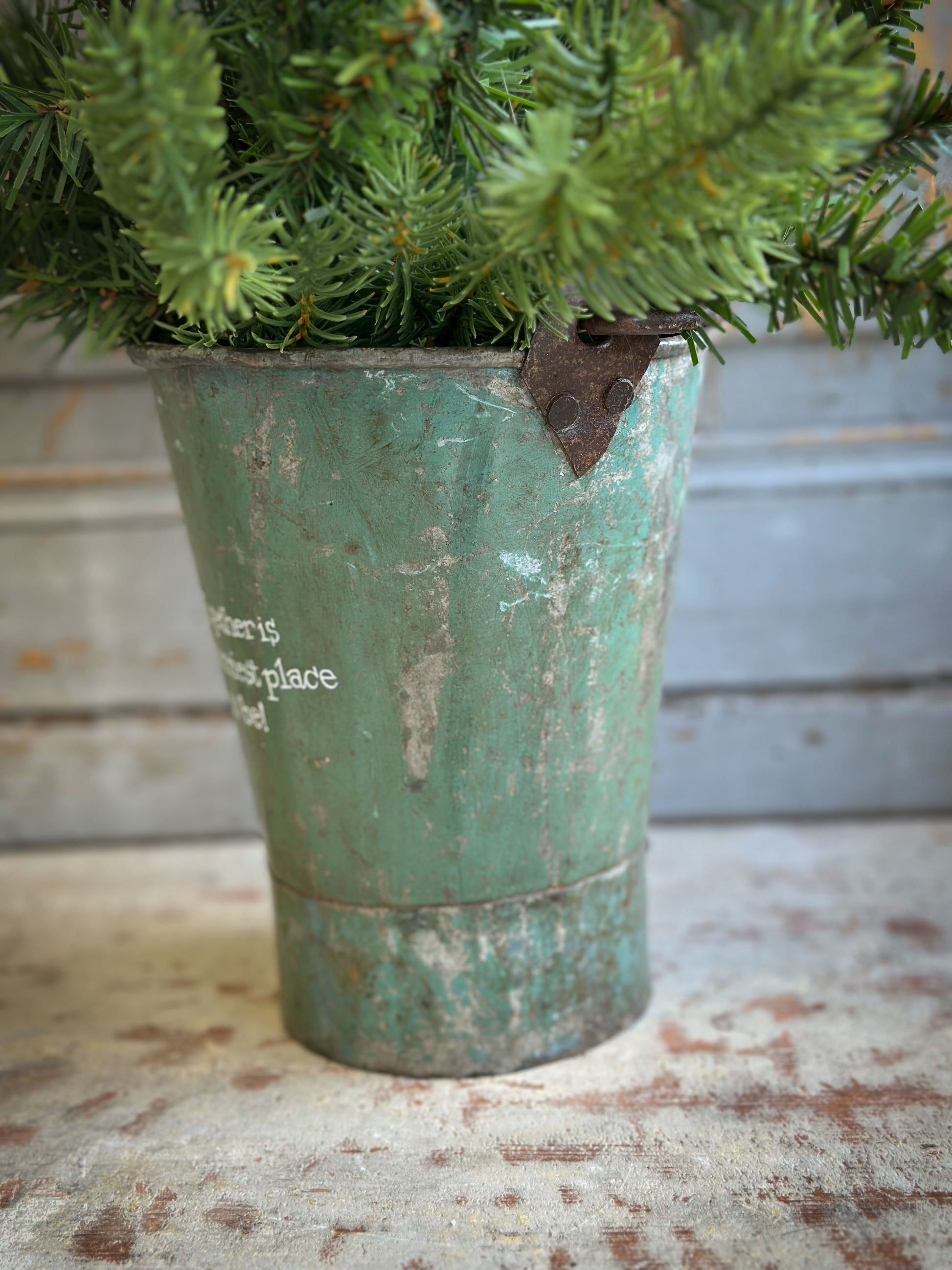 A Recycled Metal Mini Christmas Tree Bucket With A Hand Painted Quote