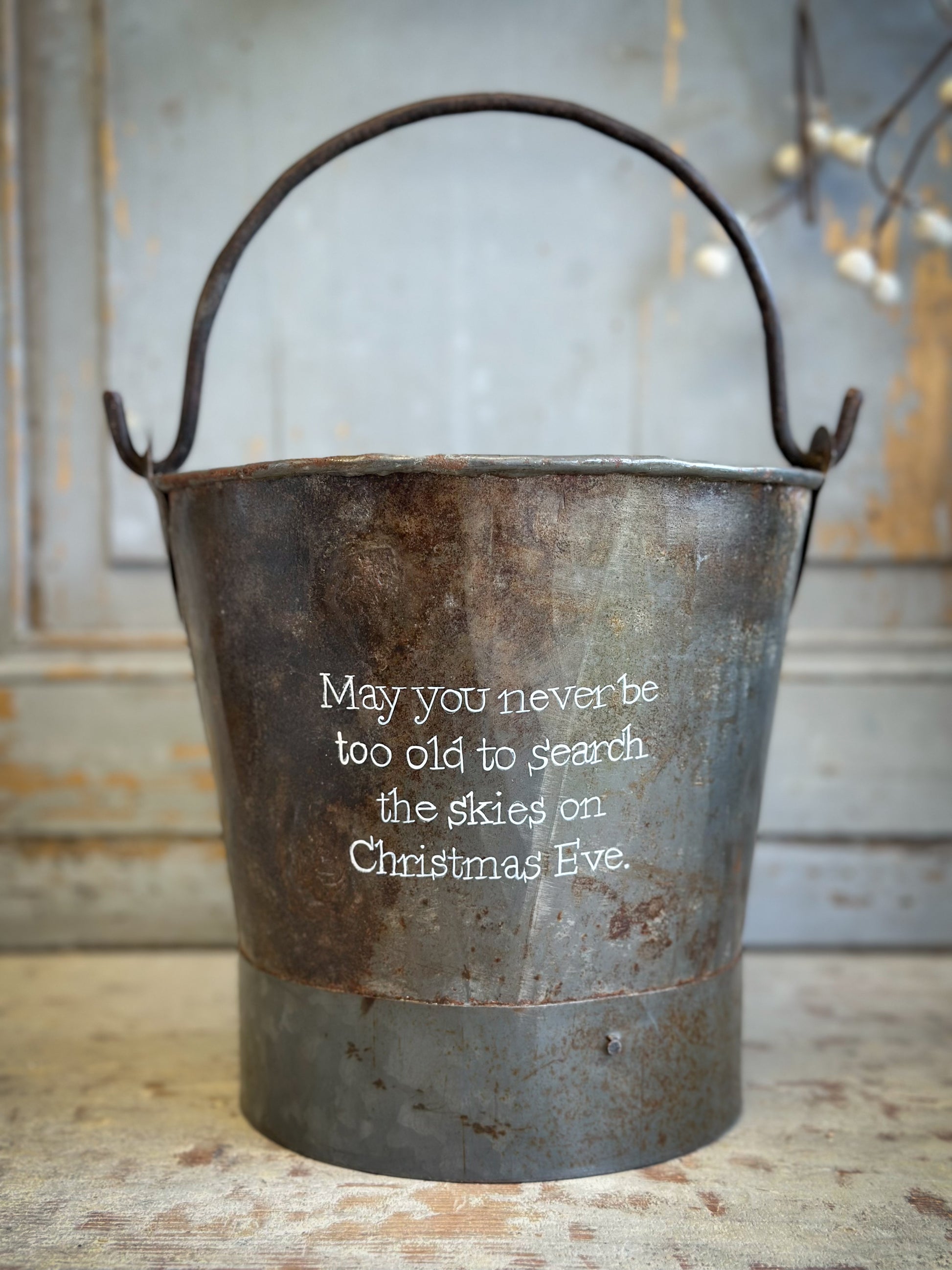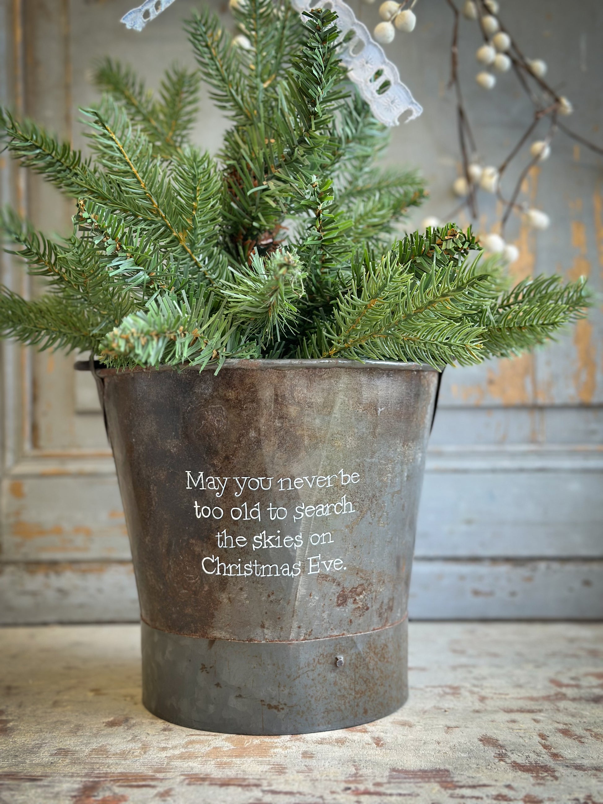 A Recycled Metal Small Christmas Tree Bucket With A Hand Painted Quote
