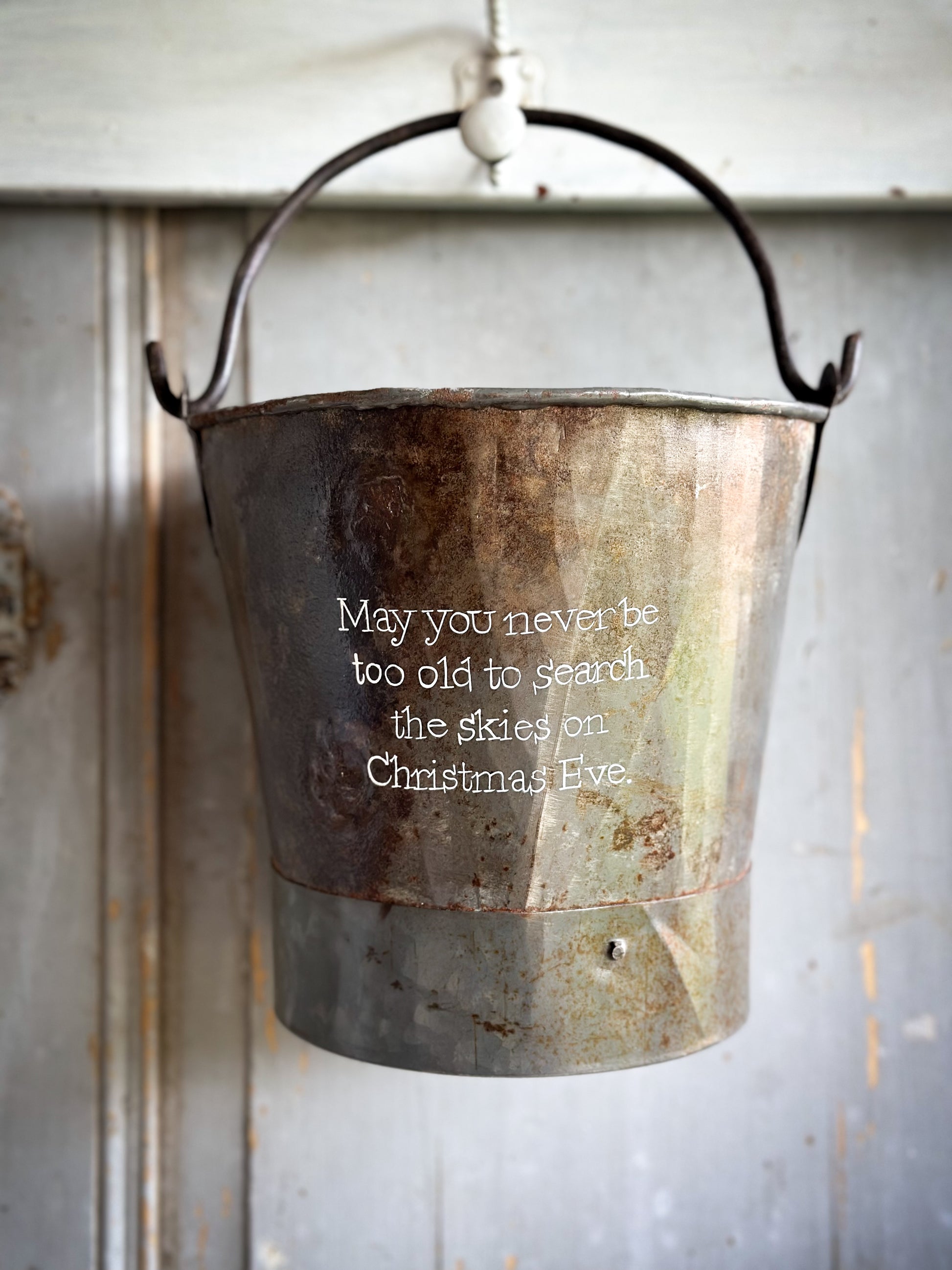 A recycled metal chippy paint small Christmas Tree bucket, hand painted using traditional sign writer’s techniques.