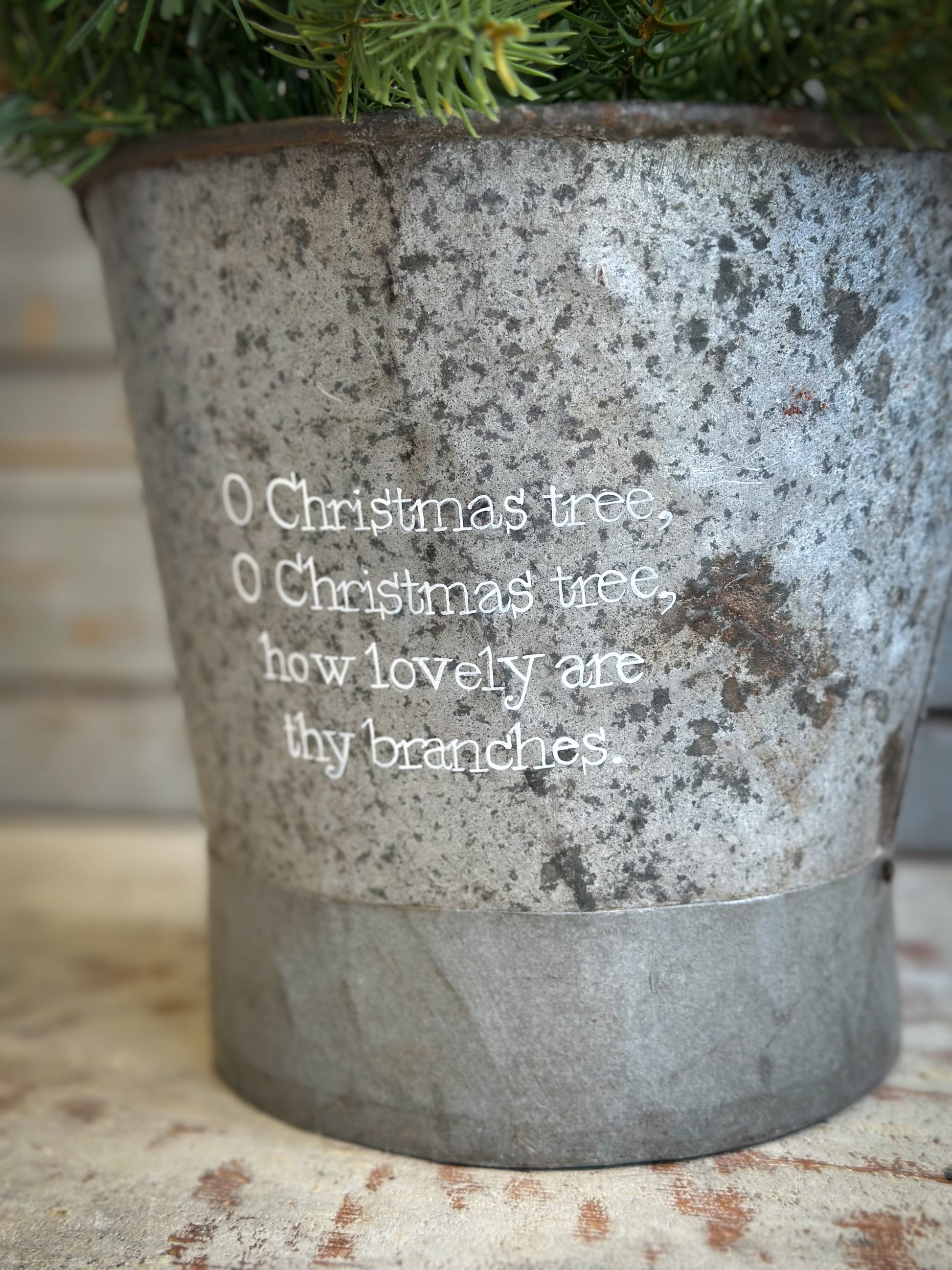 A Recycled Metal Small Christmas Tree Bucket With A Hand Painted Quote