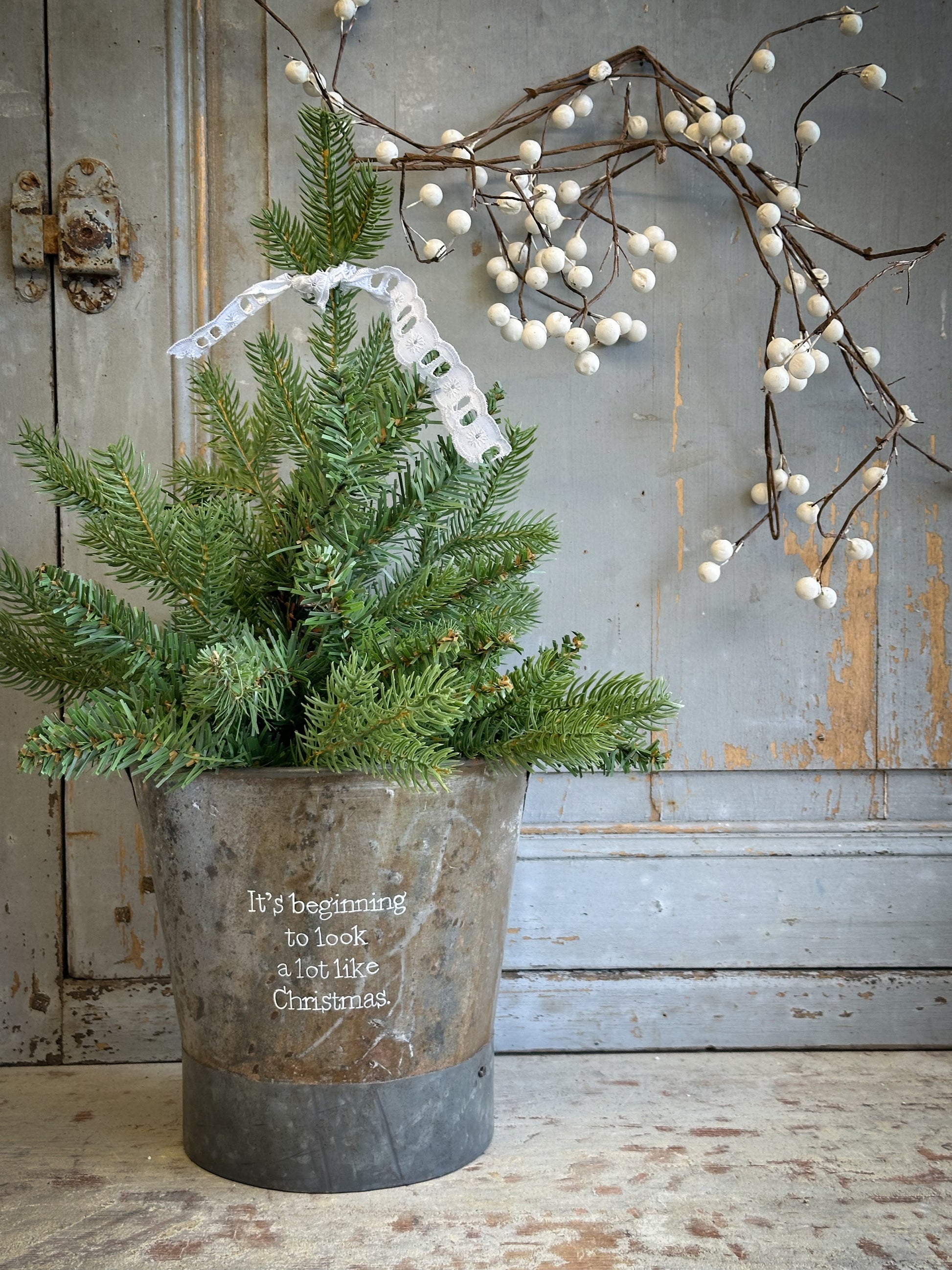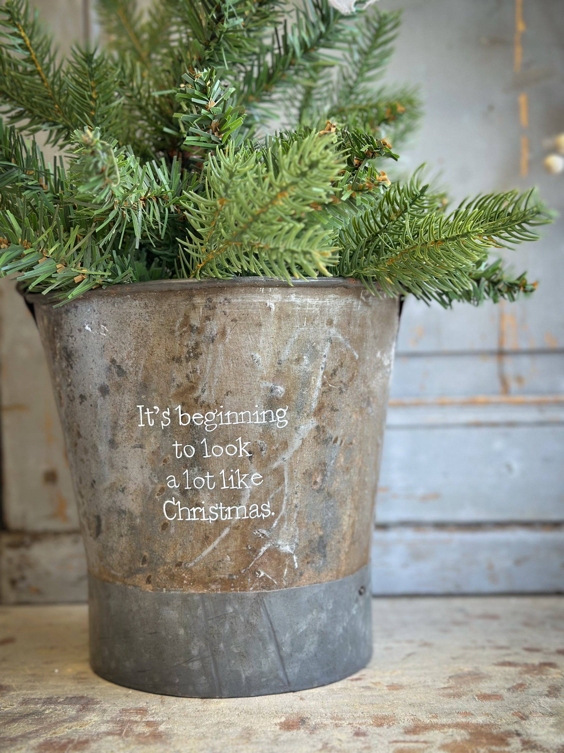 A Recycled Metal Small Christmas Tree Bucket With A Hand Painted Quote