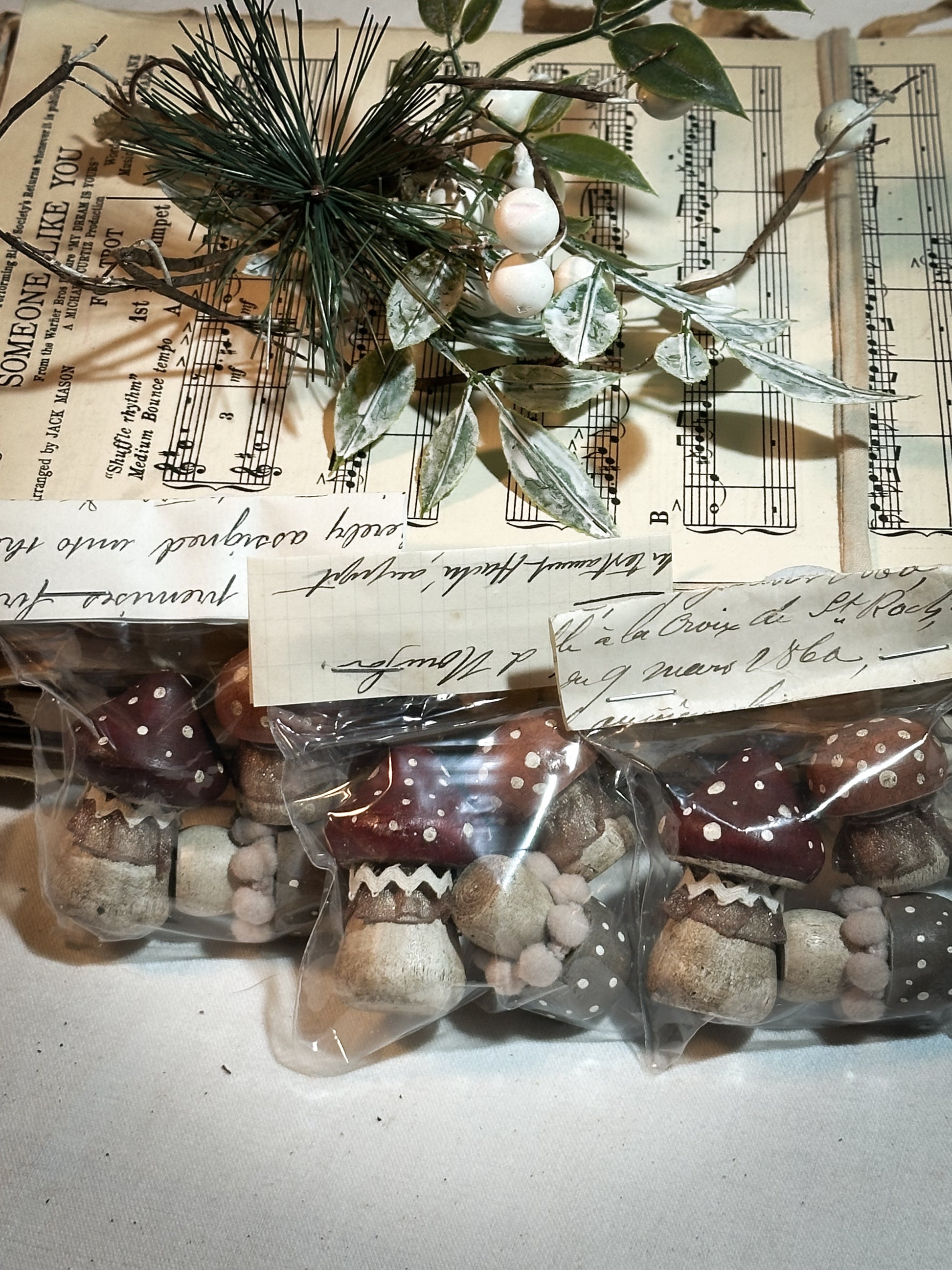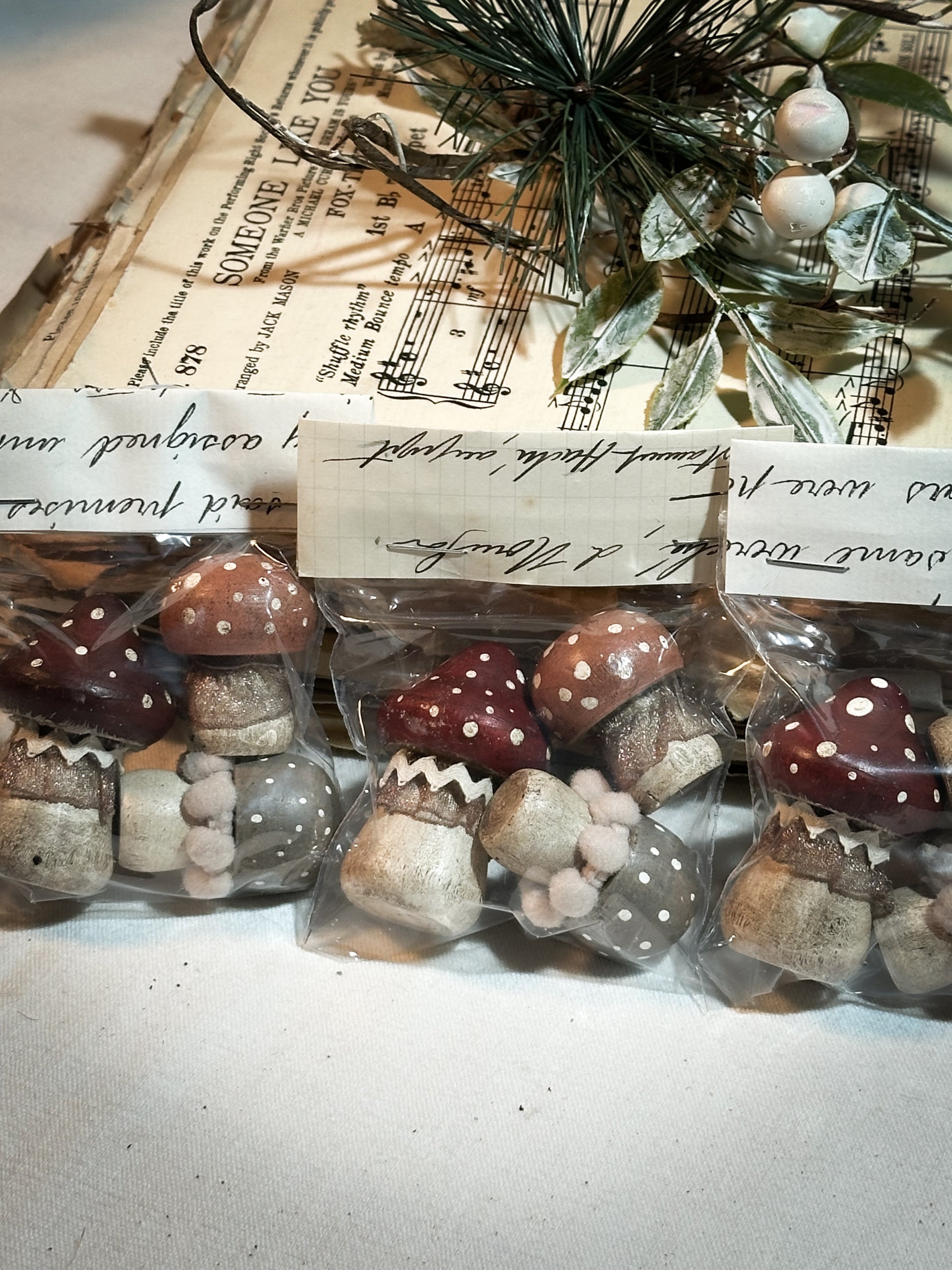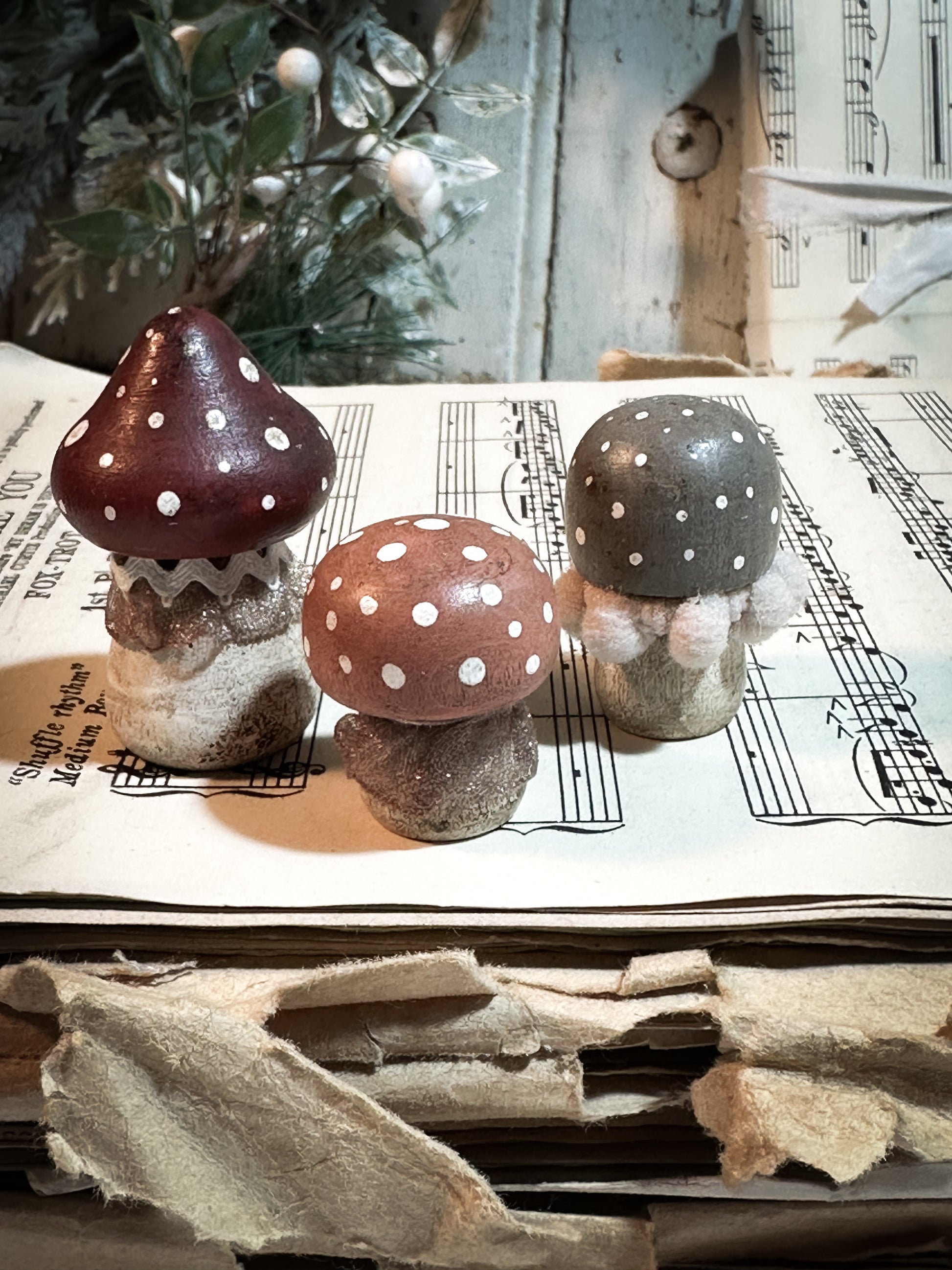 A set of three wooden hand painted and trimmed Christmas village toadstools in a presentation bag.