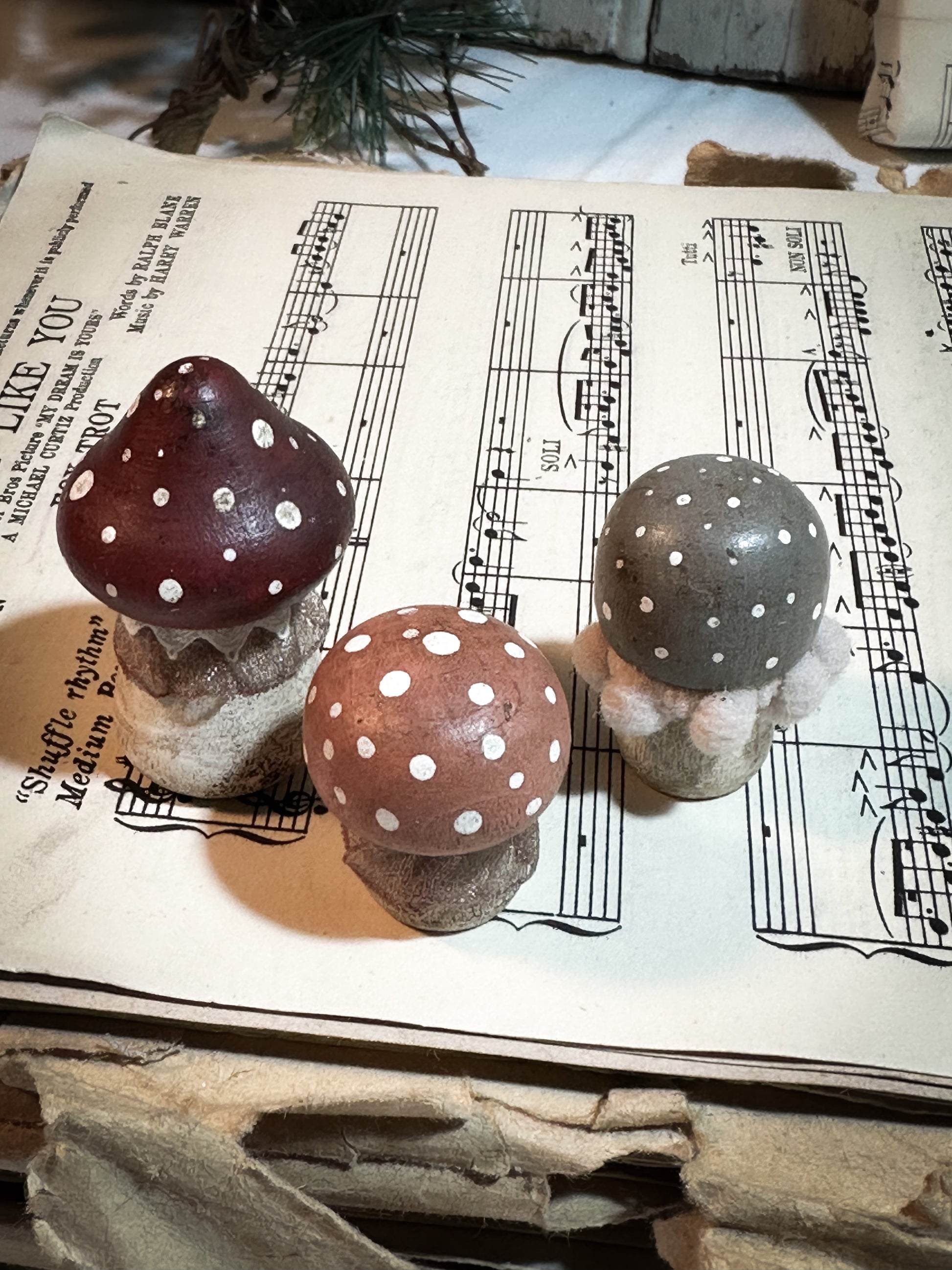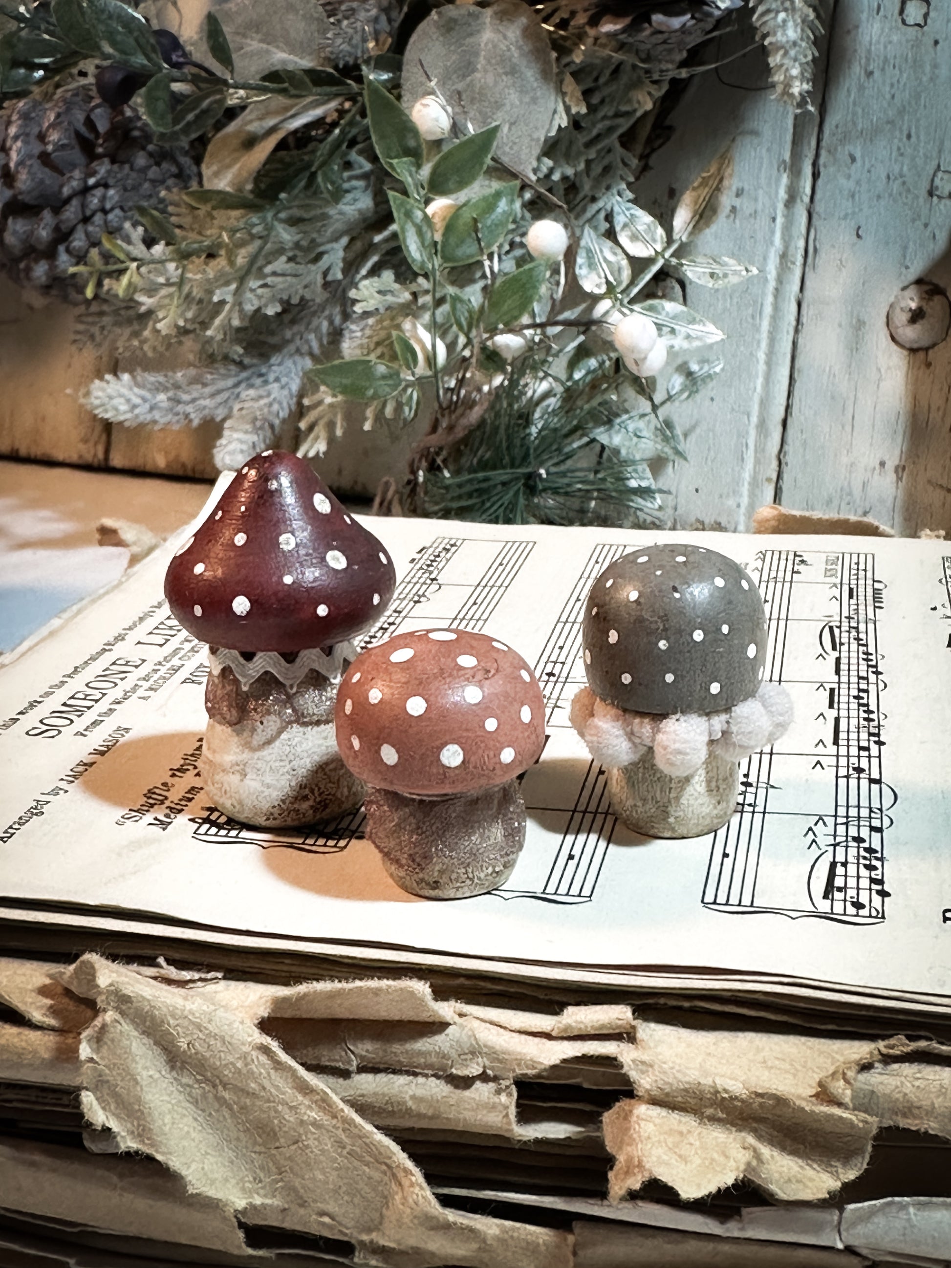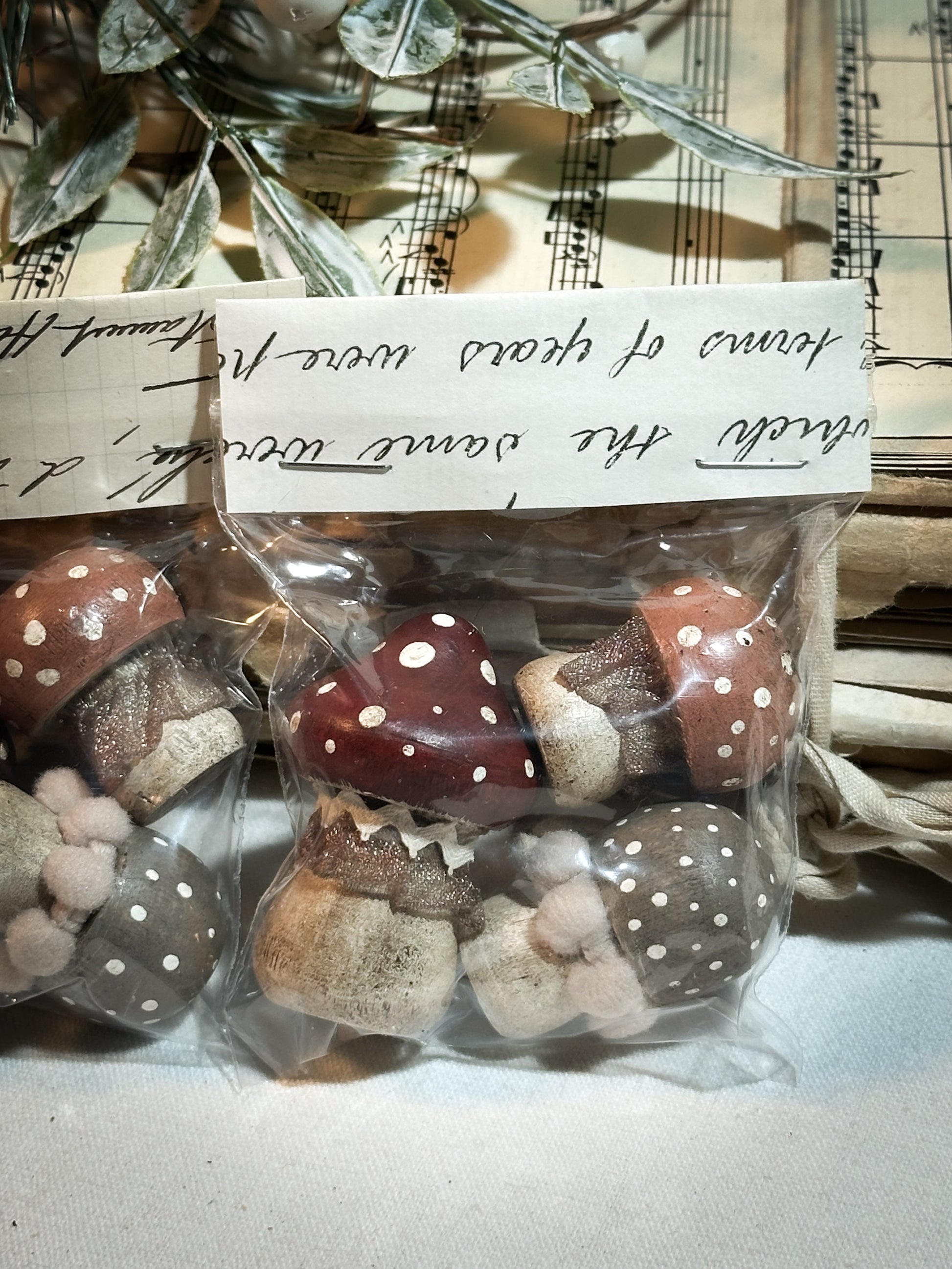 A set of three wooden hand painted and trimmed Christmas village toadstools in a presentation bag.