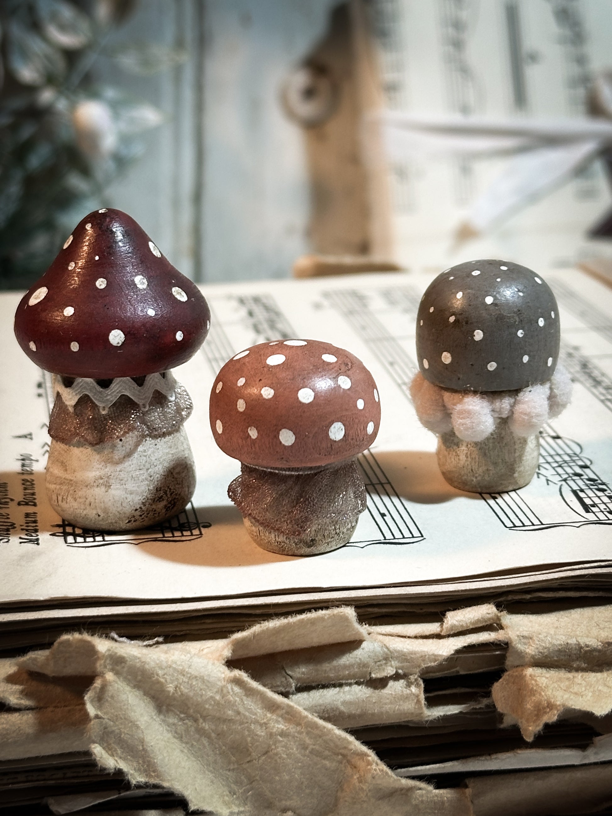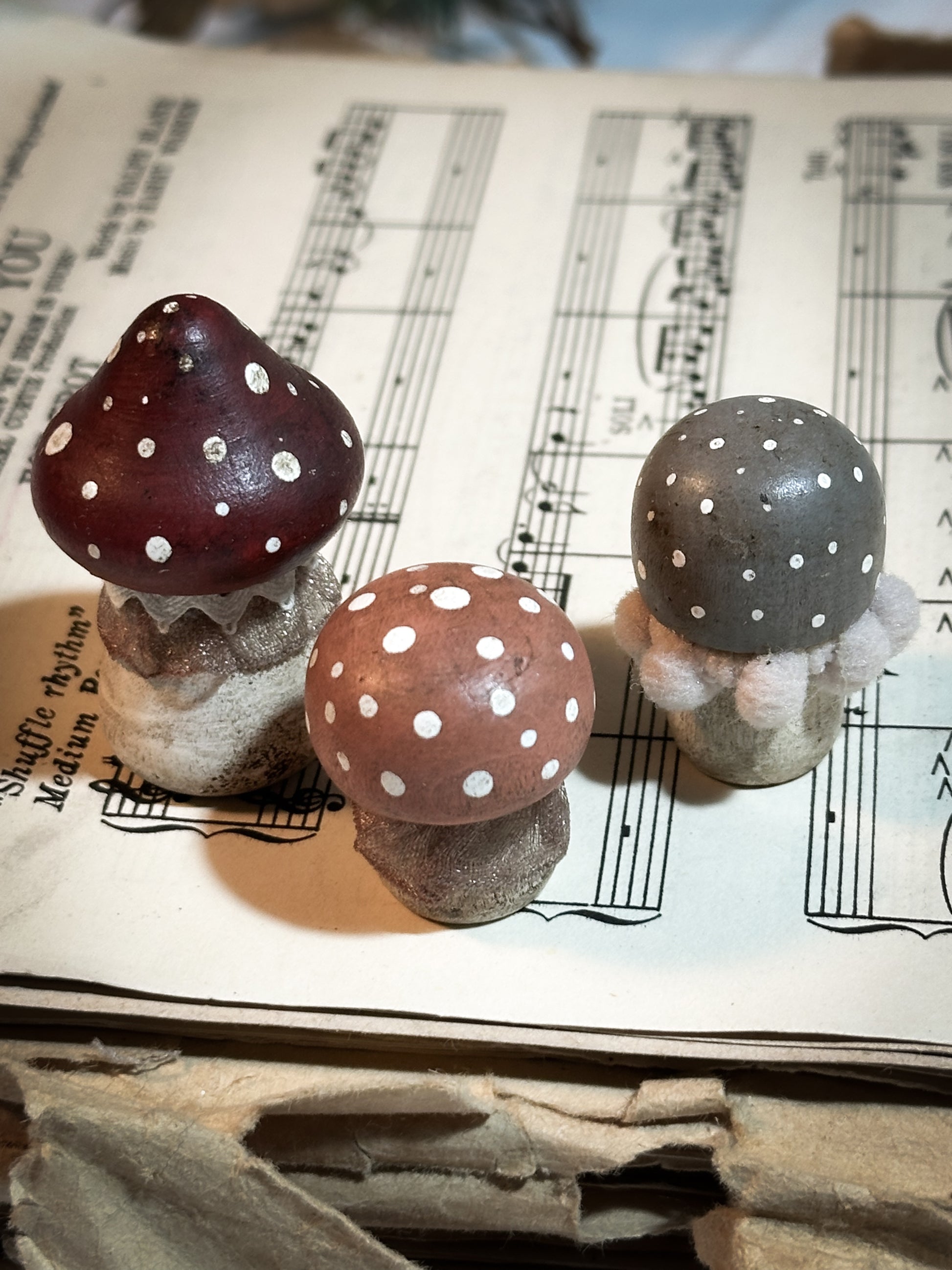 A set of three wooden hand painted and trimmed Christmas village toadstools