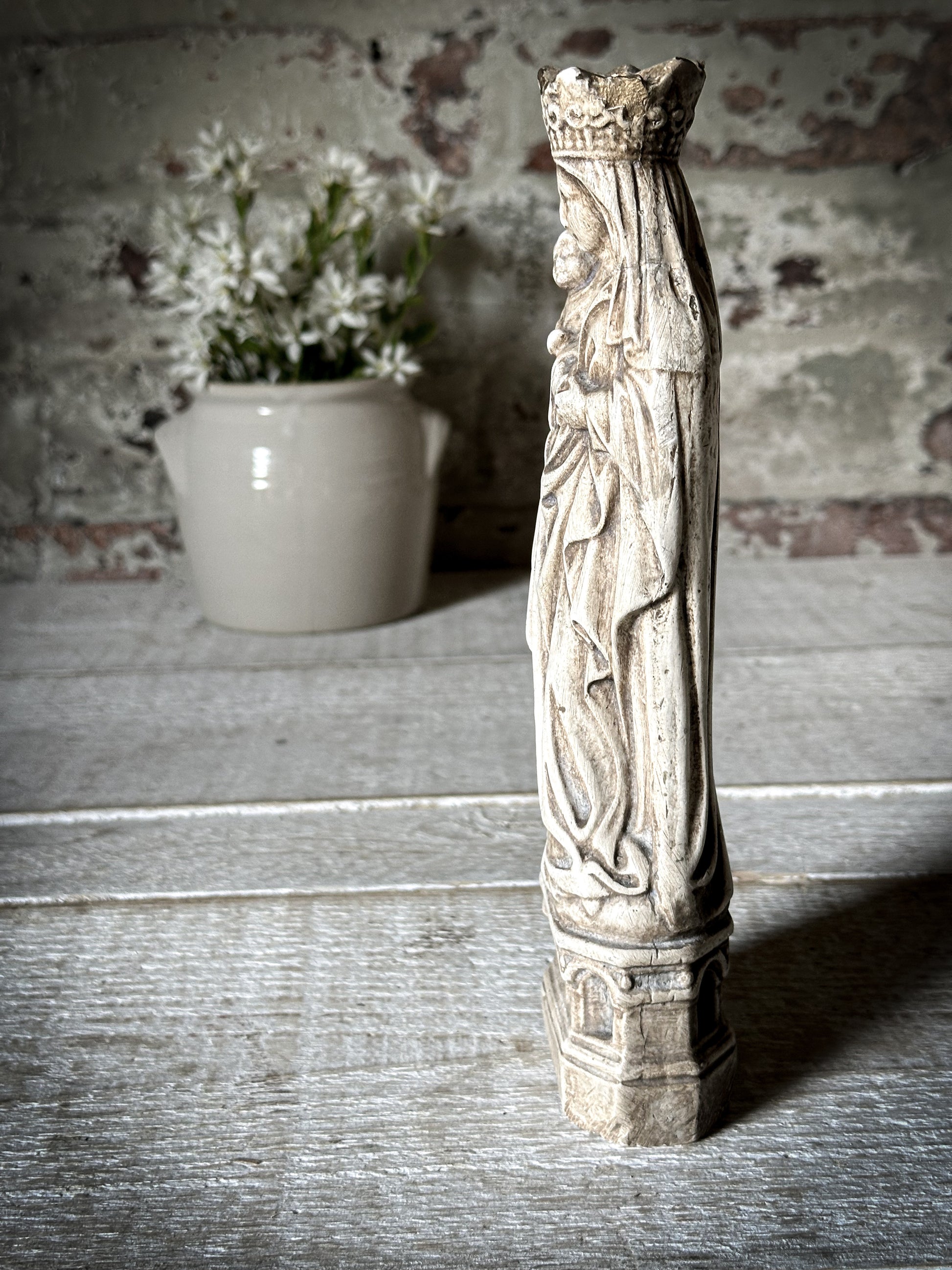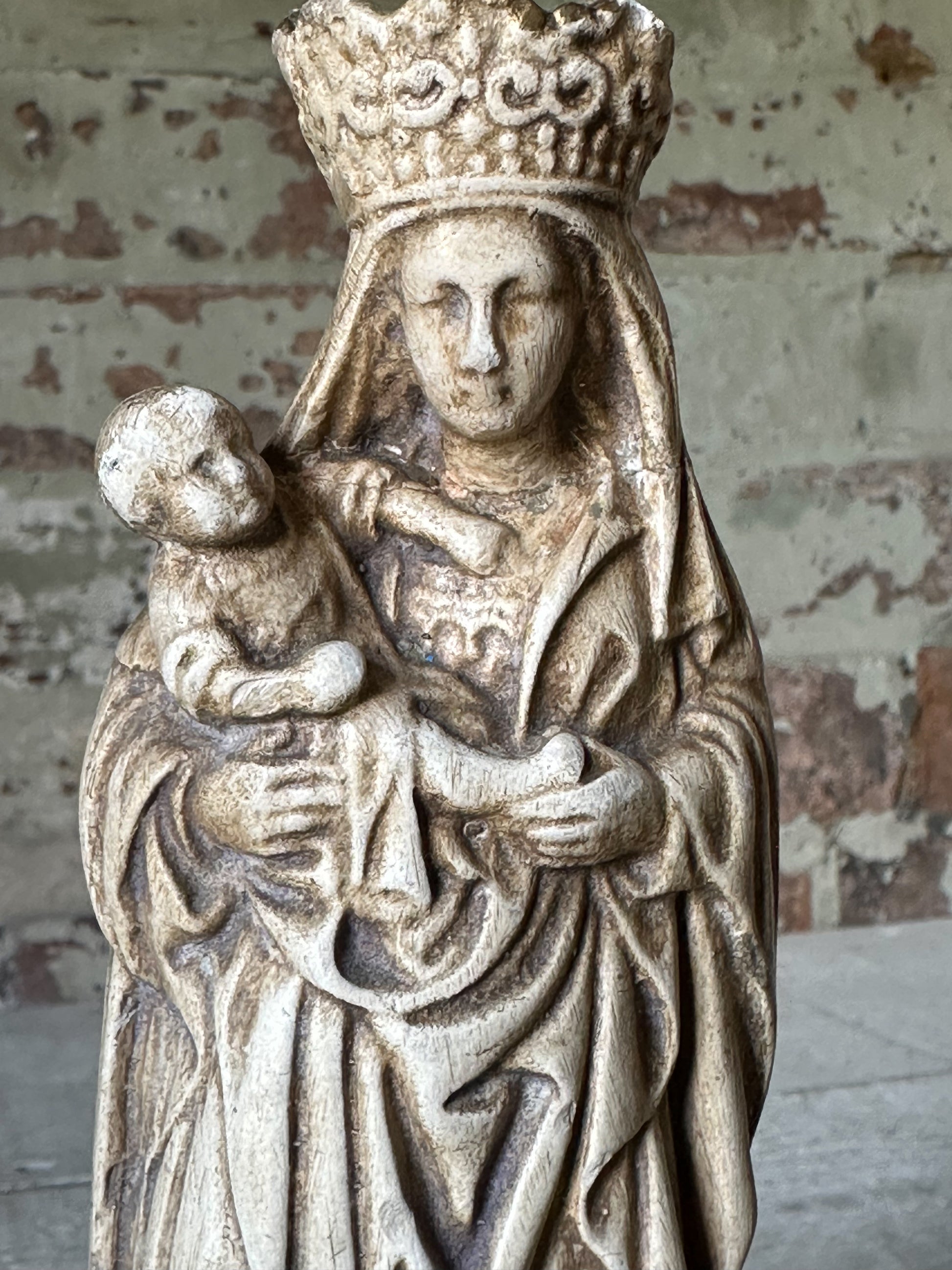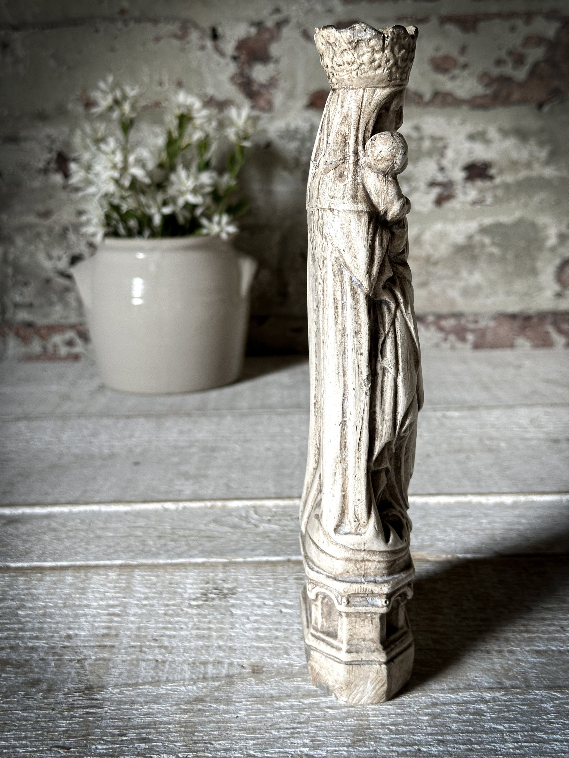 An Antique French Chalk Ware Religious Statue of the Madonna and Child