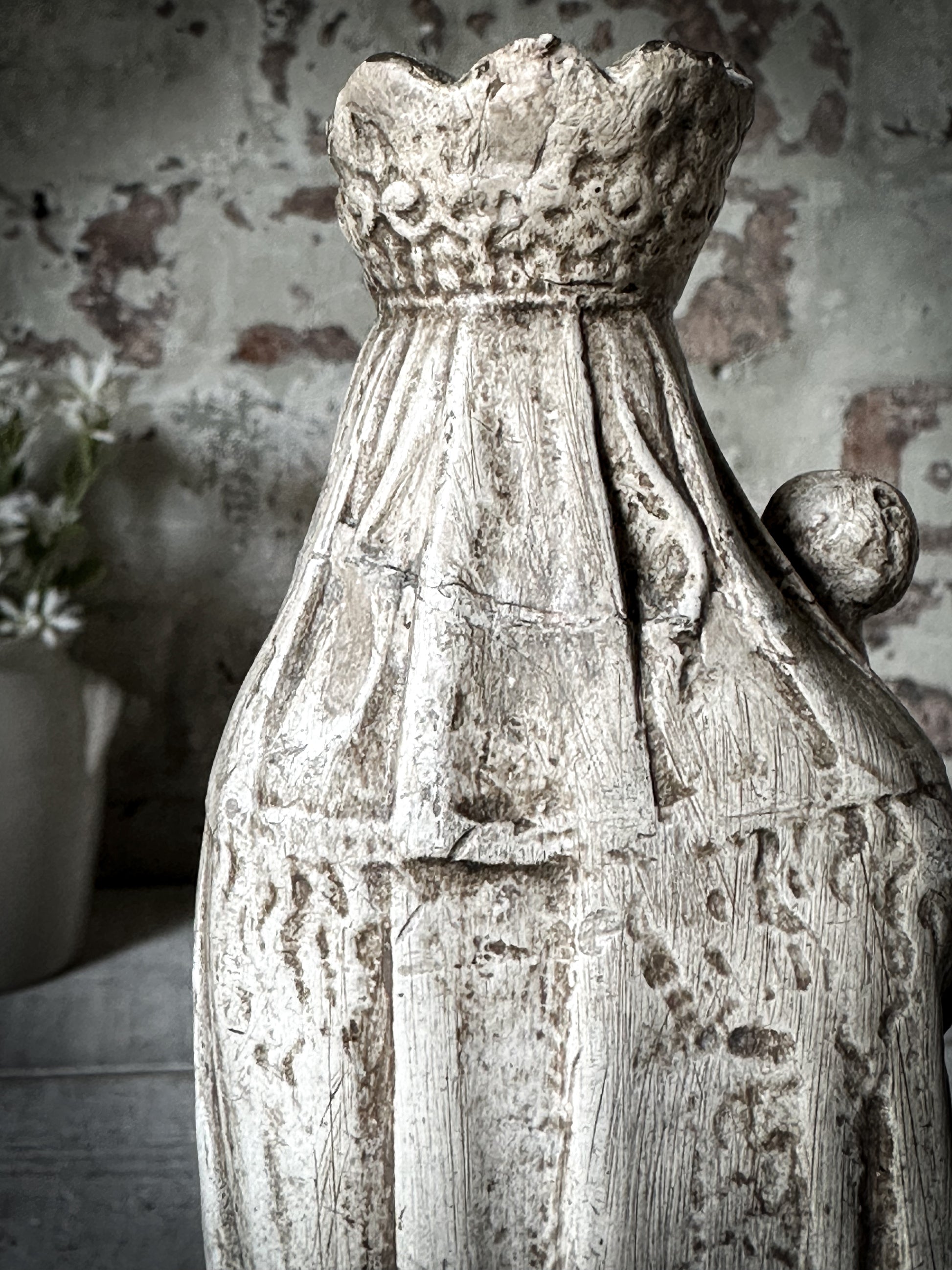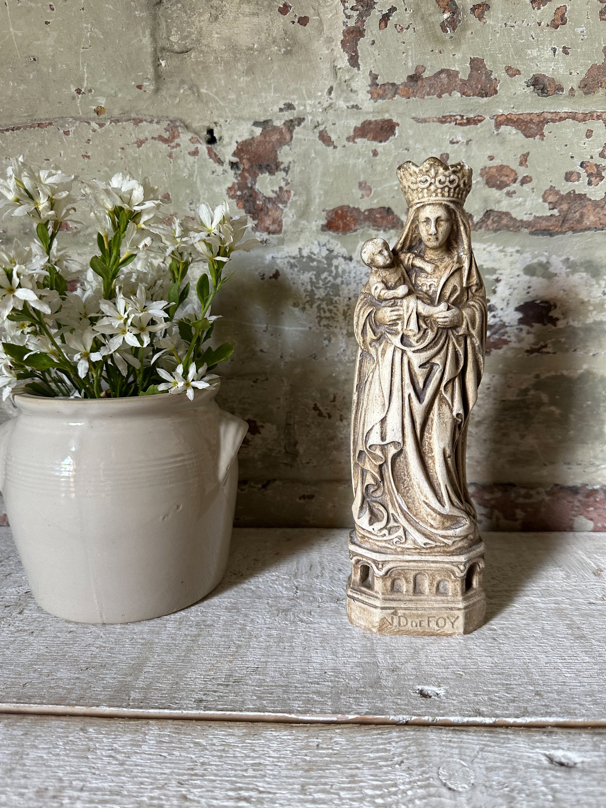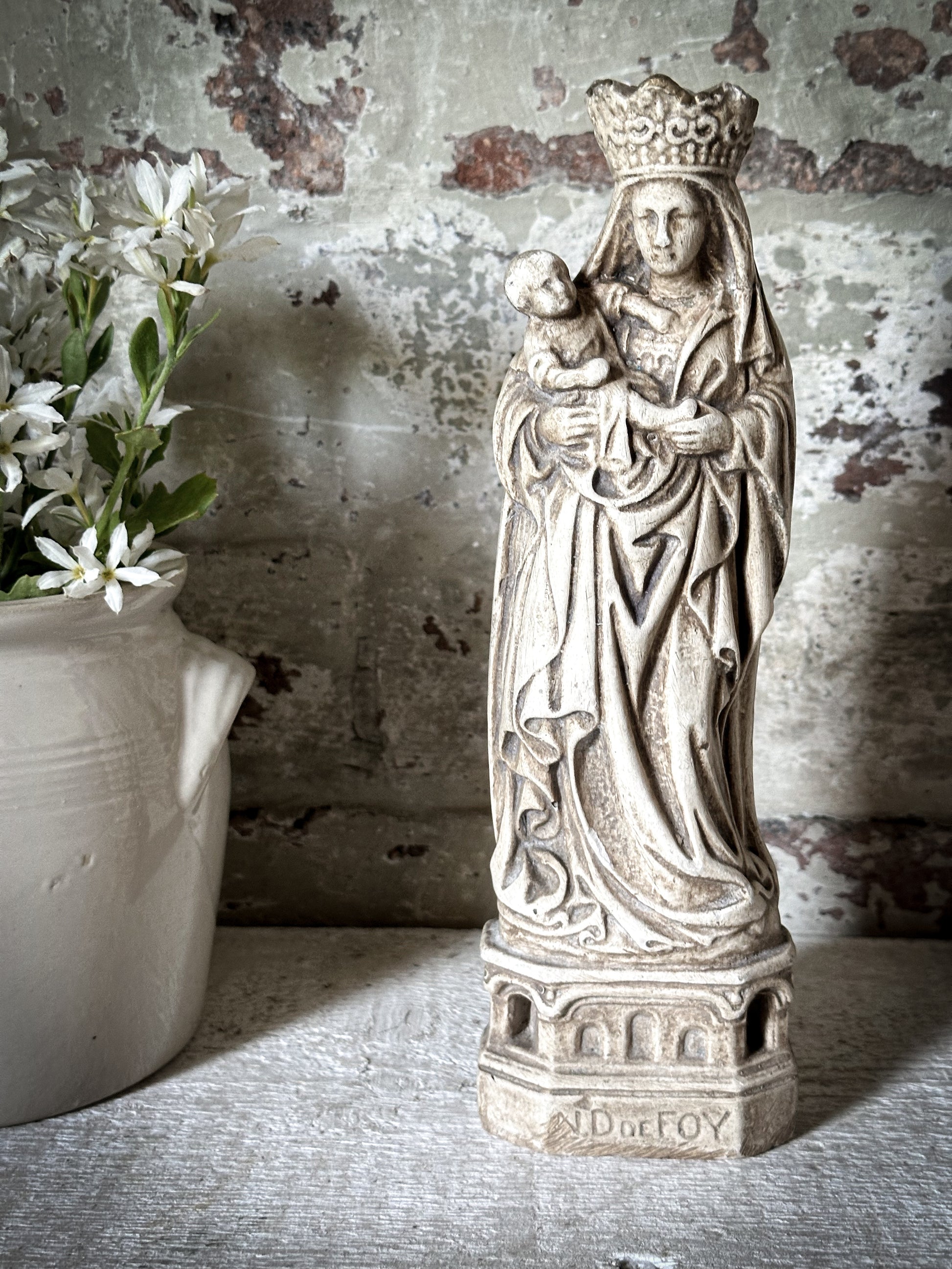 A beautiful antique French religious statue of the Madonna and Child.