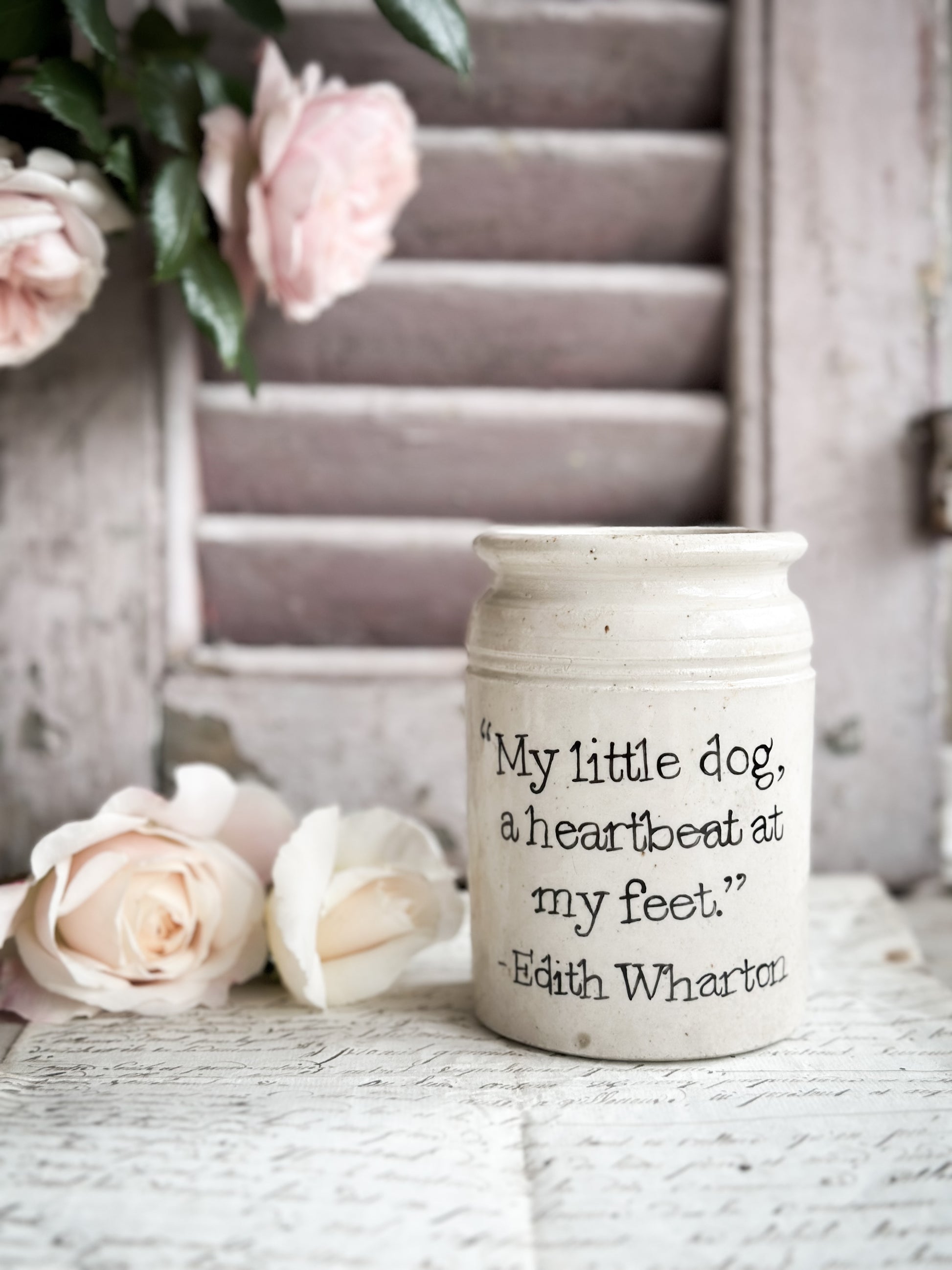 A Victorian unearthed stoneware pottery Jar with a hand painted quote.