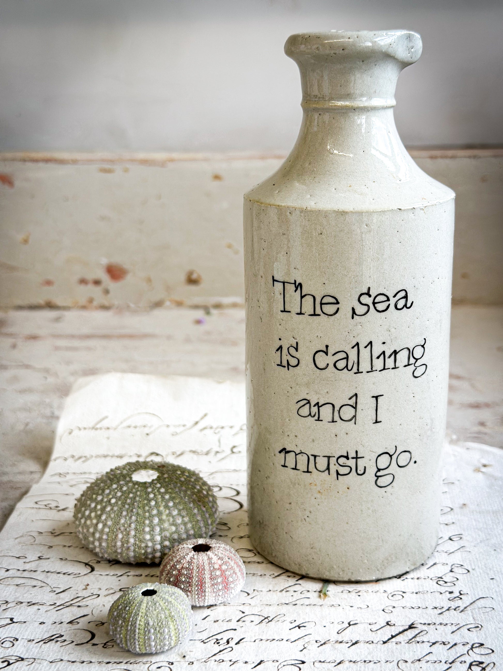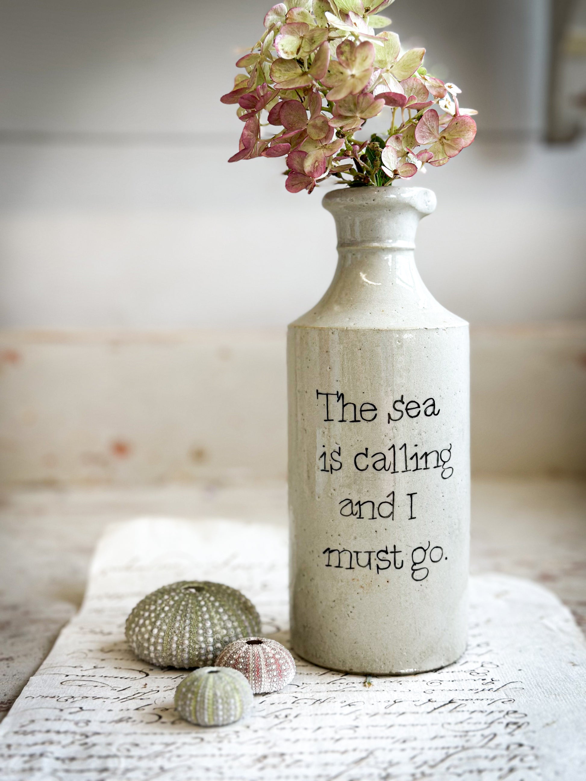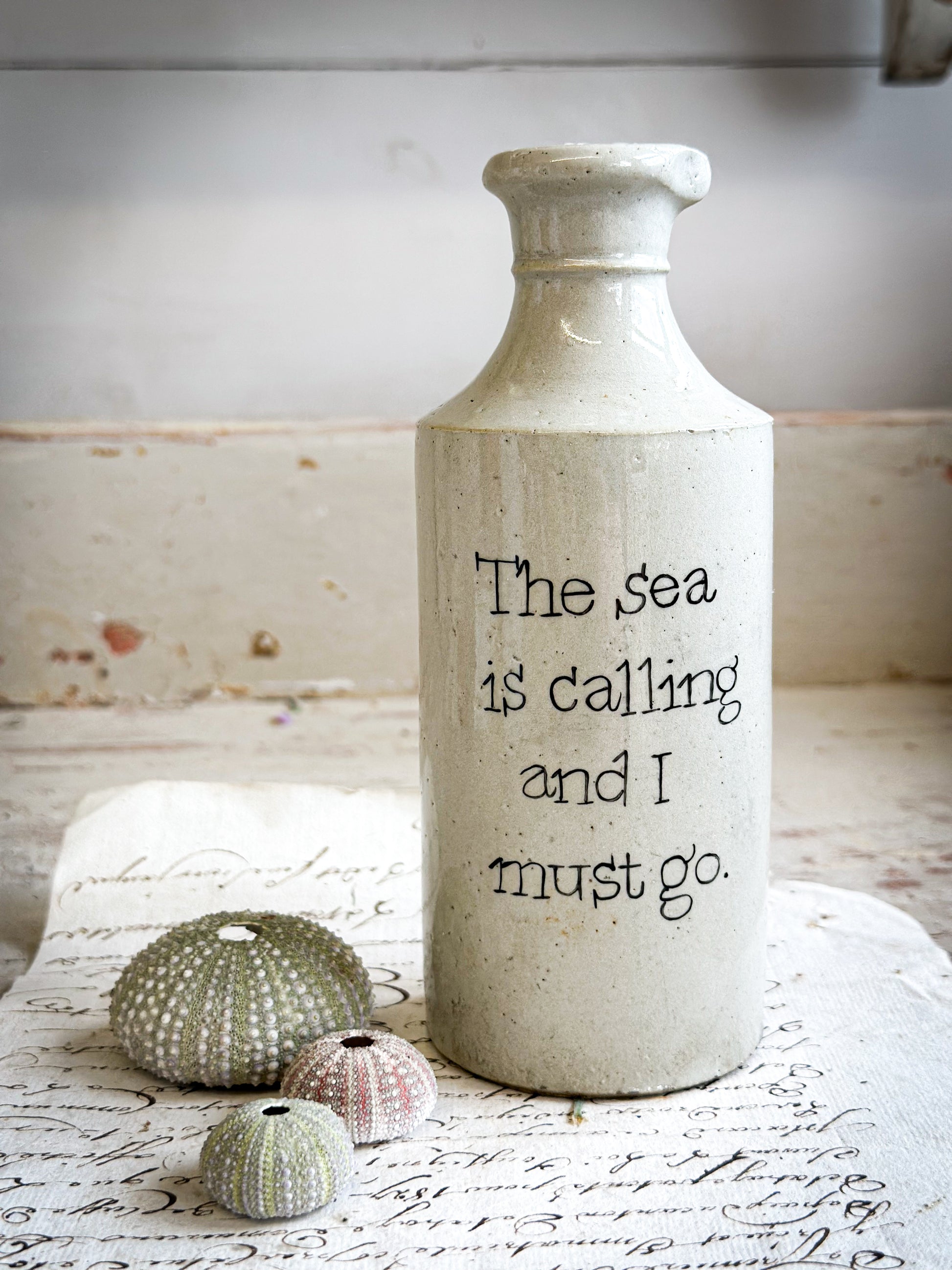 A Victorian unearthed stoneware pottery bottle with a hand painted quote.