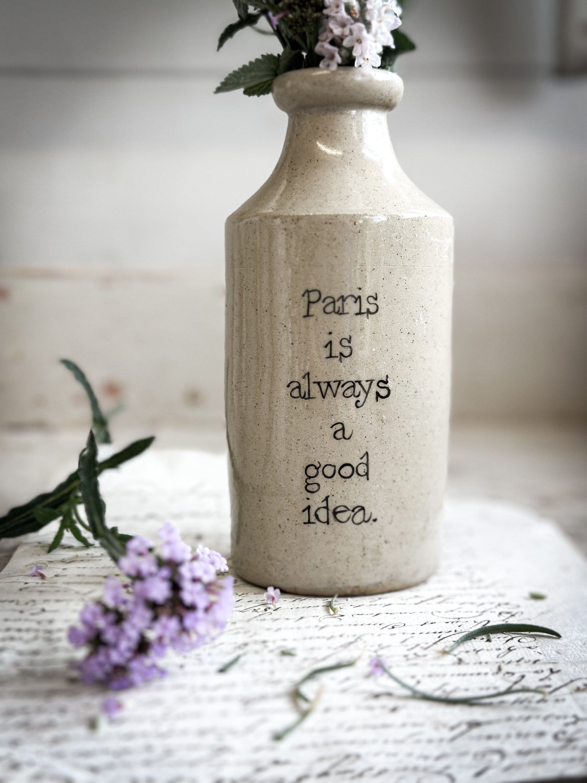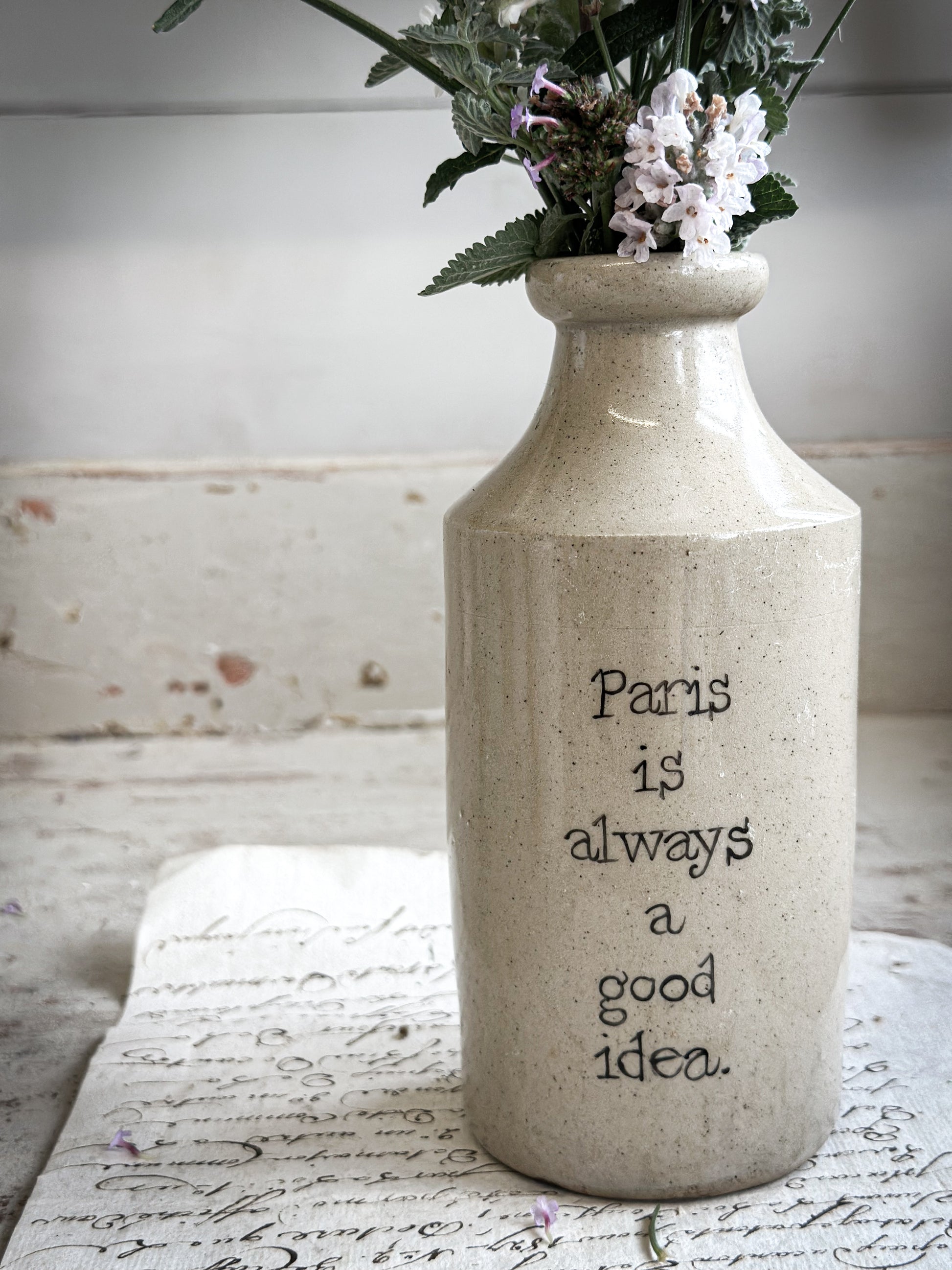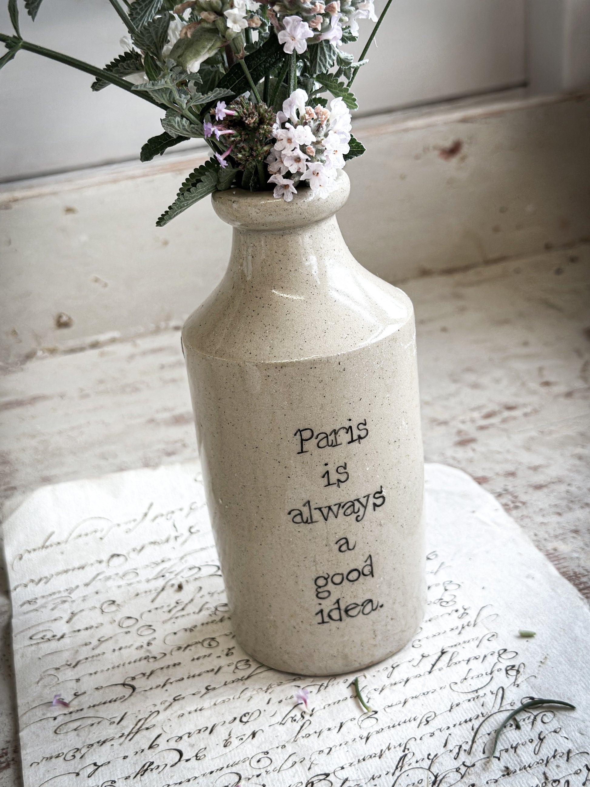 A Victorian unearthed stoneware pottery bottle with a hand painted quote.