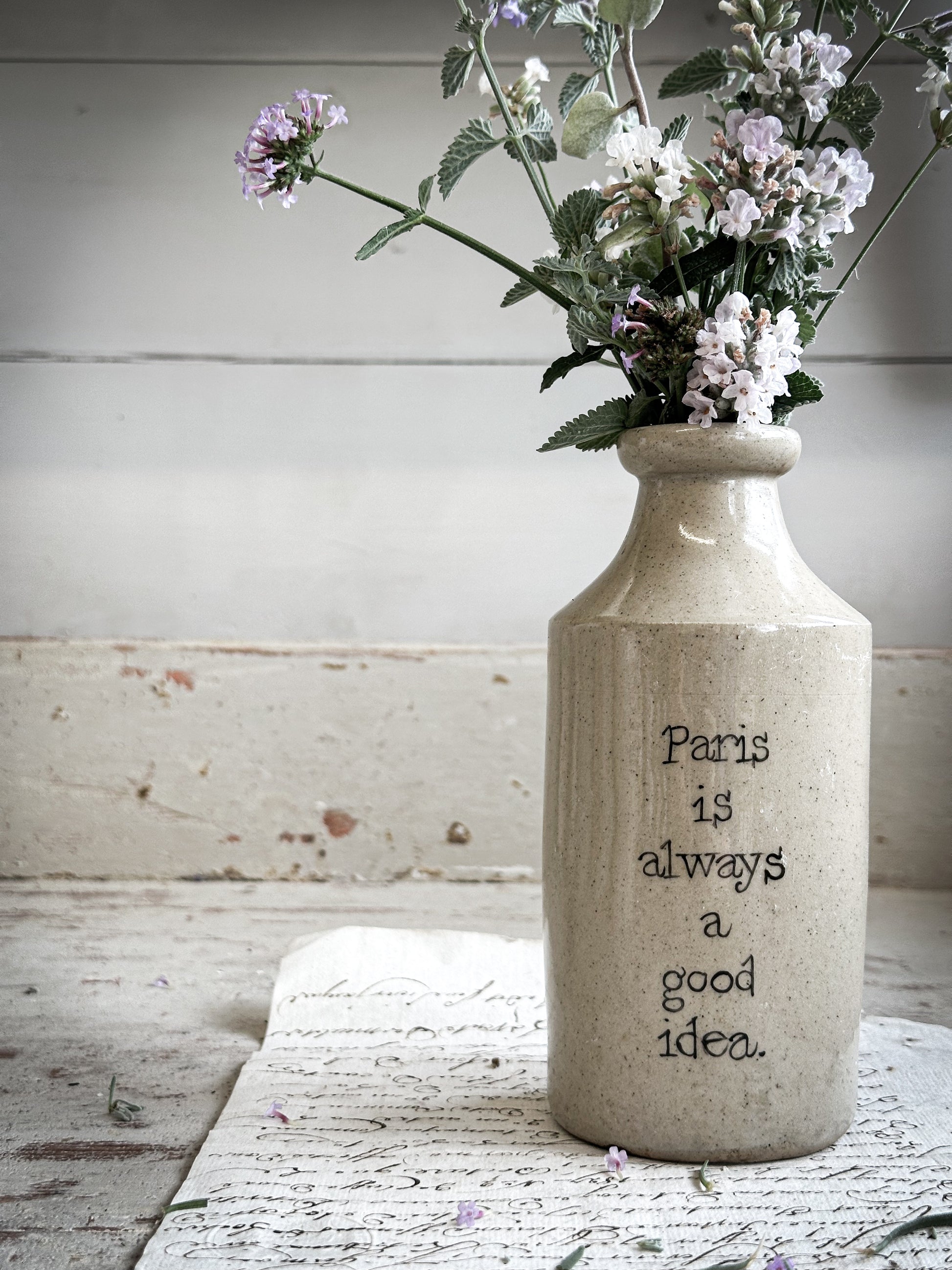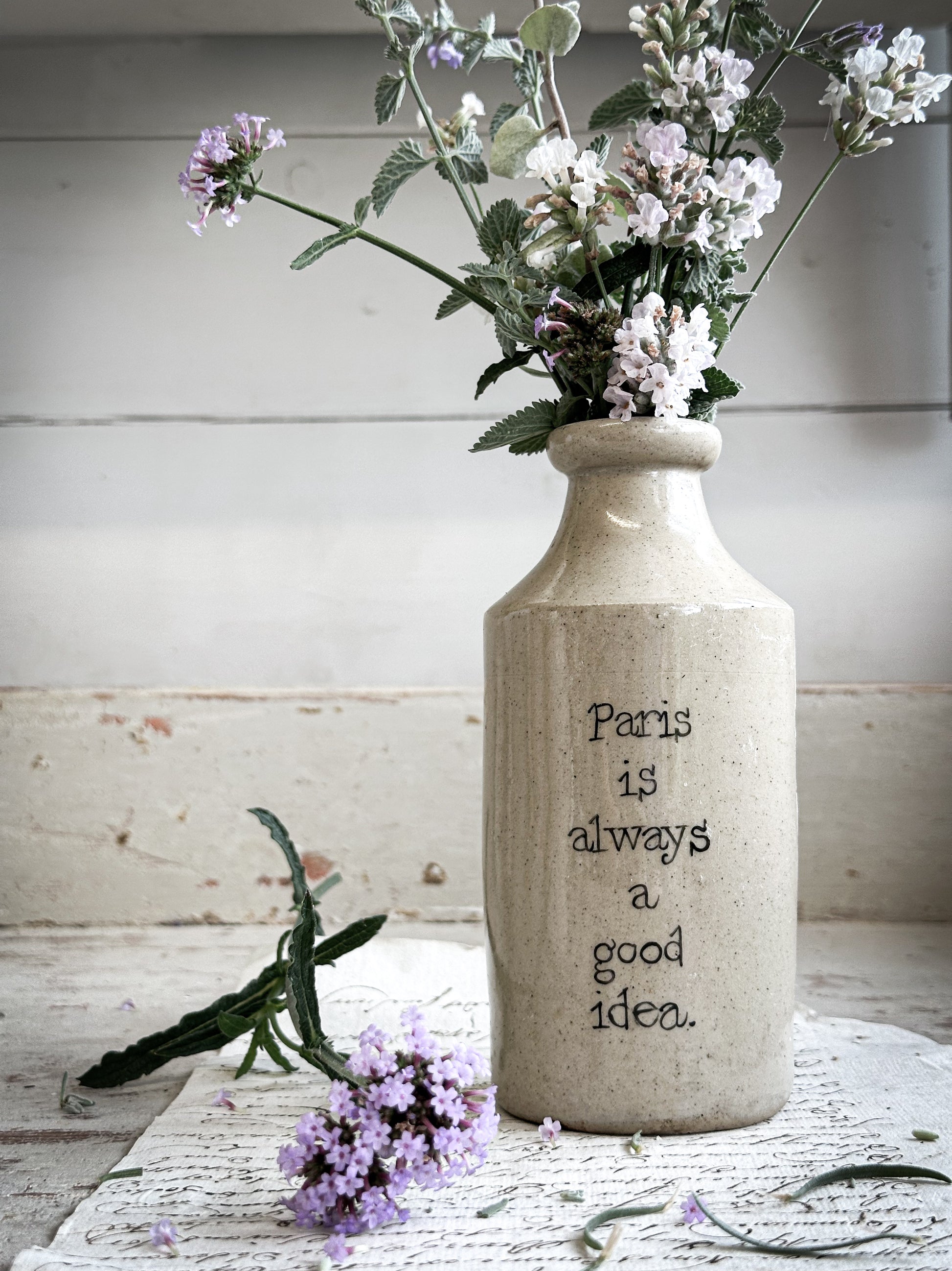 A Victorian unearthed short stoneware pottery bottle with a hand painted quote