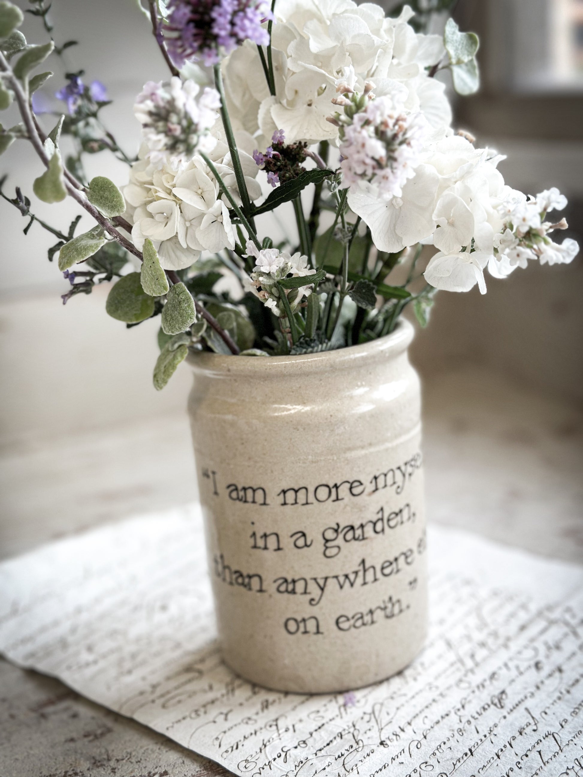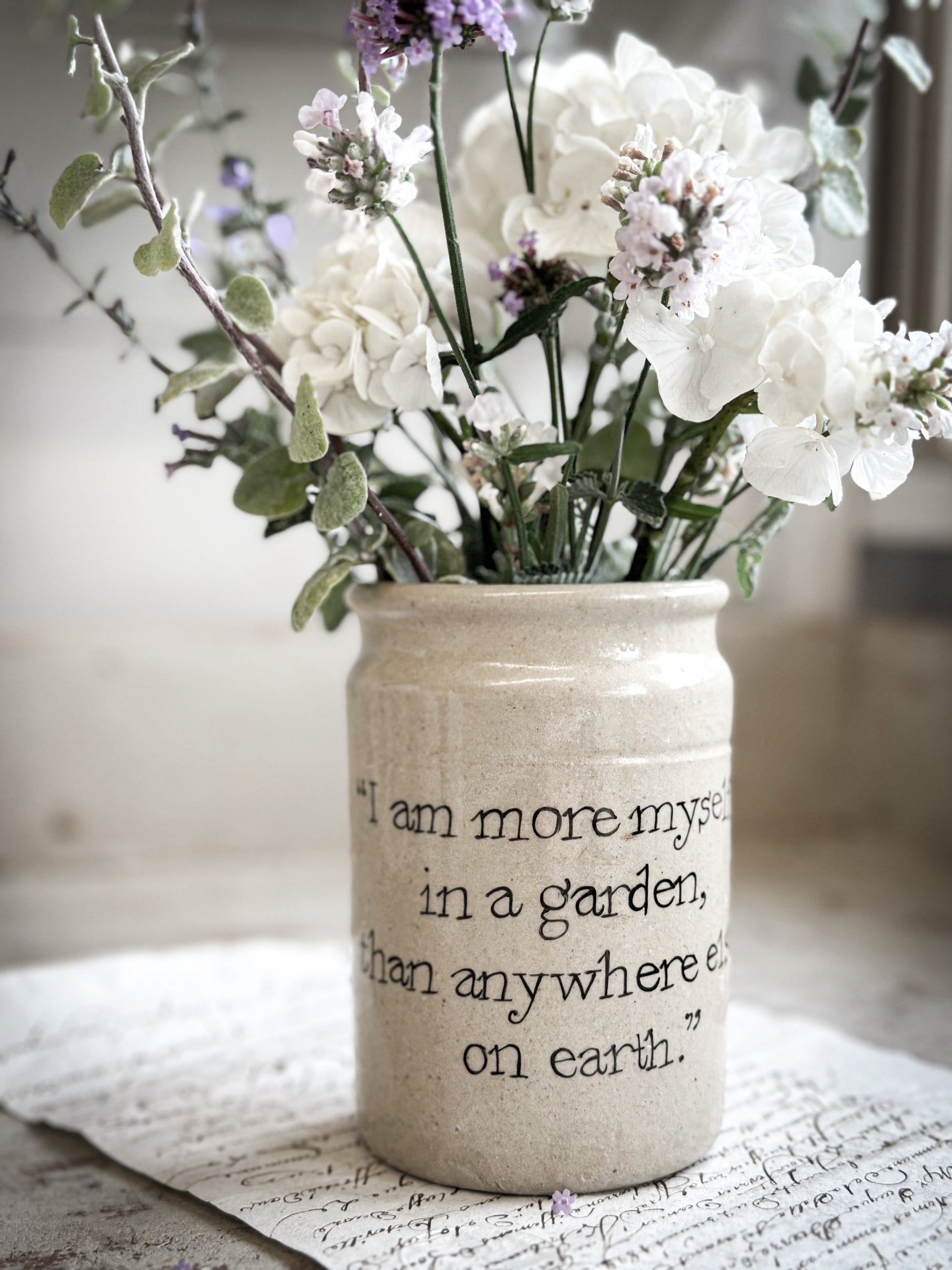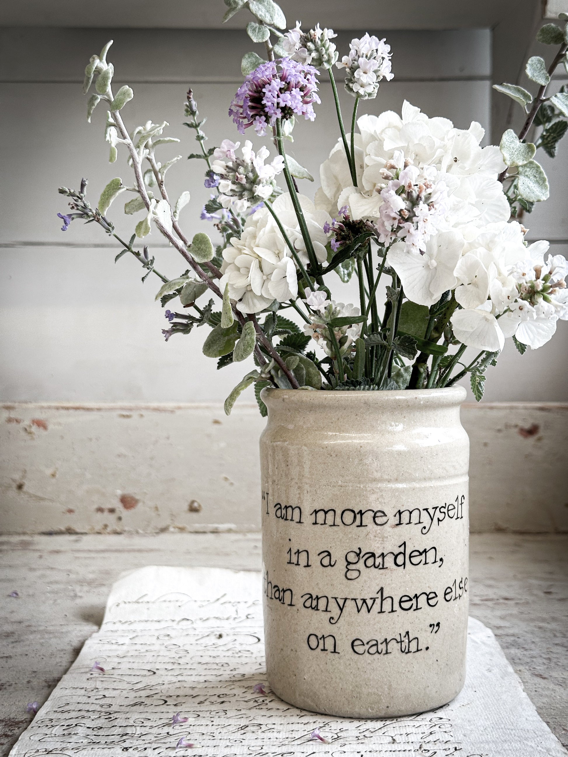 A Victorian unearthed short stoneware pottery jar with a hand painted quote