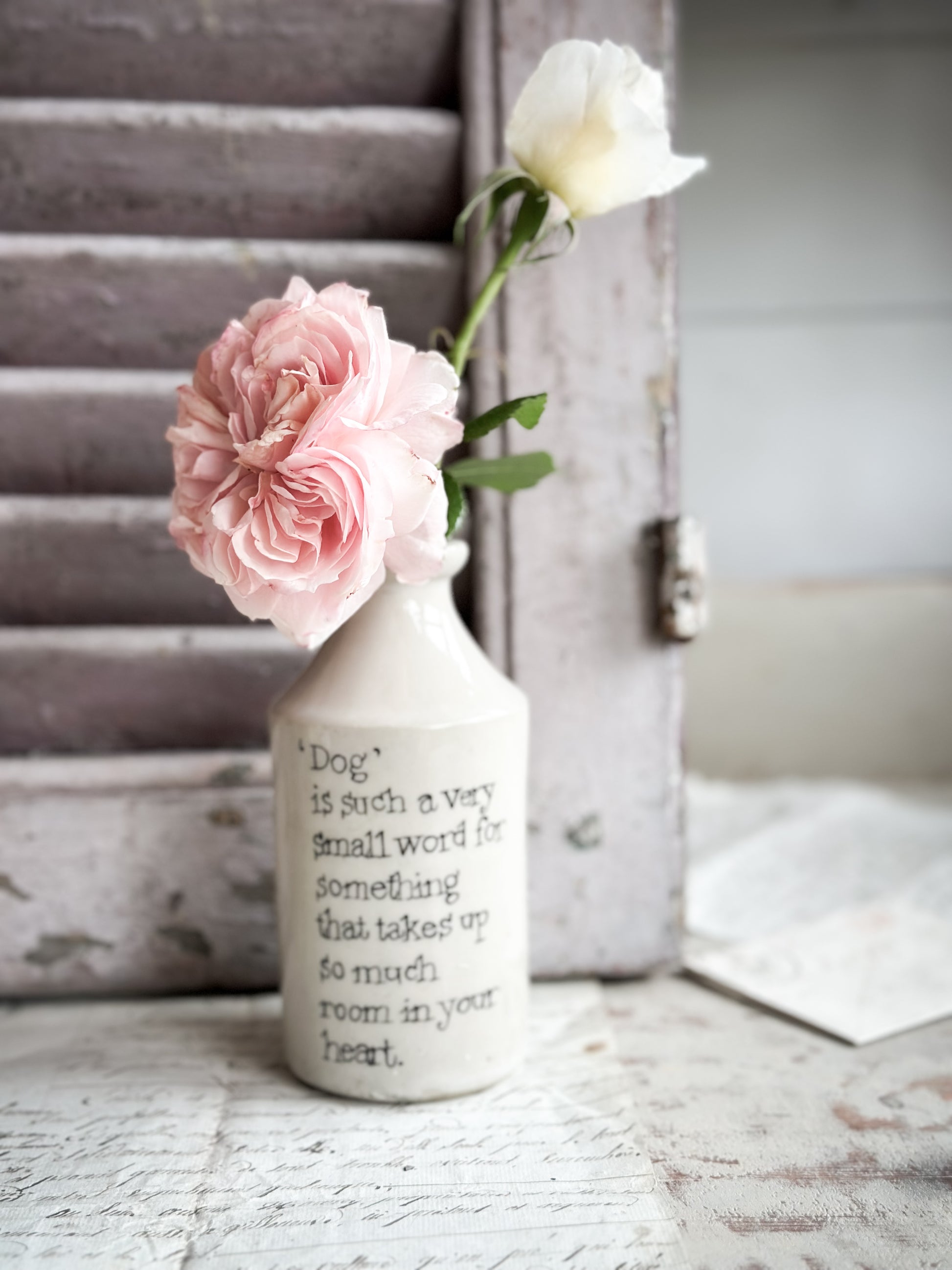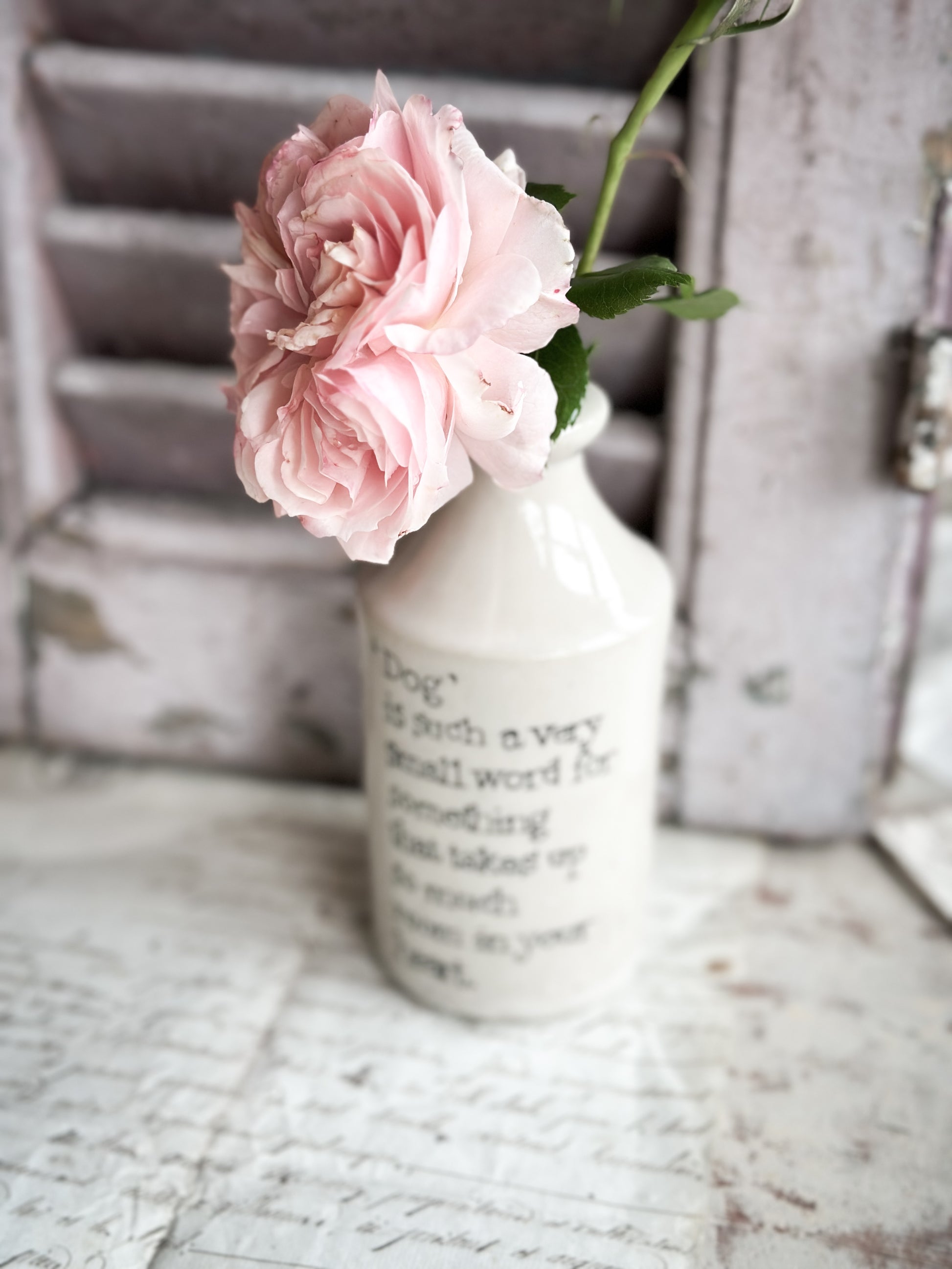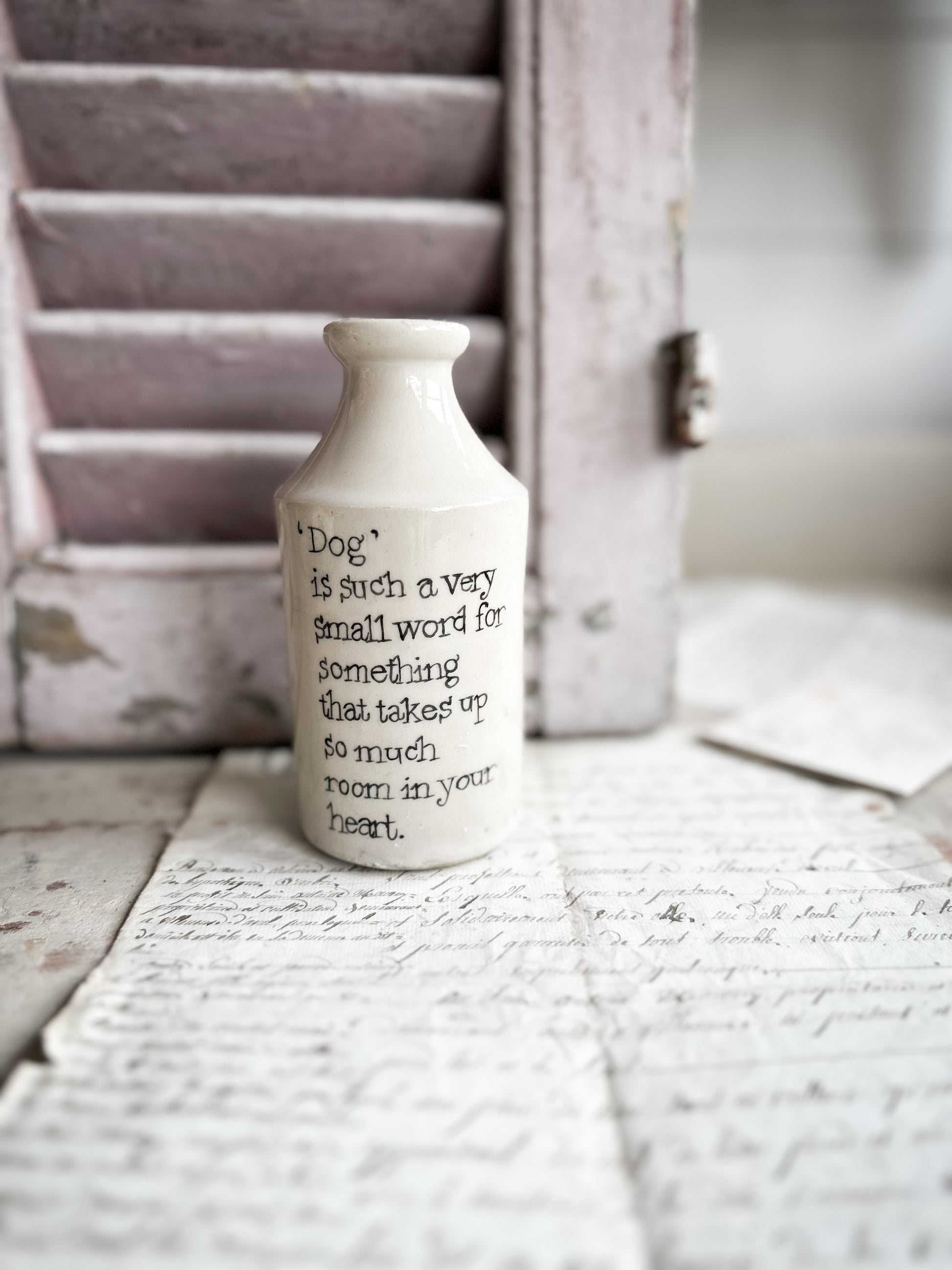 A Victorian unearthed stoneware pottery bottle with a hand painted quote.