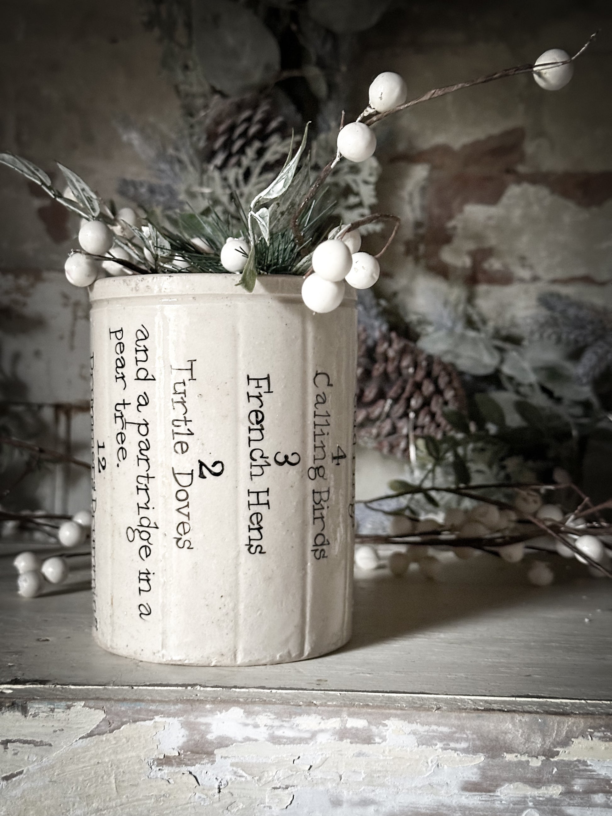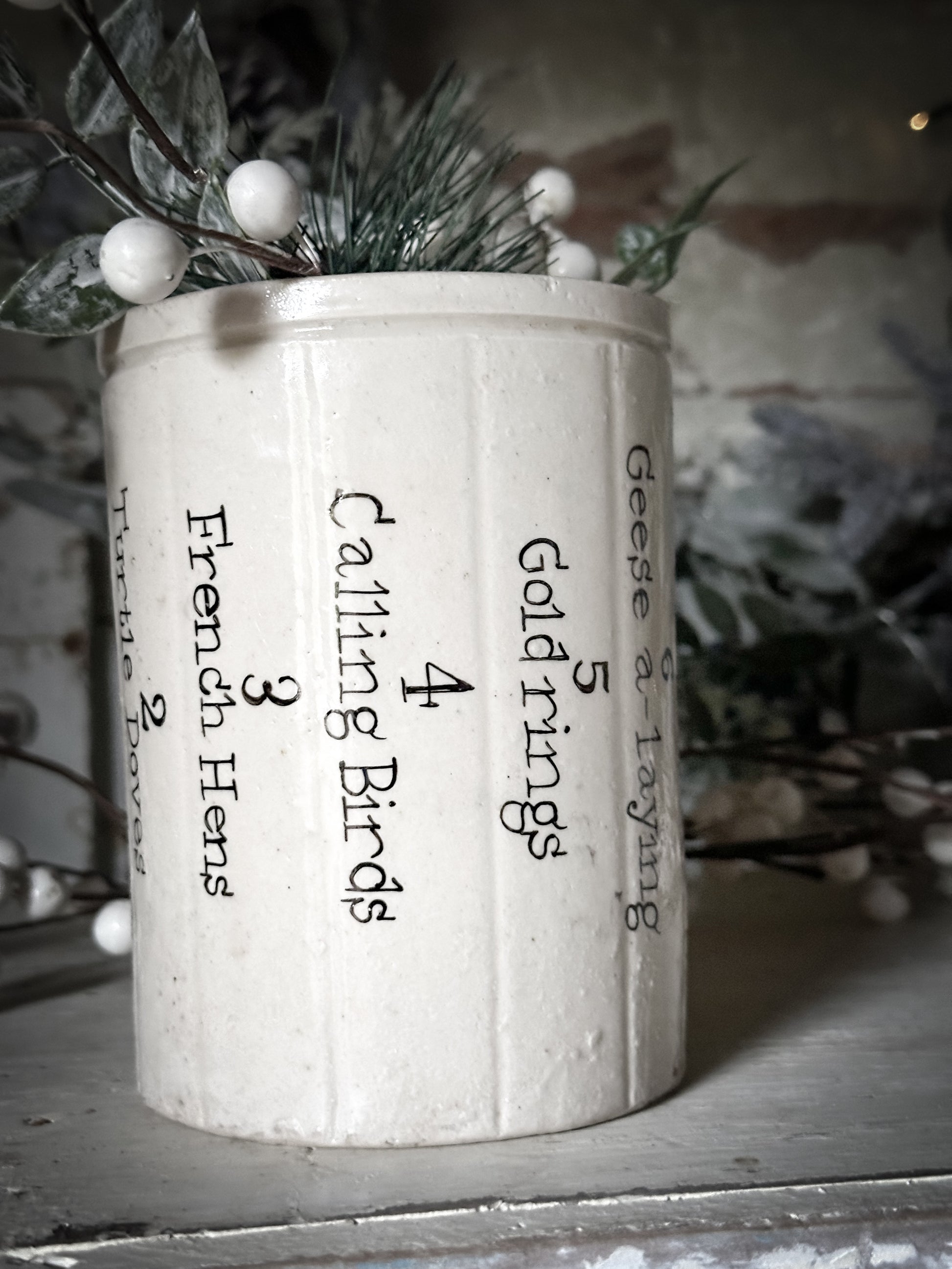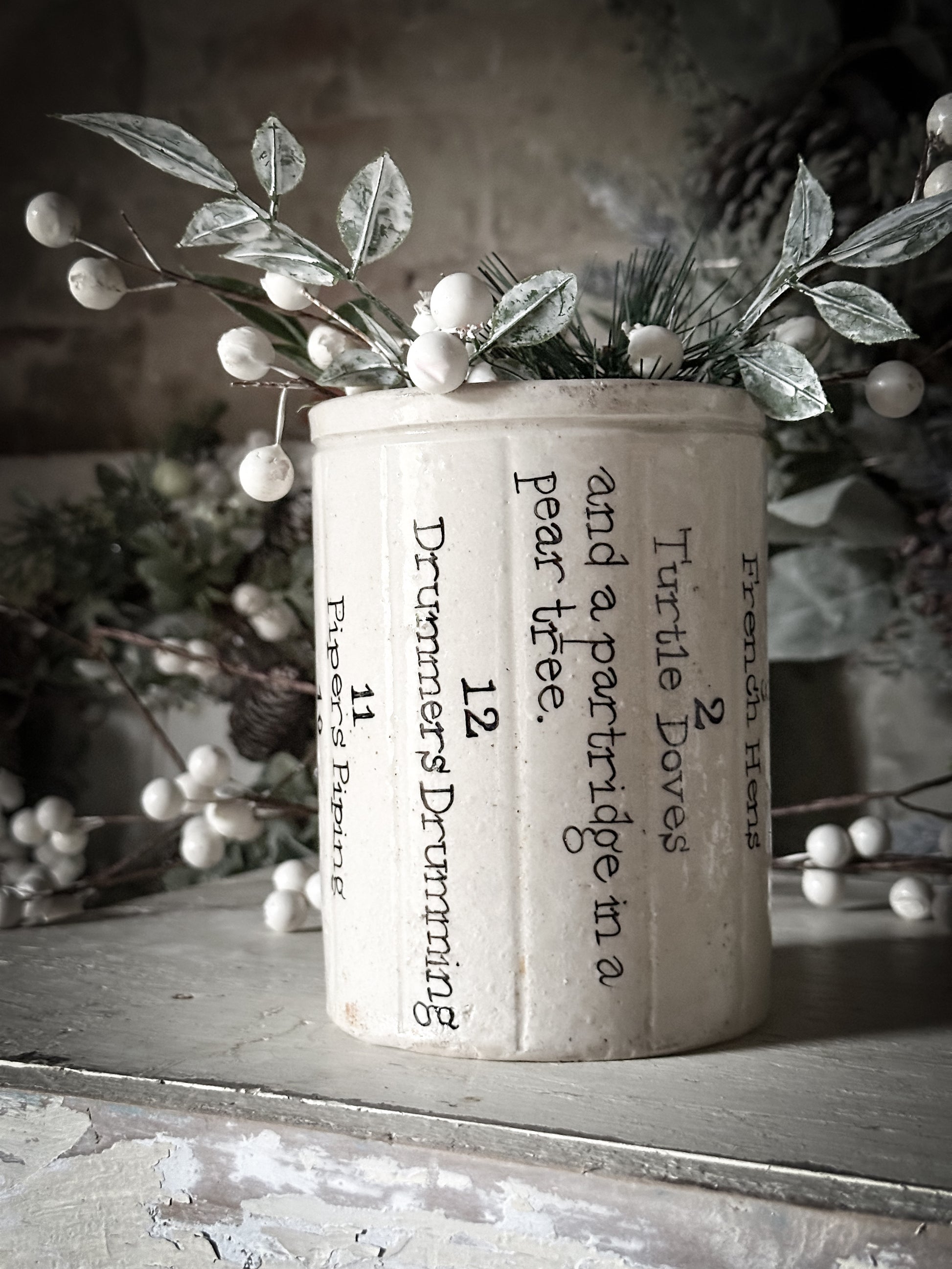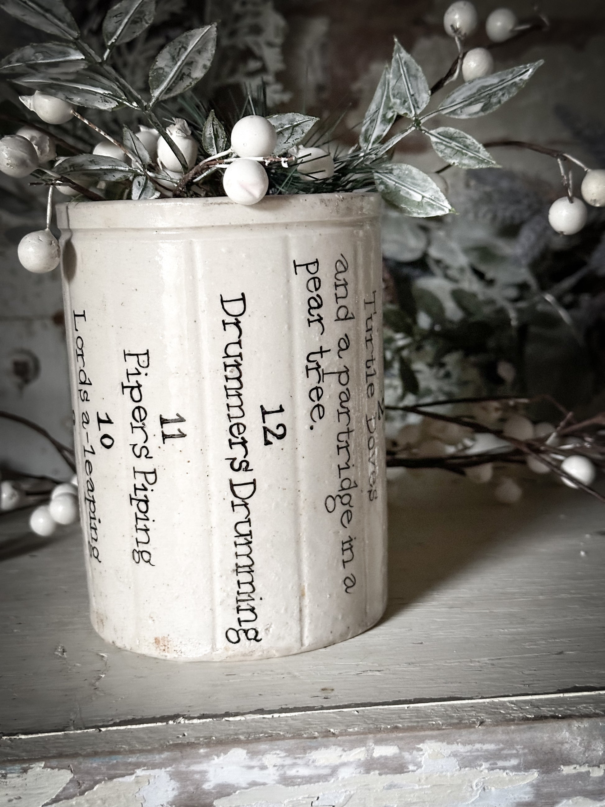 A tall Victorian unearthed stoneware pottery preserve jar with a hand painted quote
