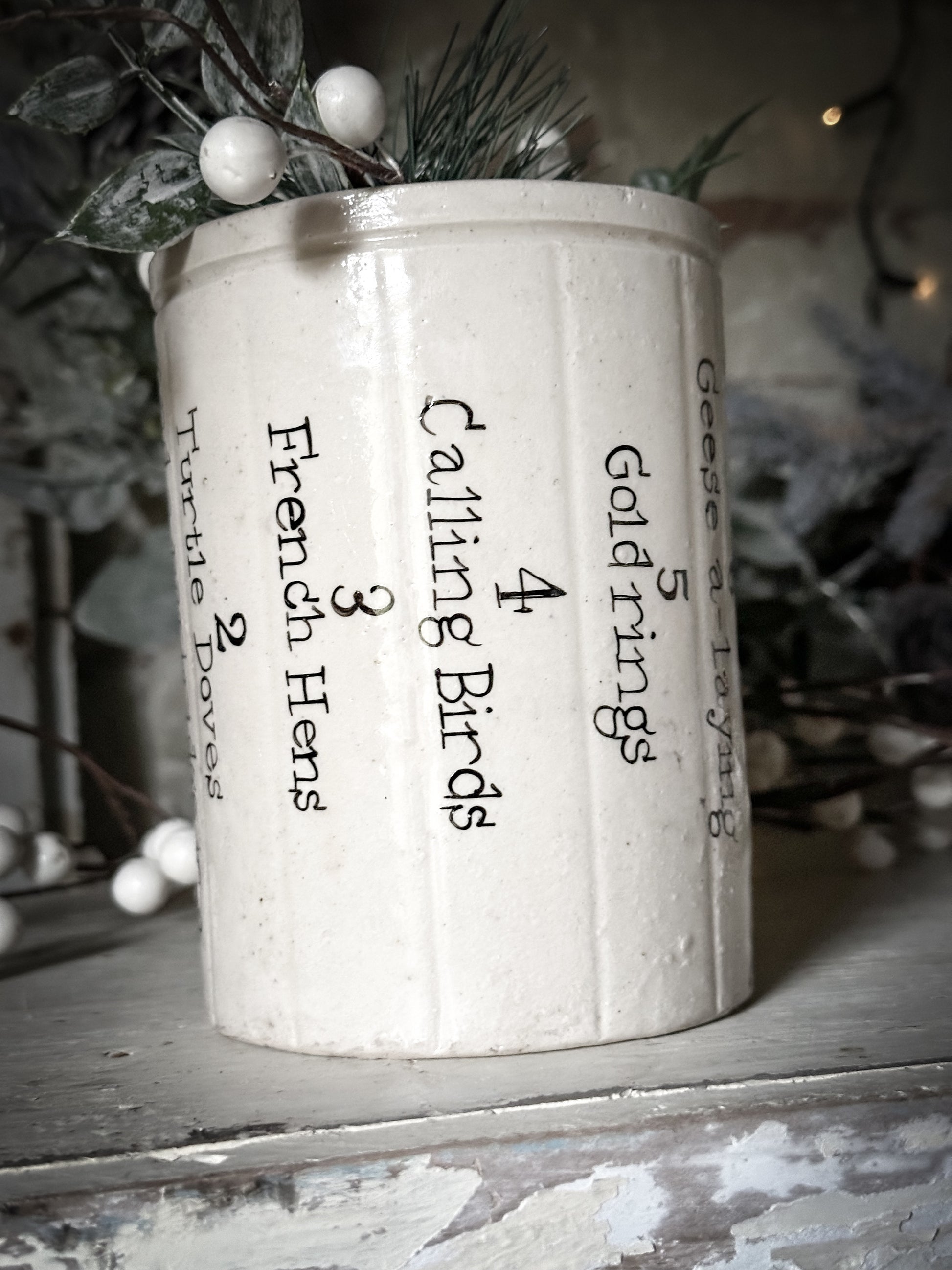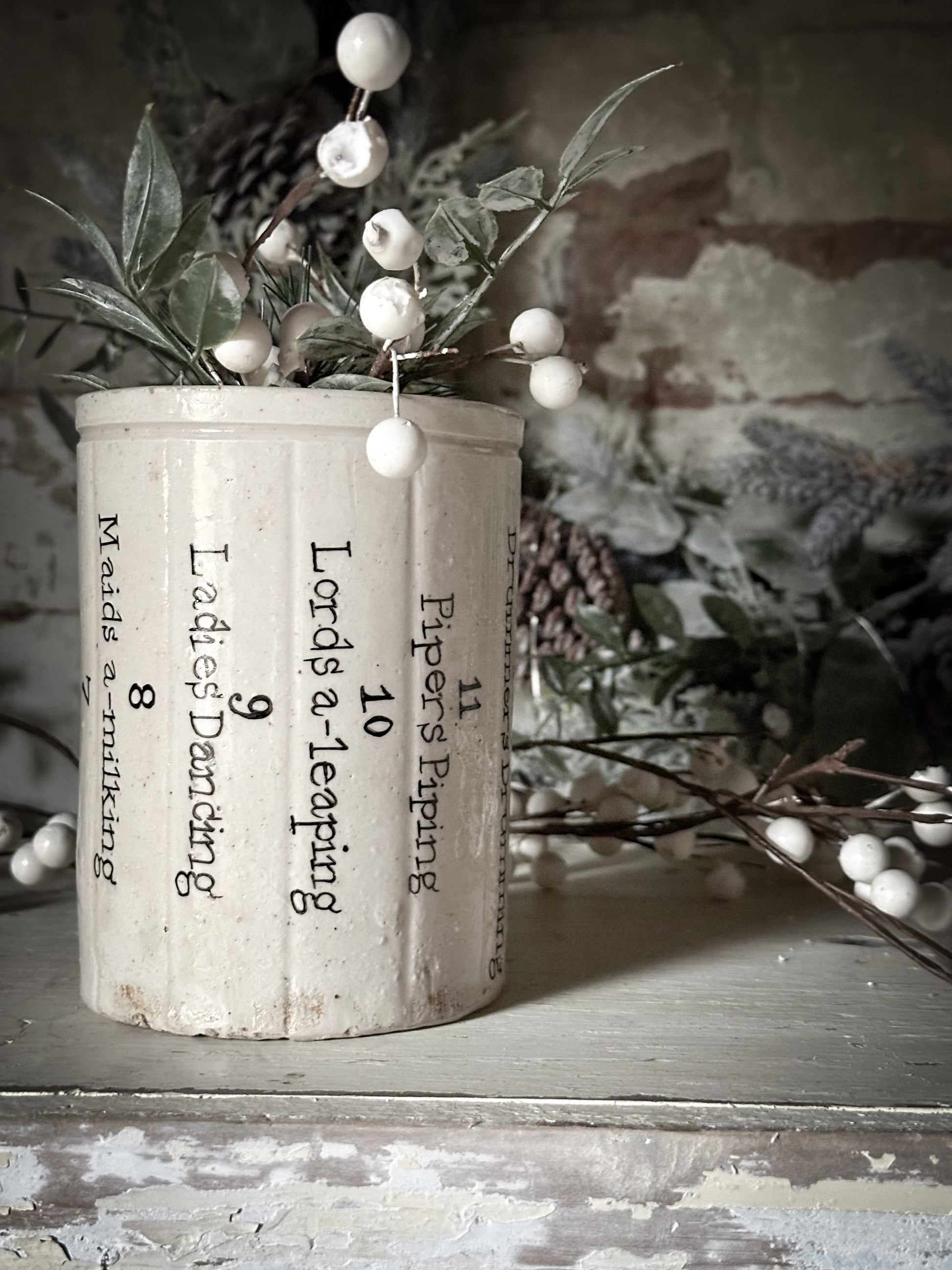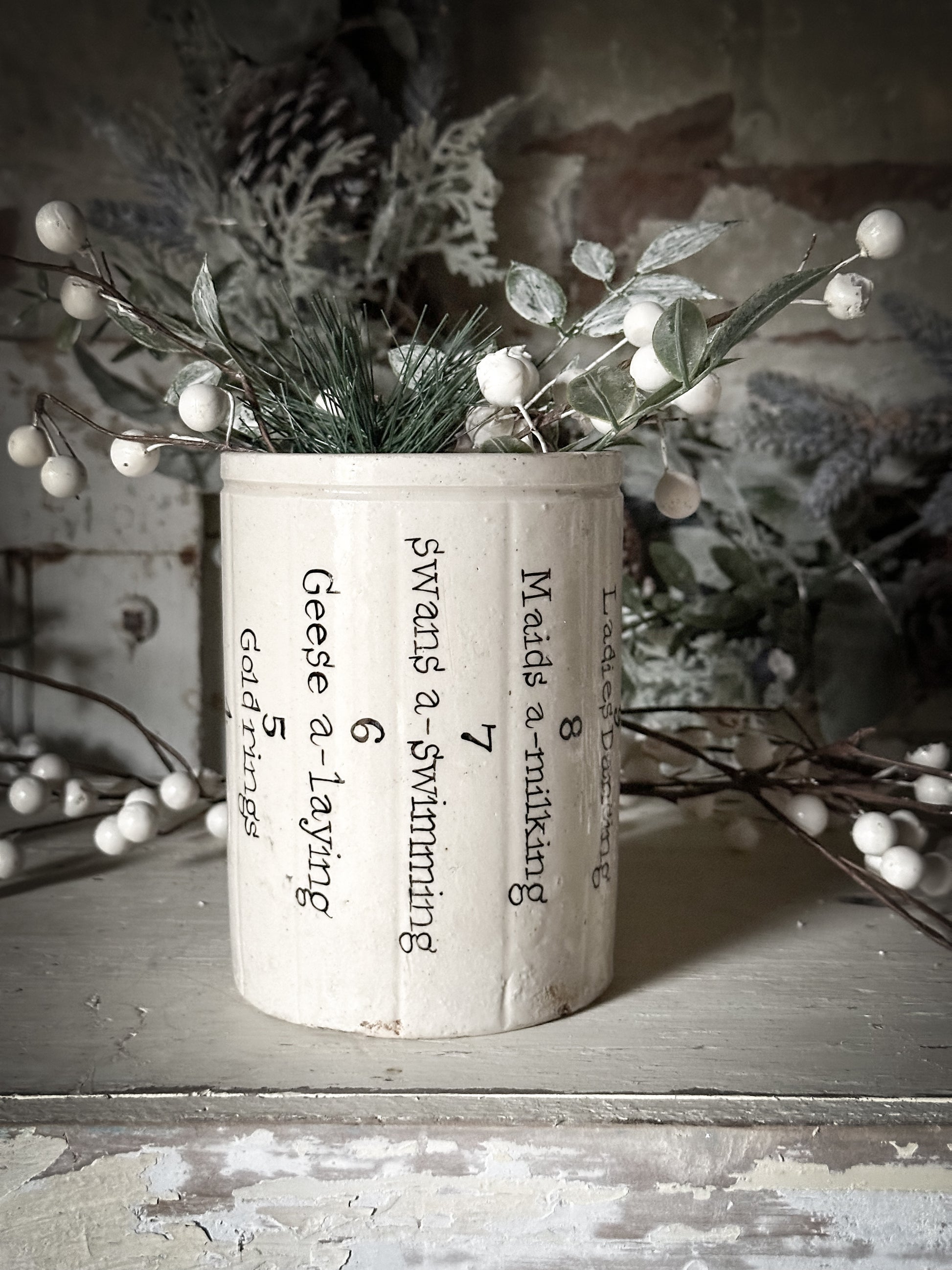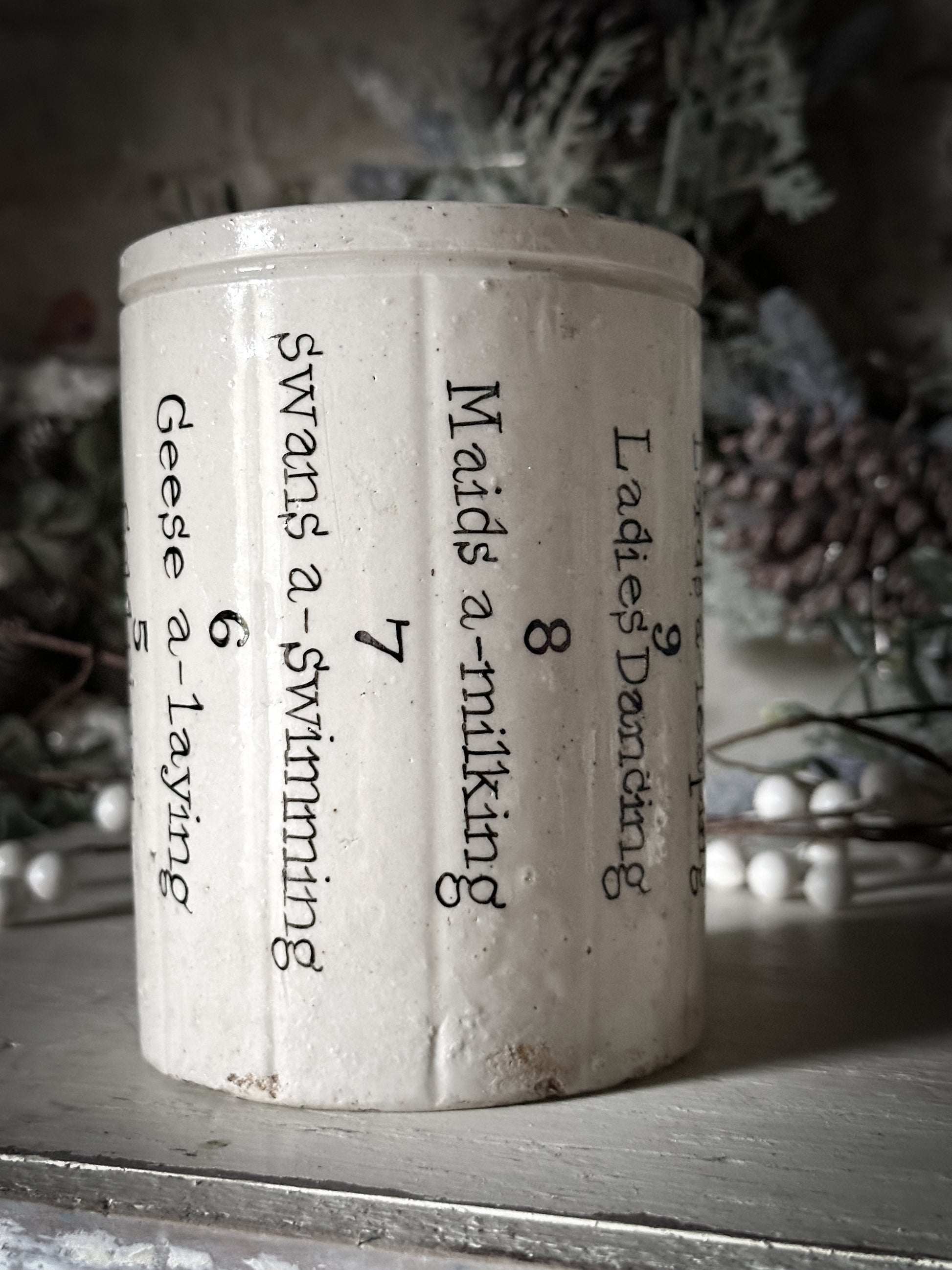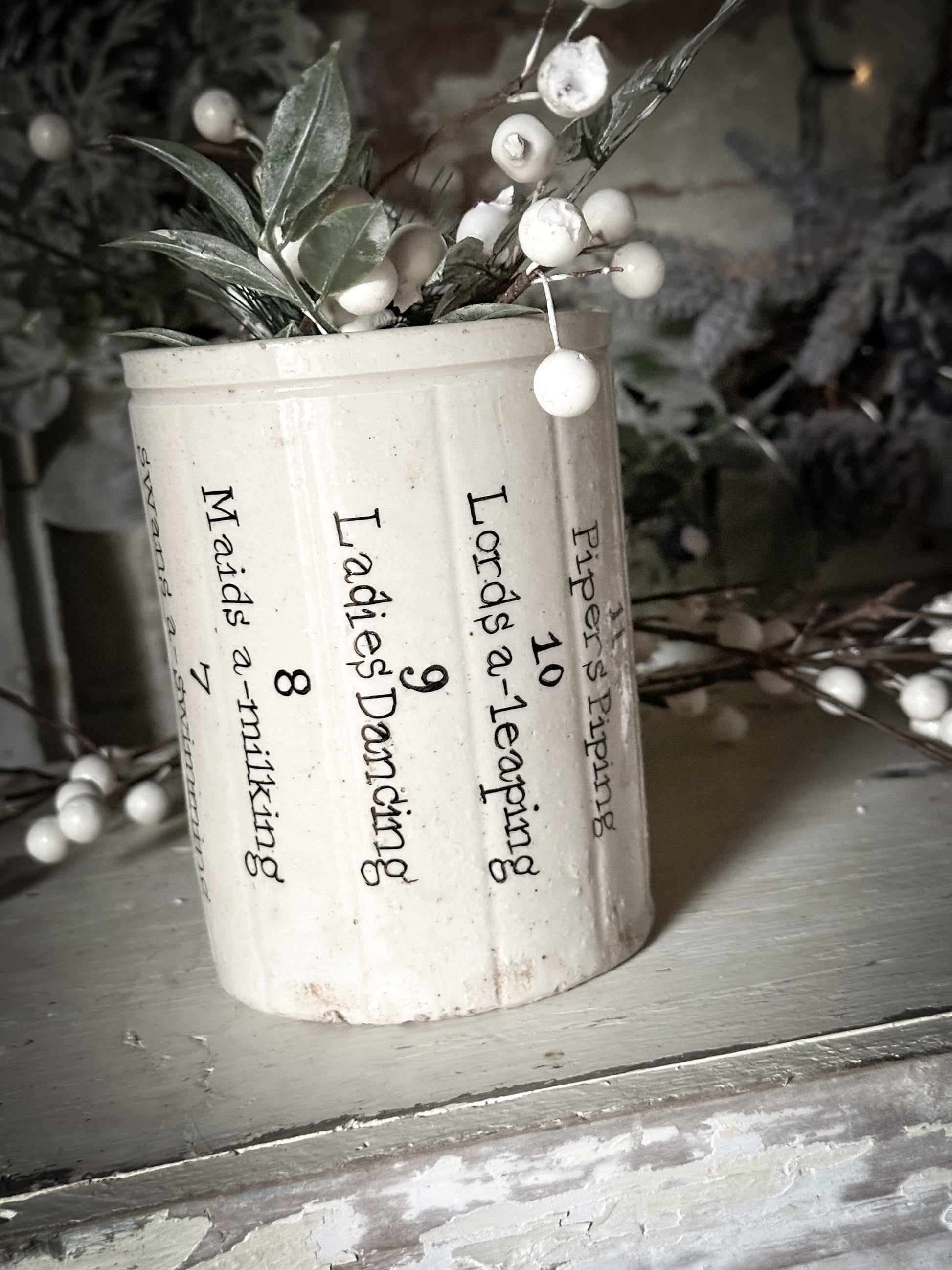 A tall Victorian unearthed stoneware pottery preserve jar with a hand painted quote