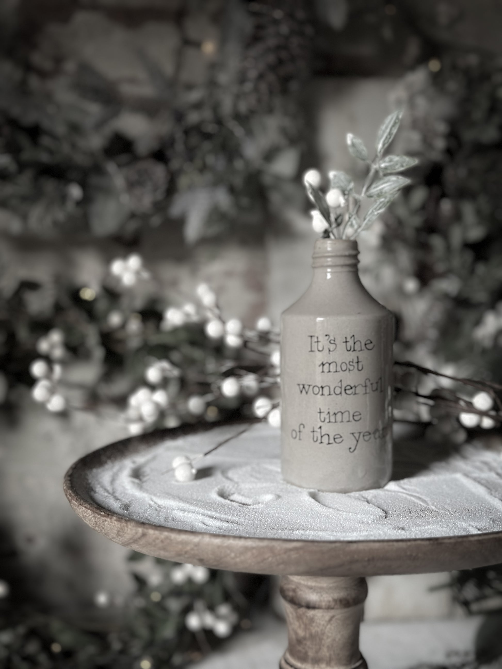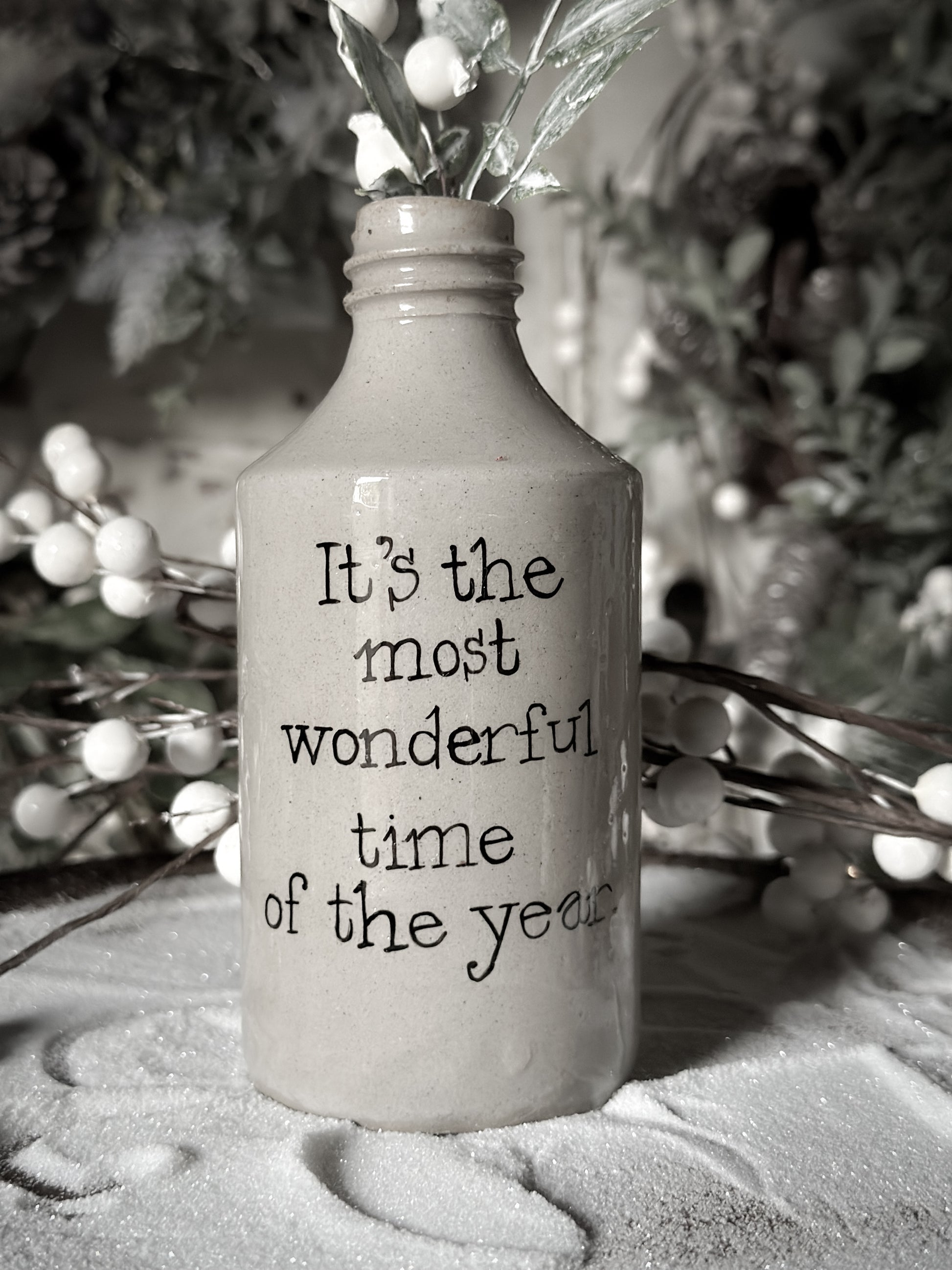 A Victorian unearthed stoneware pottery bottle with a hand painted quote.