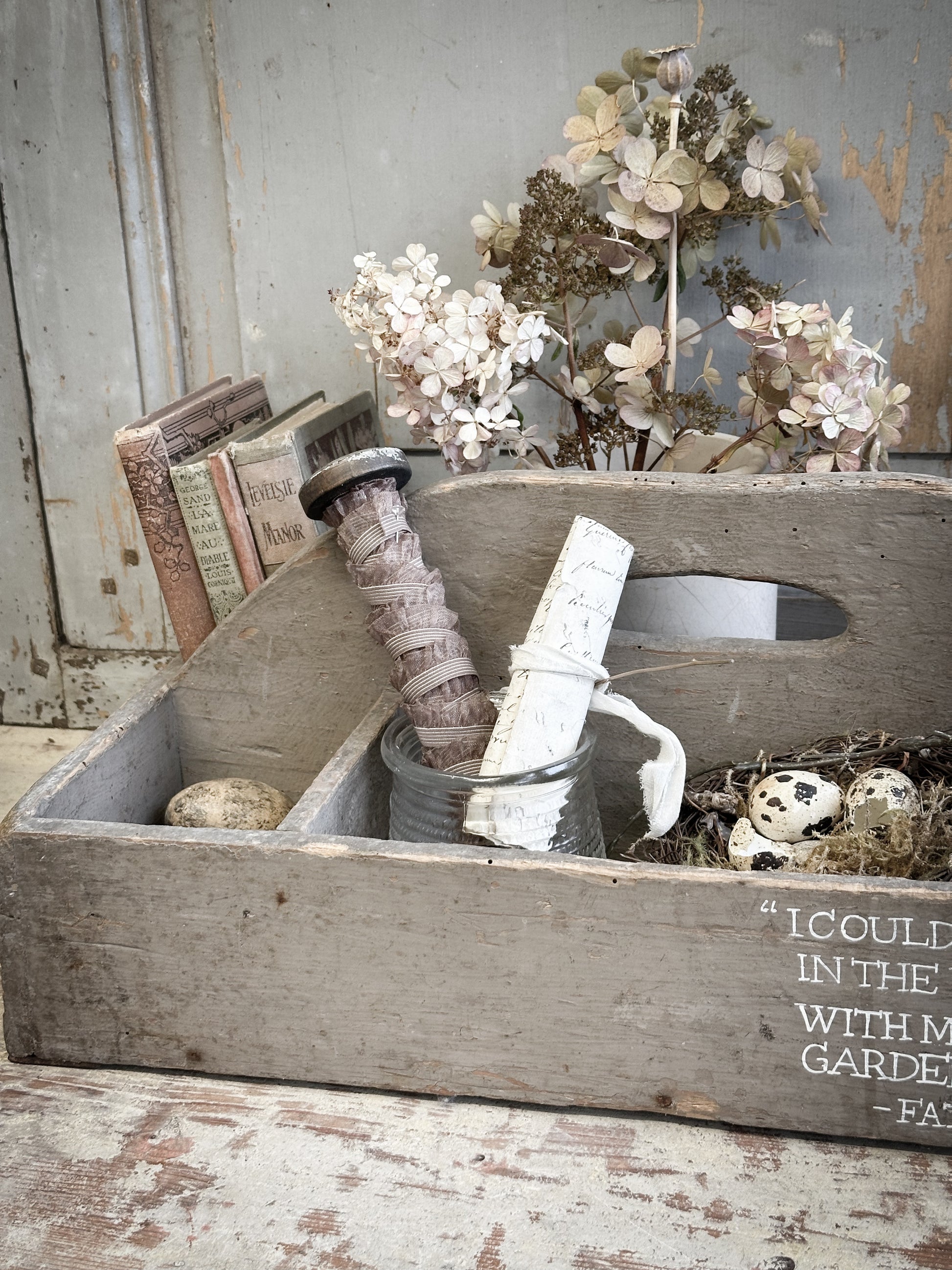 A pretty vintage French chippy paint wooden garden trug with a hand painted quote. Strong and sturdy with metal strapping to base.