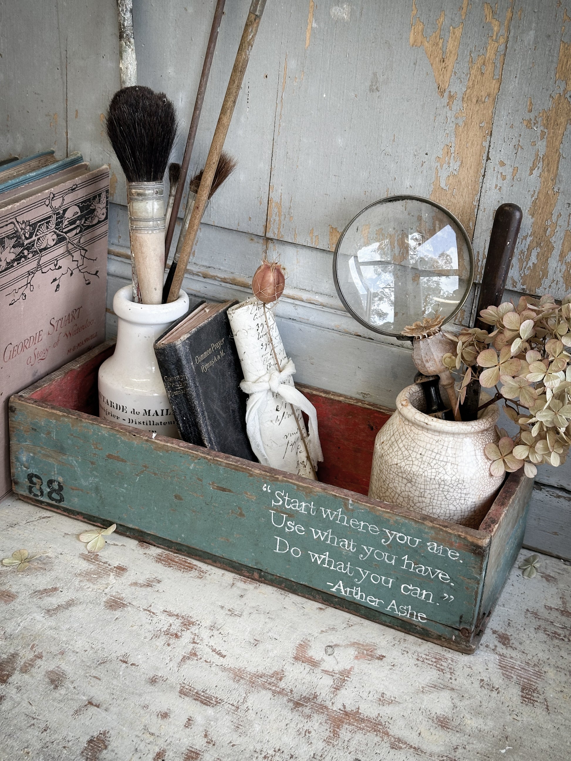 A pretty vintage French chippy paint wooden crate with a hand painted quote.