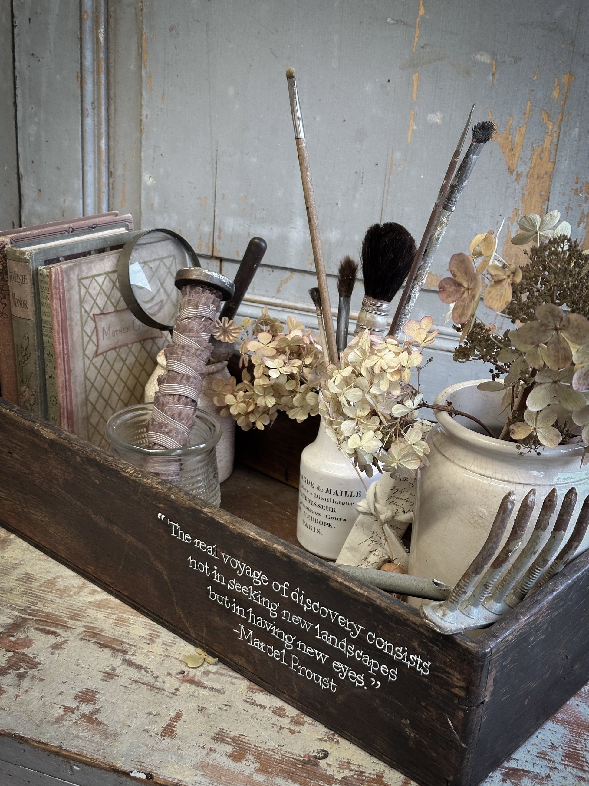 A Vintage Wooden Crate With Hand Painted Quote