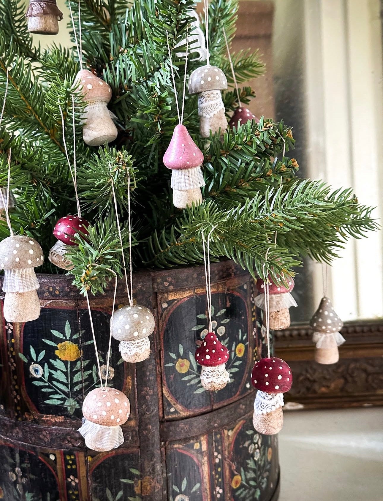 A wooden hand painted and trimmed Hanging Christmas tree toadstool