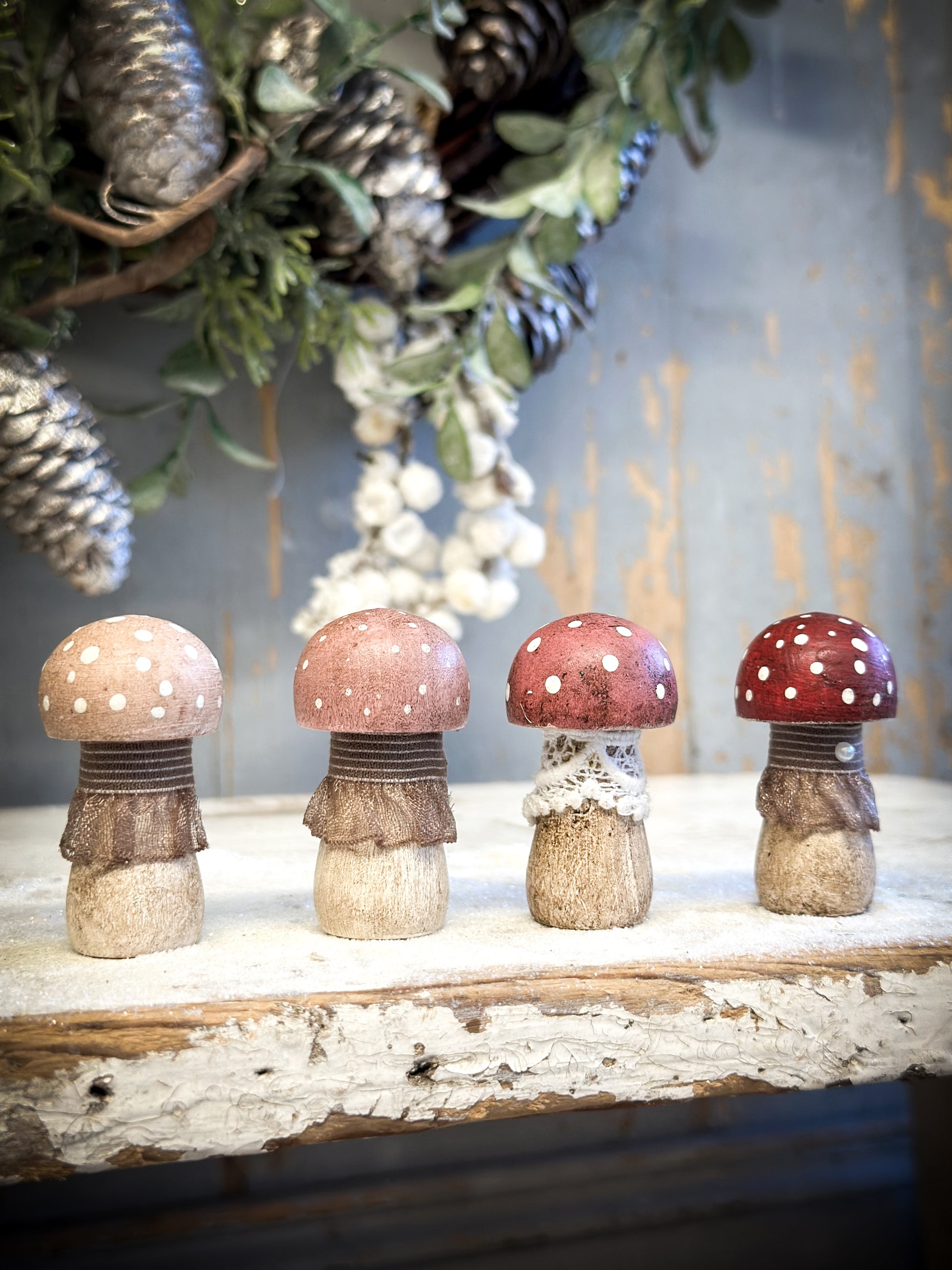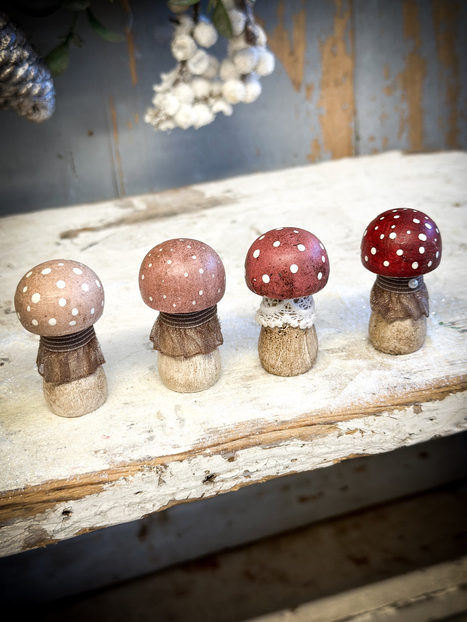 A wooden hand painted Christmas village toadstool.