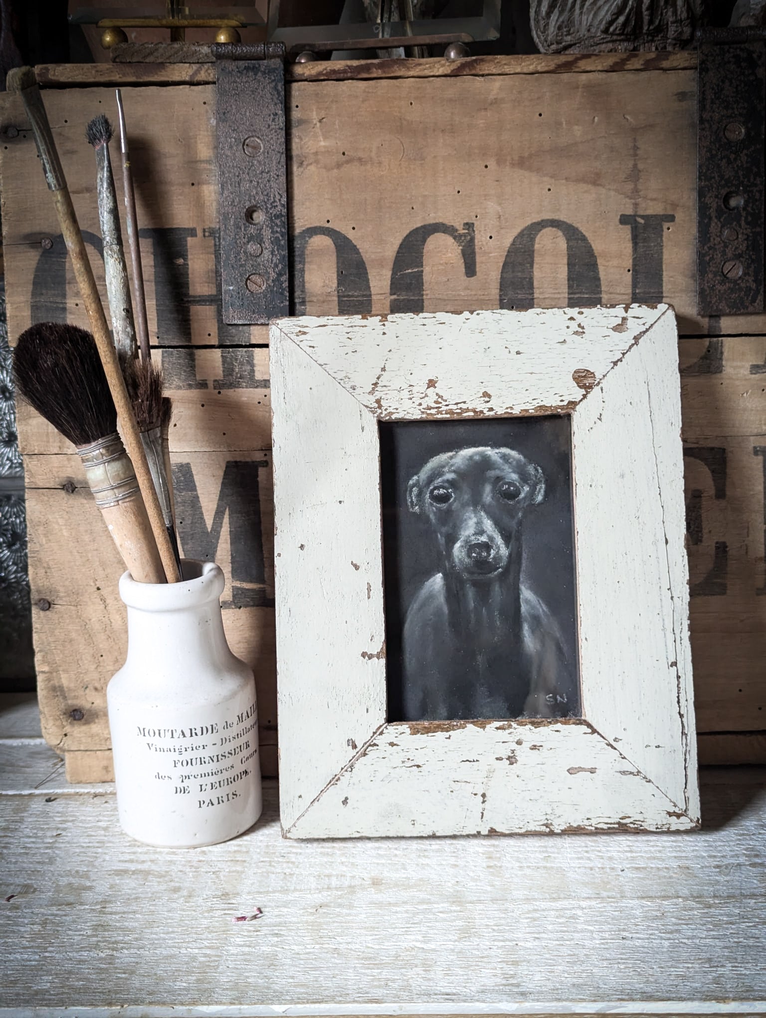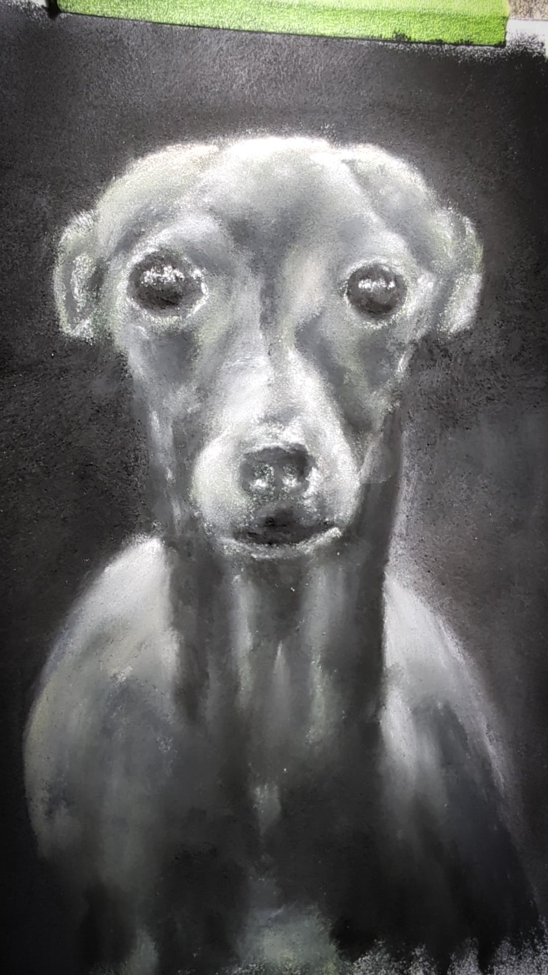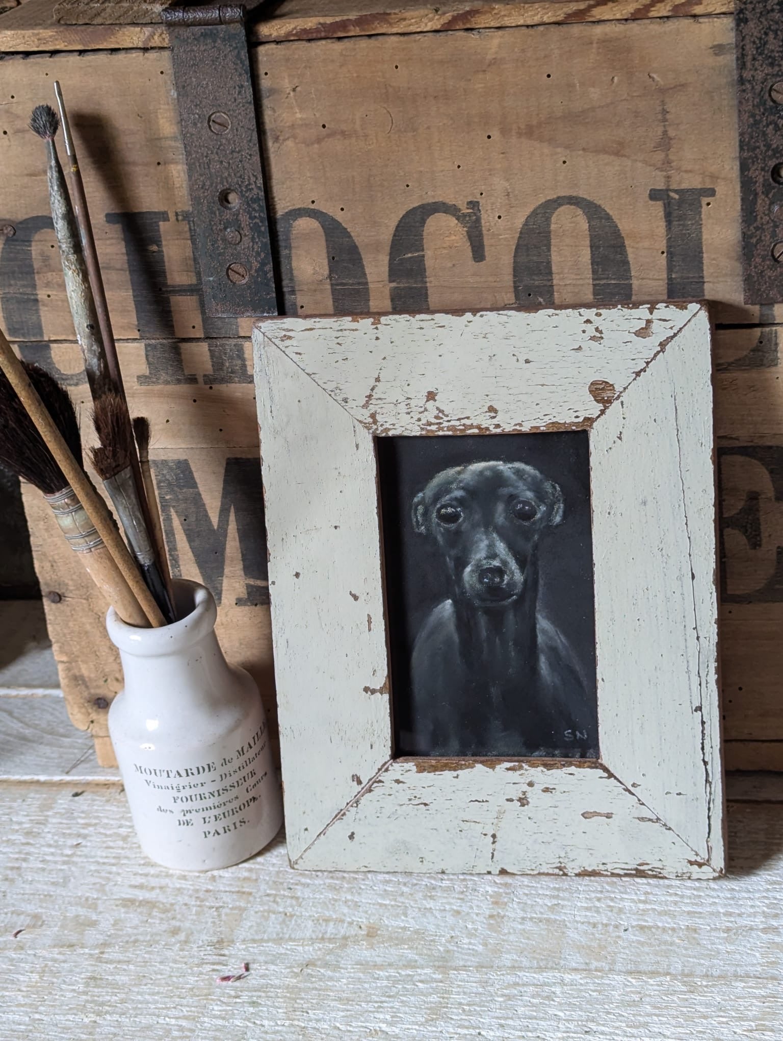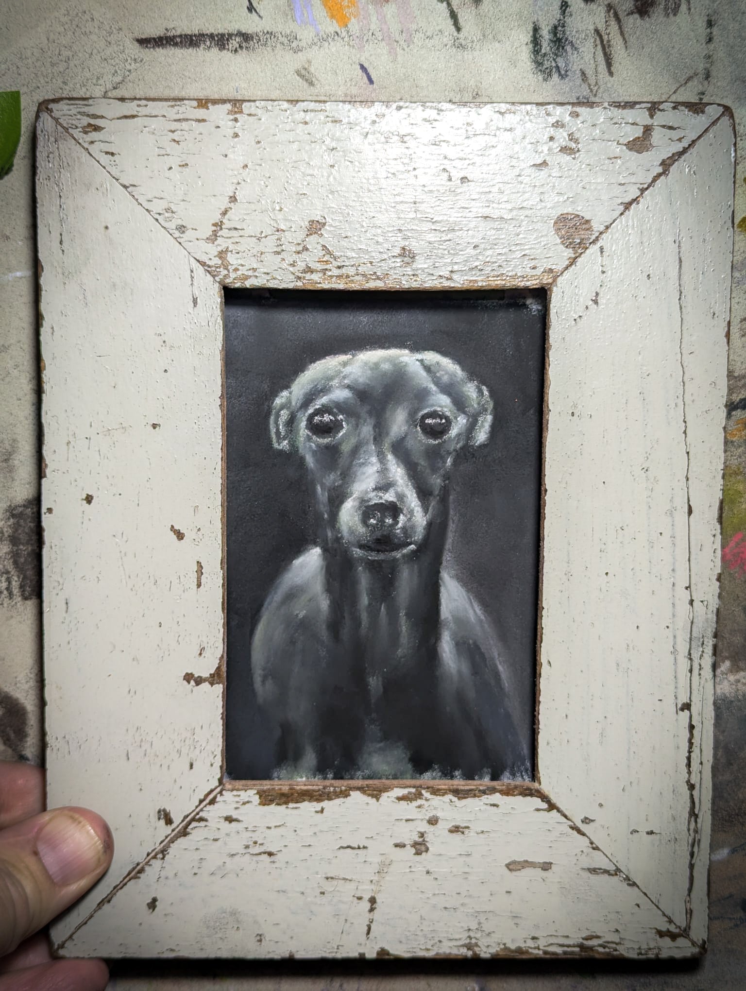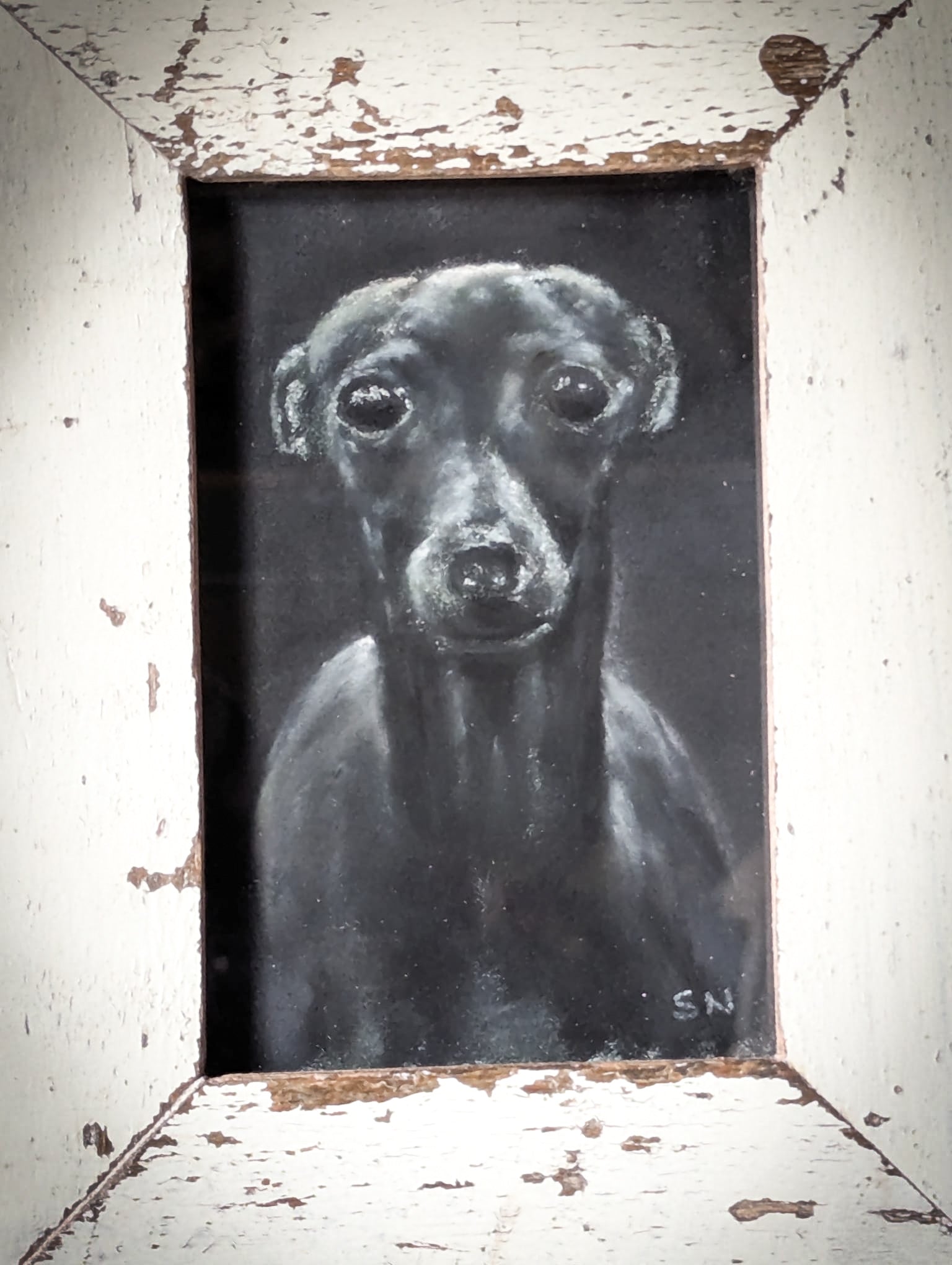 A framed original soft pastel artwork by Steven Nicholas. “Italian Greyhound”.