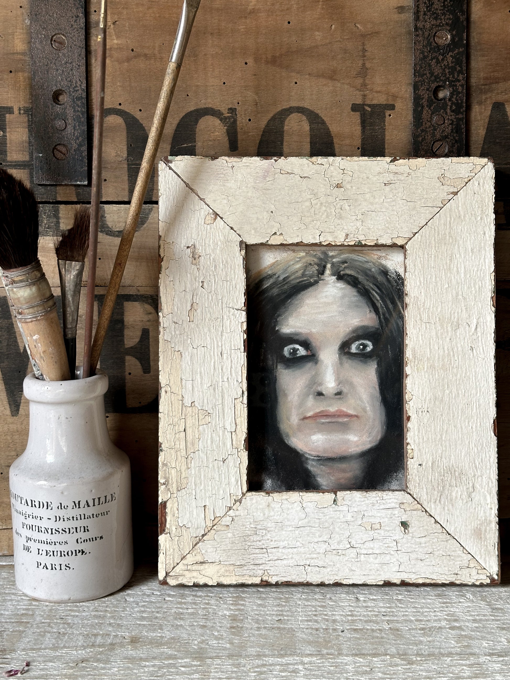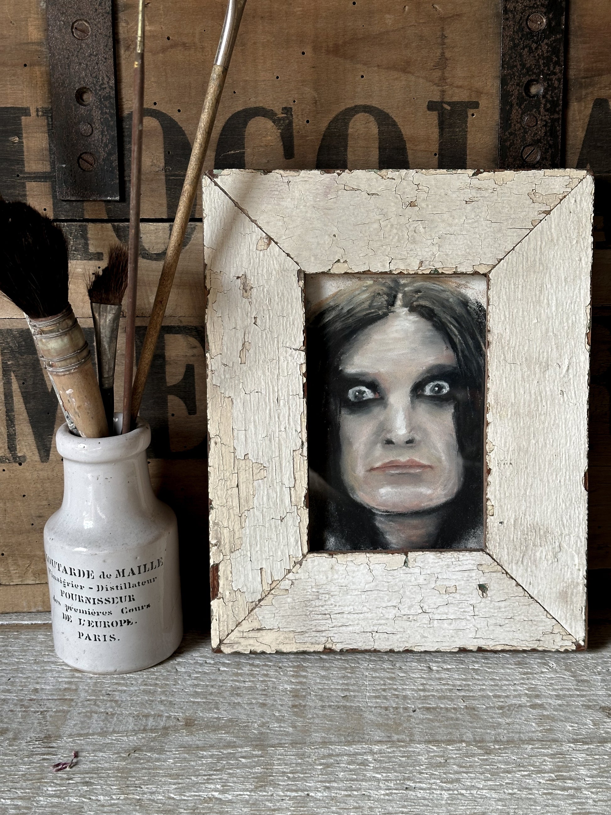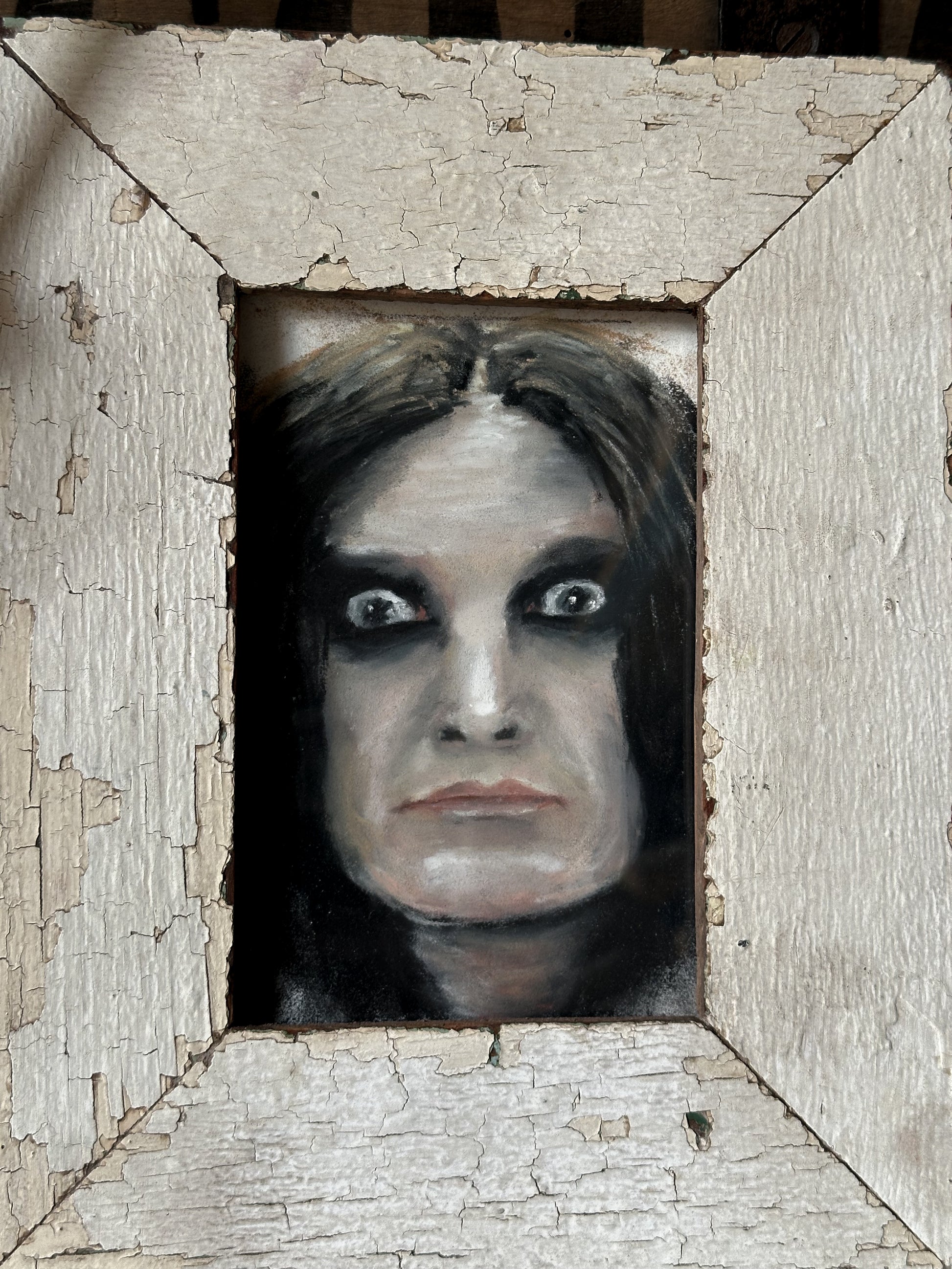 A framed original soft pastel artwork by Steven Nicholas. “Prince of Darkness”, a tribute to Ozzy Osbourne.