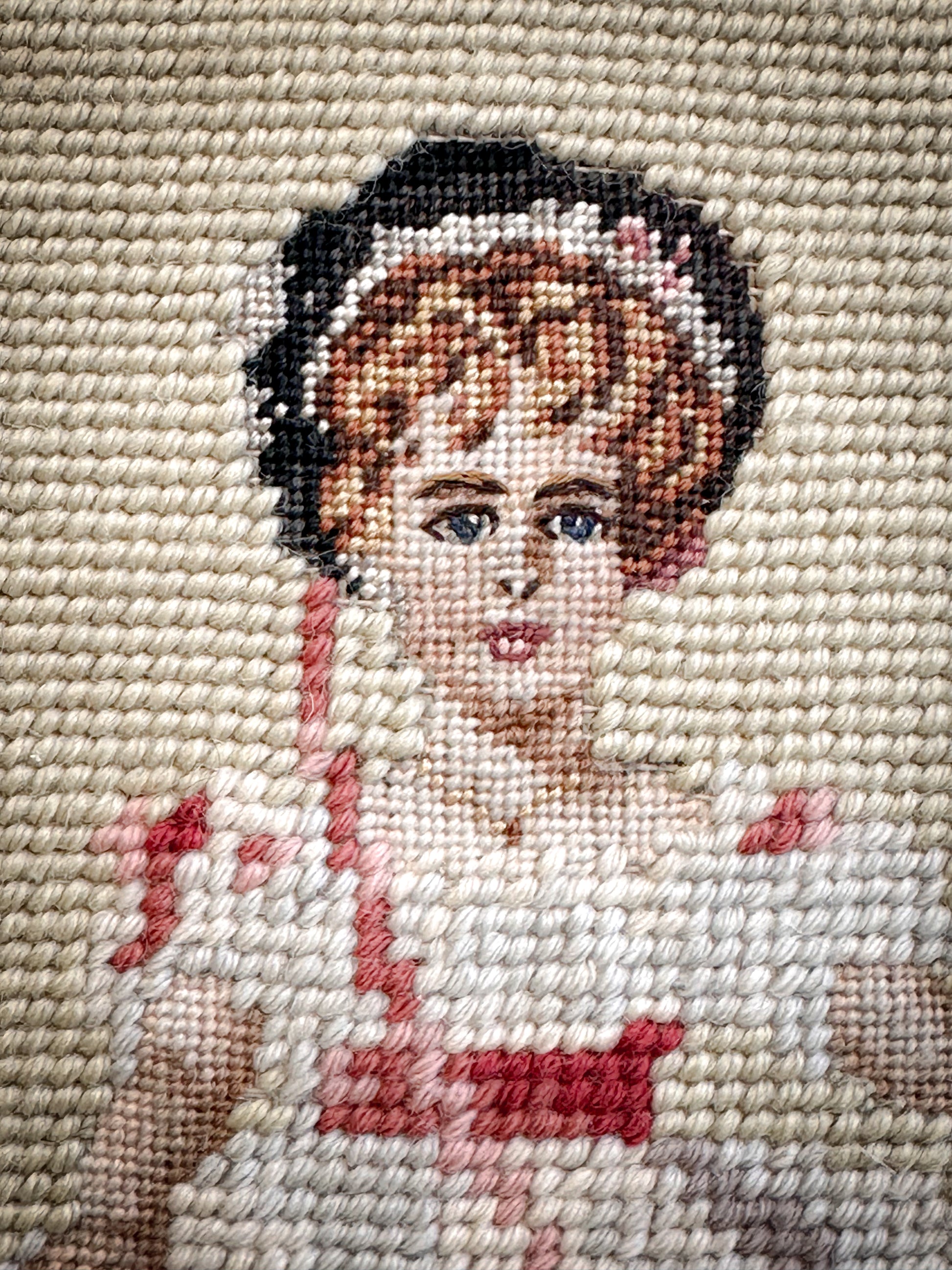 A charming antique needlepoint picture depicting a young girl in period dress, worked in soft, mellow tones on a neutral ground. The simple composition and gentle, naïve character are typical of late 19th to early 20th century domestic needlework.